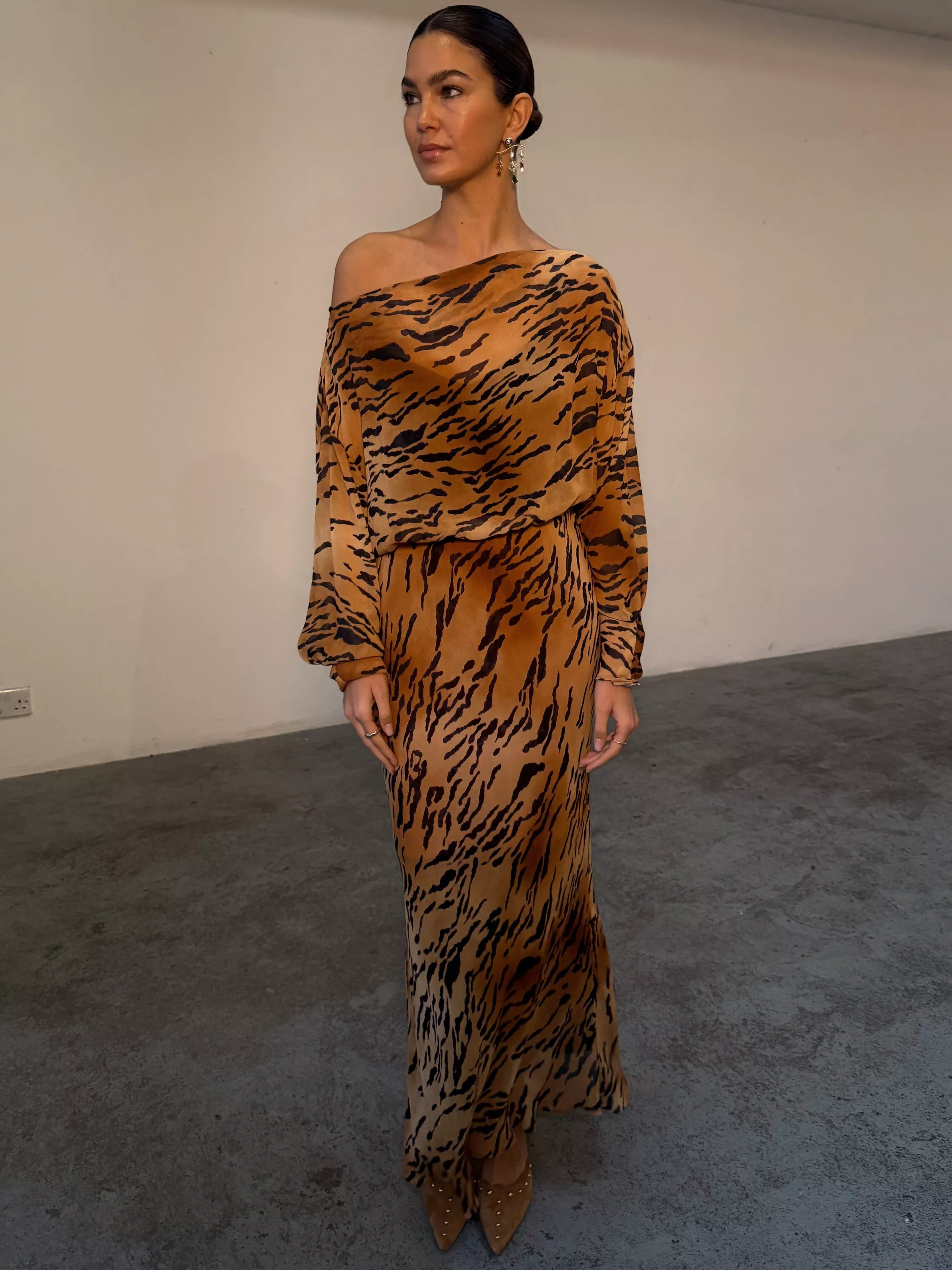 The iconic Tilly dress in a new animal print! The bold tiger print paired with the relaxed off-the-shoulder silhouette makes this dress super wearable, whether you're strolling along the coast or dressing up for an evening out with the girls. The elasticated cuffs also allow you to adjust for your comfort.