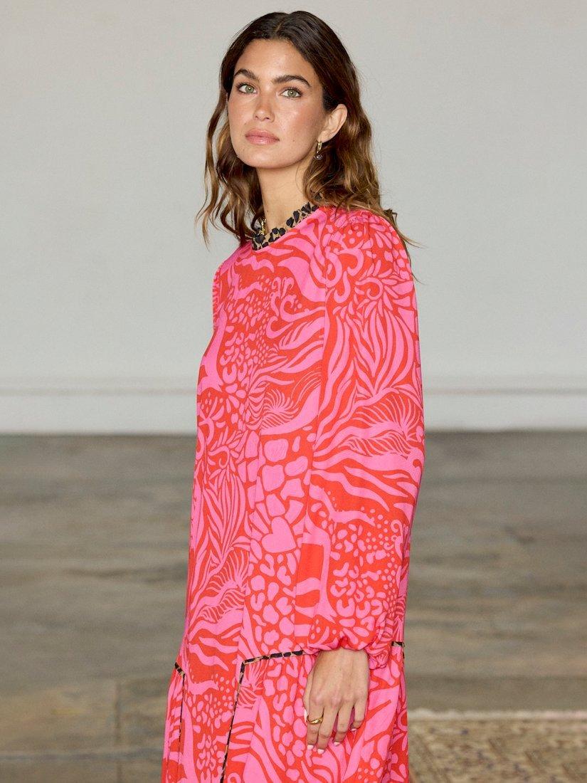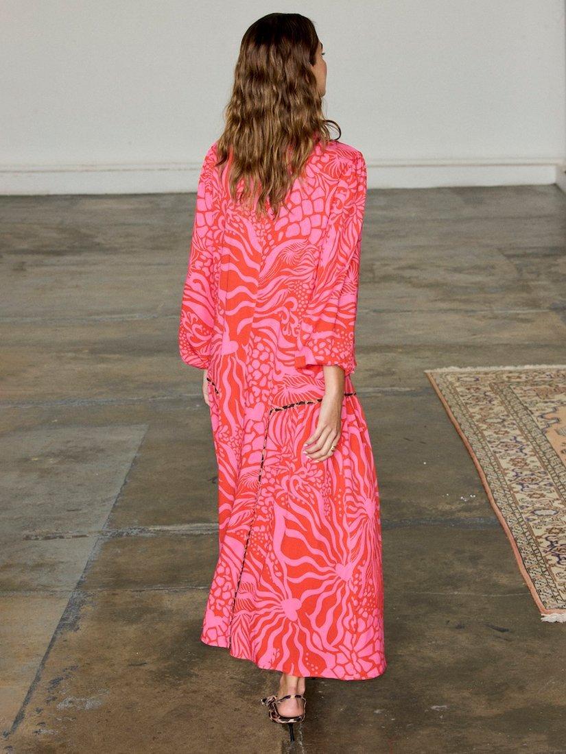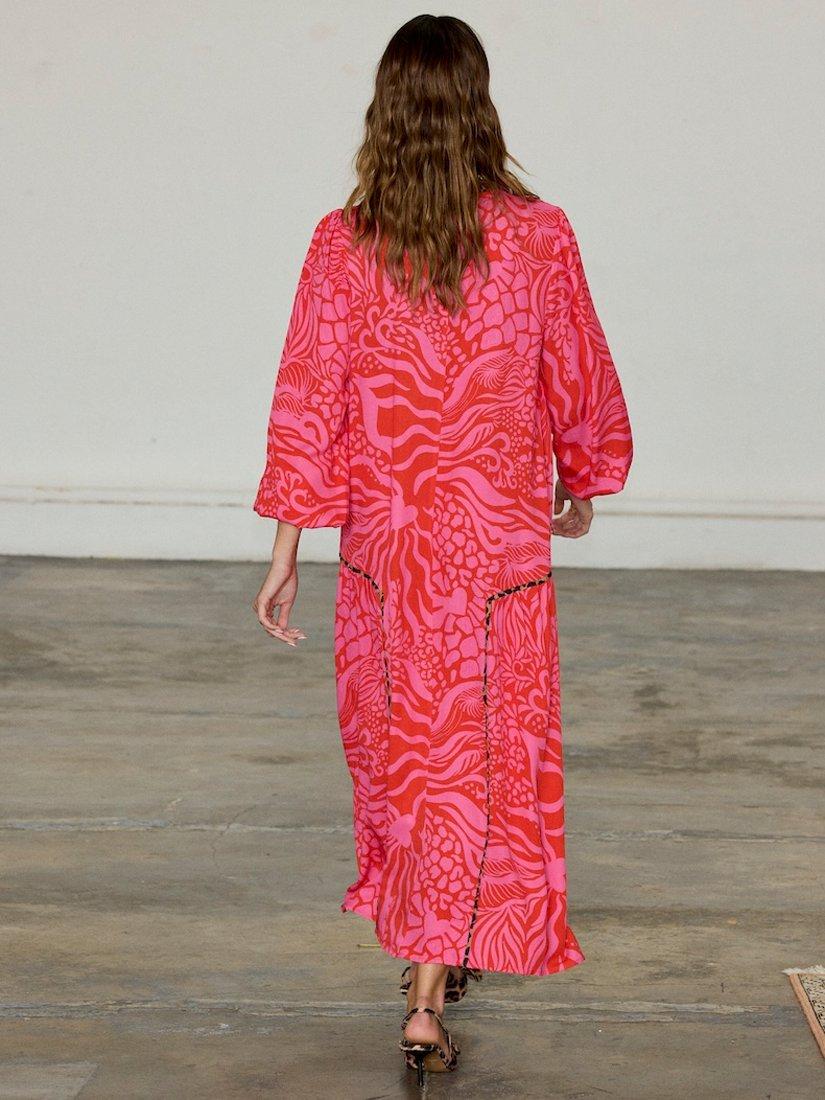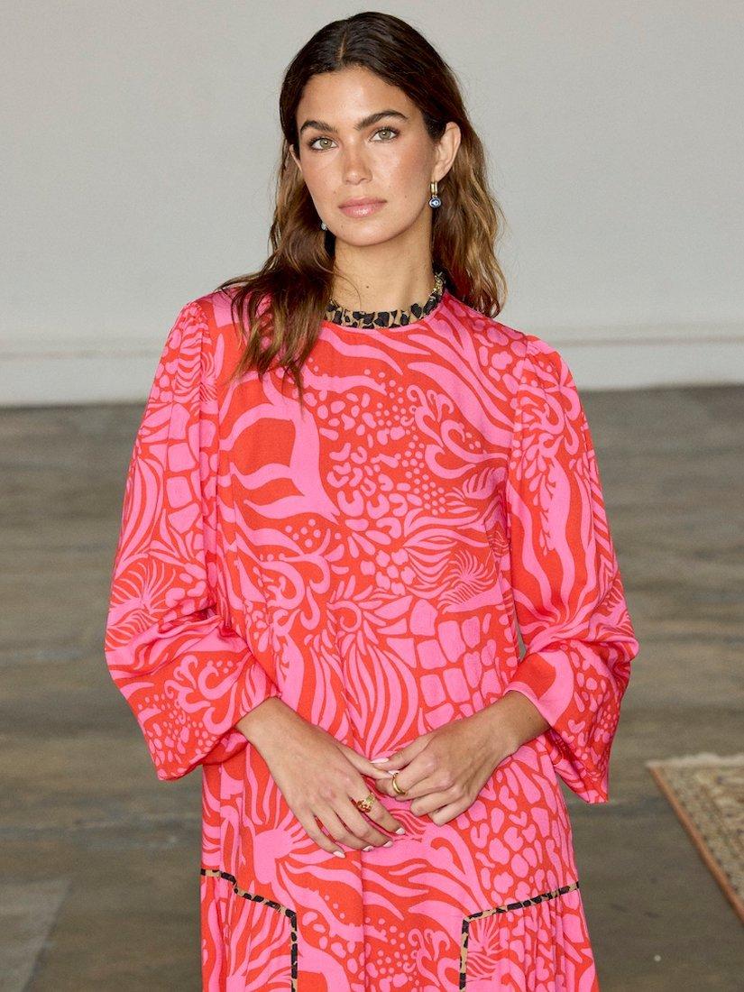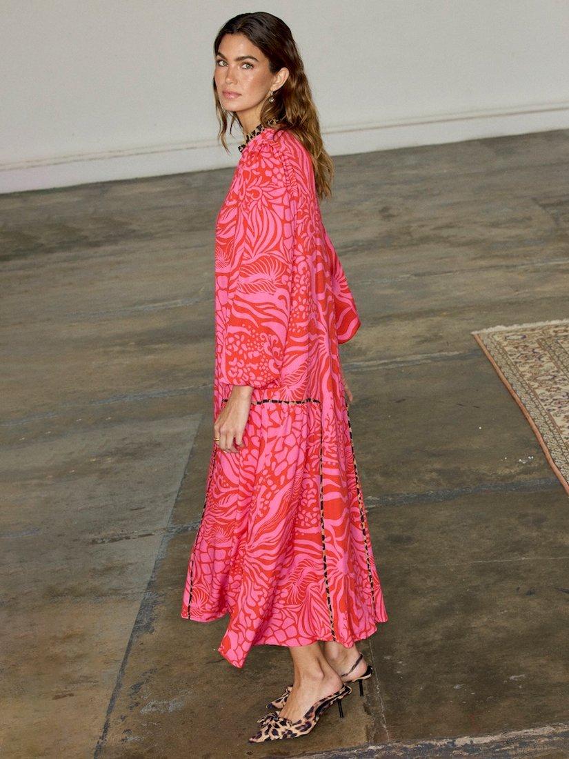 Designed in a simple but stunning loose straight shape, this floor-length dress from Never Fully Dressed is dreamt up from whisper-weight viscose. With a crew neck and long wide sleeves, it receives a vibrant update with the help of an abstract print with a leopard print trim.