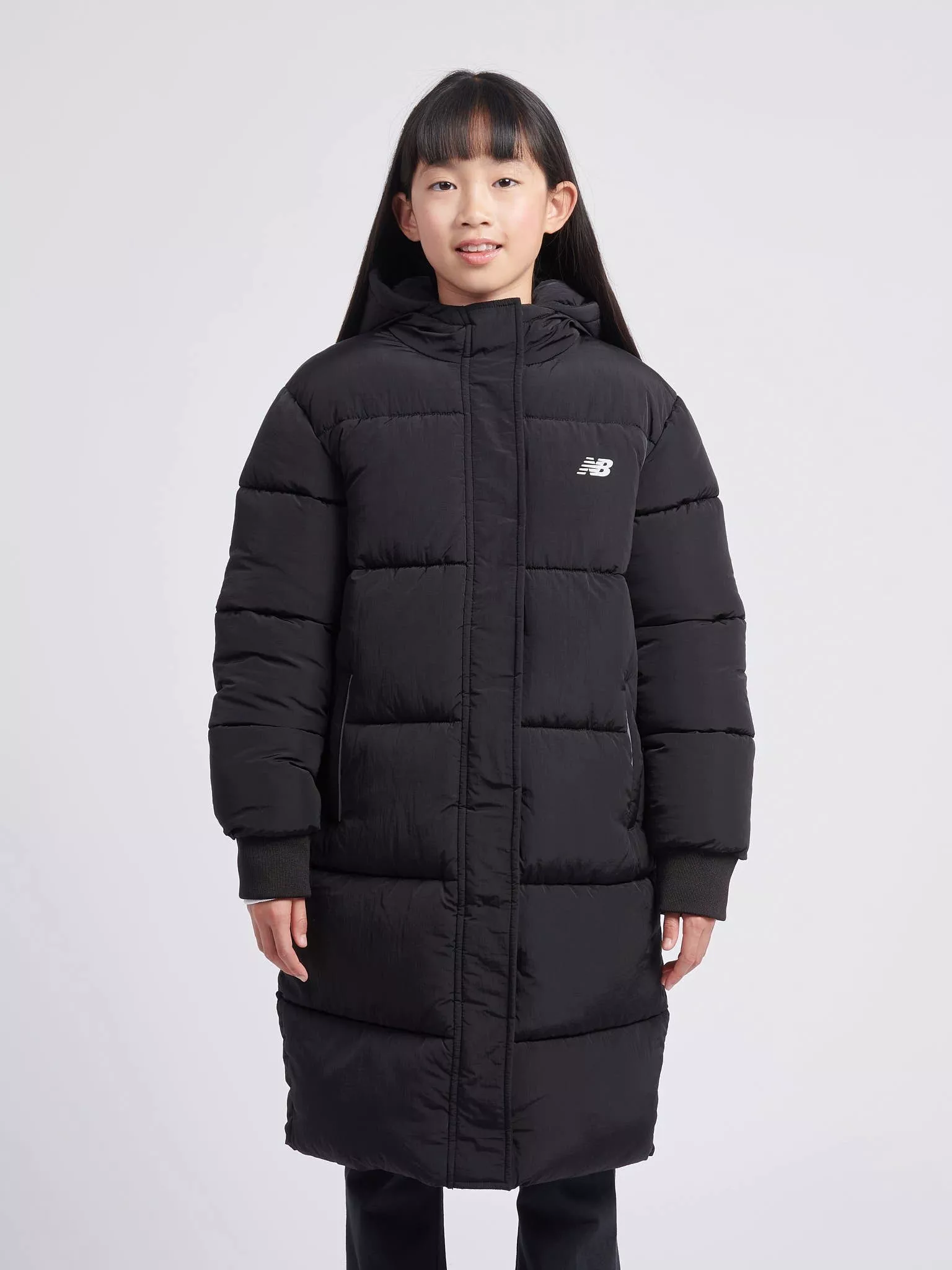 Keeping them warm and cosy when out and about, this longline puffer coat from New Balance is topped with a hood, long sleeves with elasticated ribbed cuffs, pockets and a zip through the front.