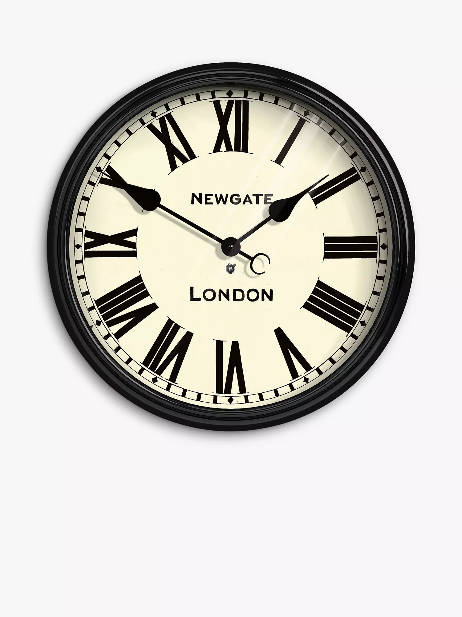 Newgate's Battersby clock features a painted black metal body and contrasting cream face under a glass lens. The spade style hands, Roman numeral hour markers and minute track around the face combine for a distinctive, sophisticated look.
