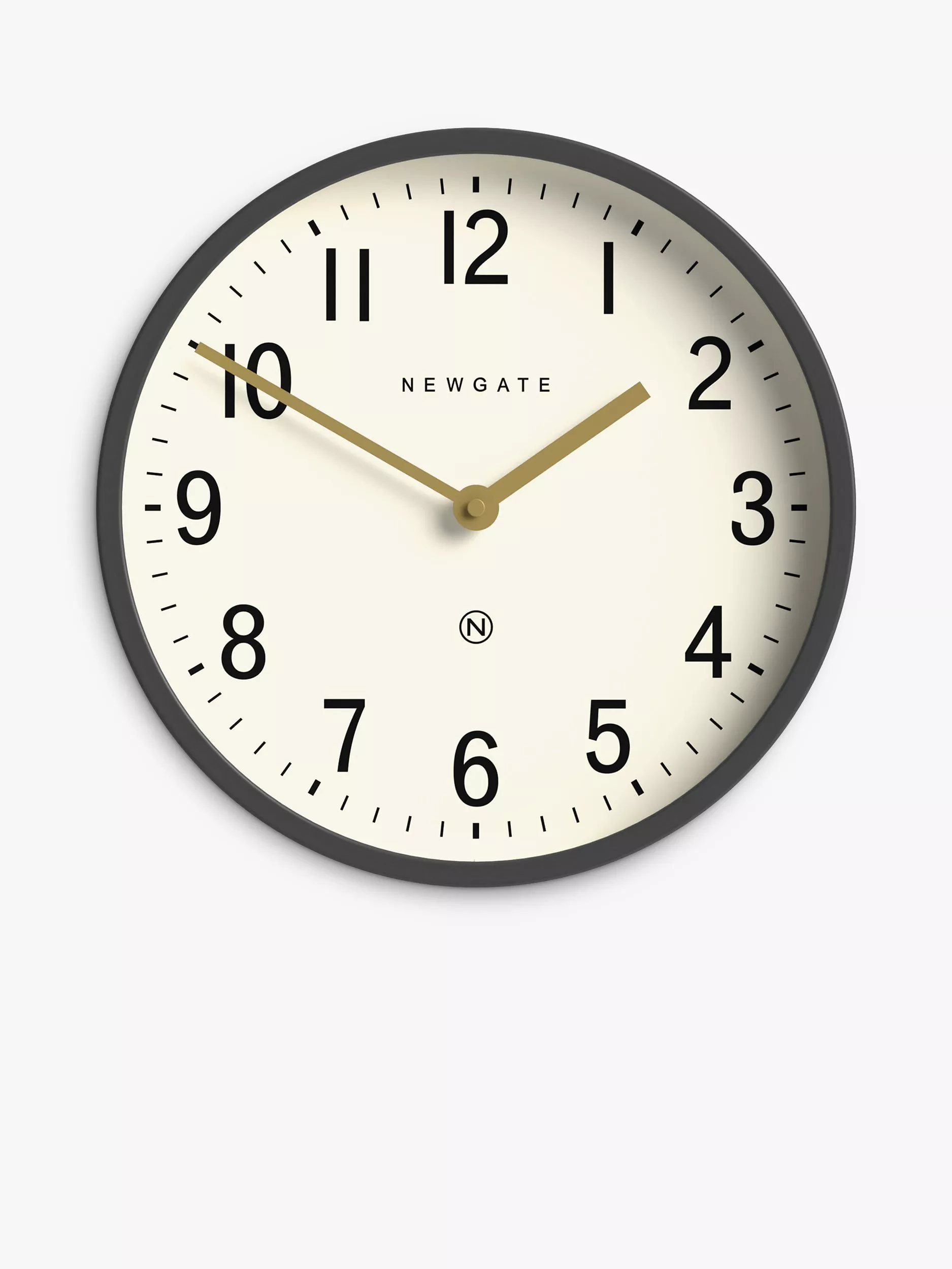 The Master Edwards wall clock from Newgate Clocks is inspired by mid-century minimalism with a solid circular metal case, straight cut for a clean and graphic line and modernist finish. The dial has Arabic numeral hour markers in a modern font, protected by a flat glass lens.