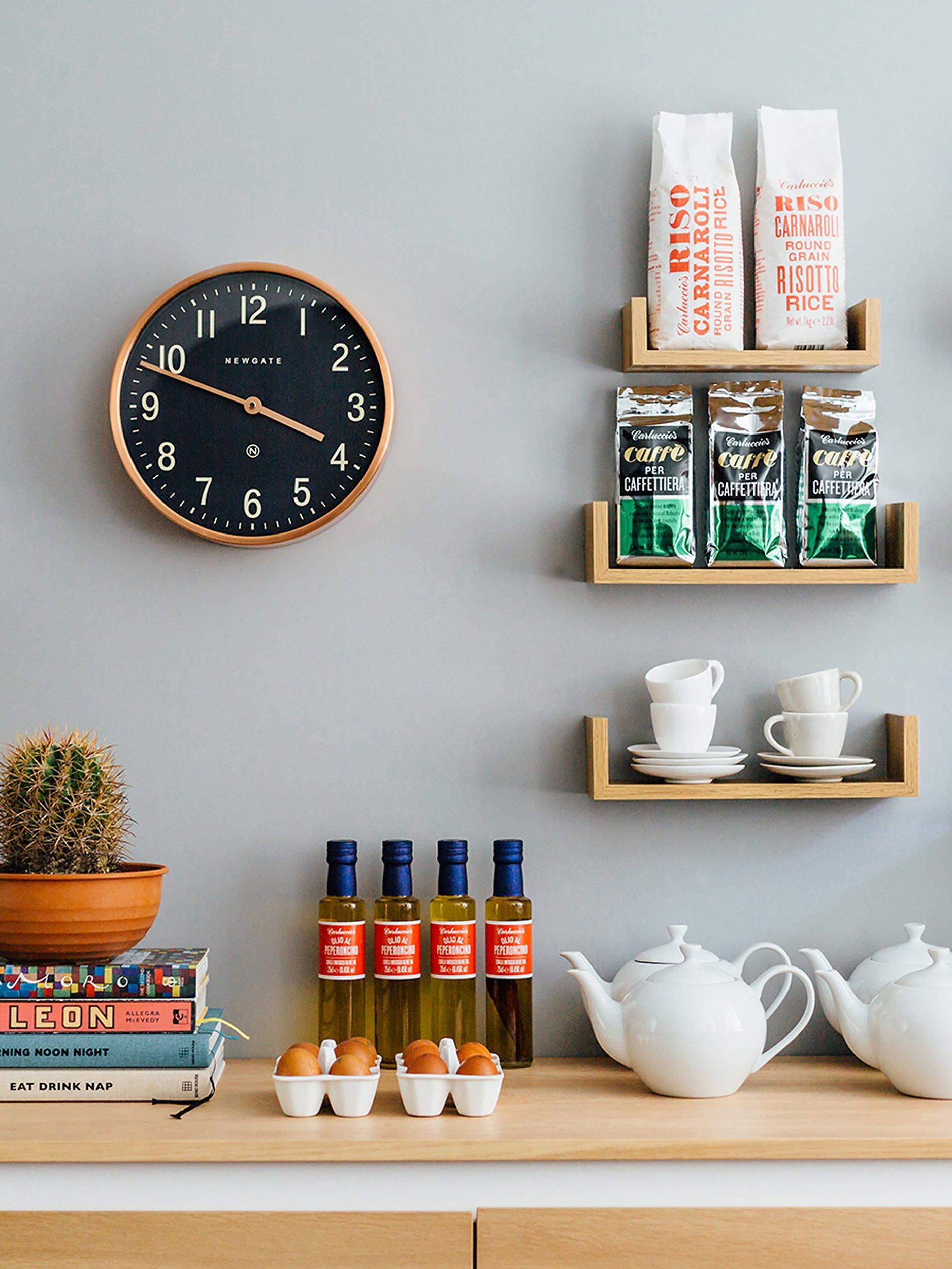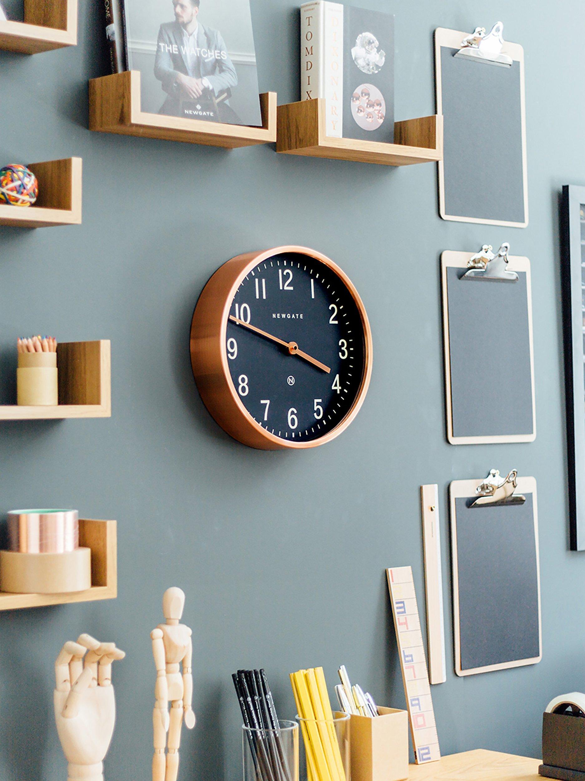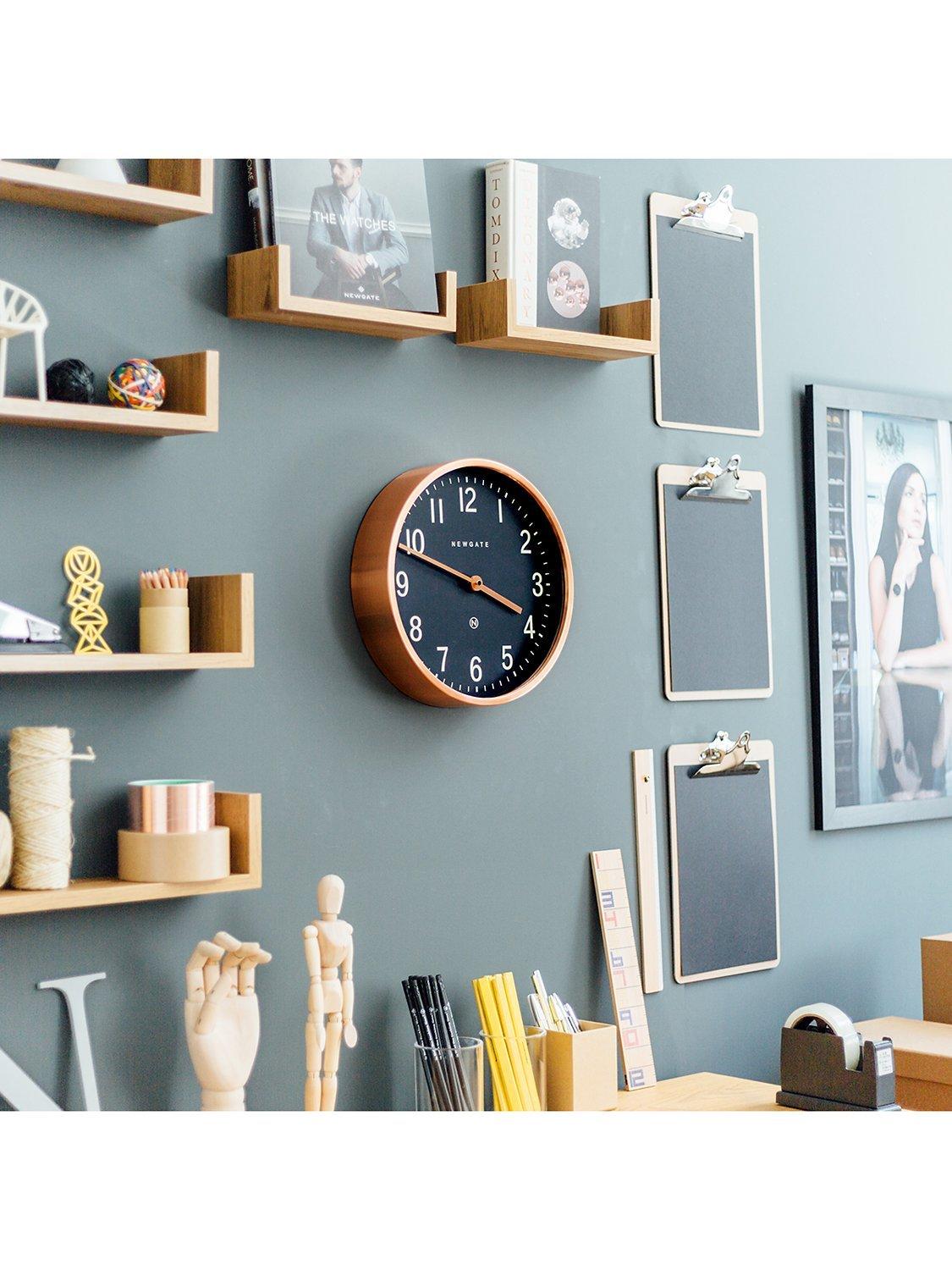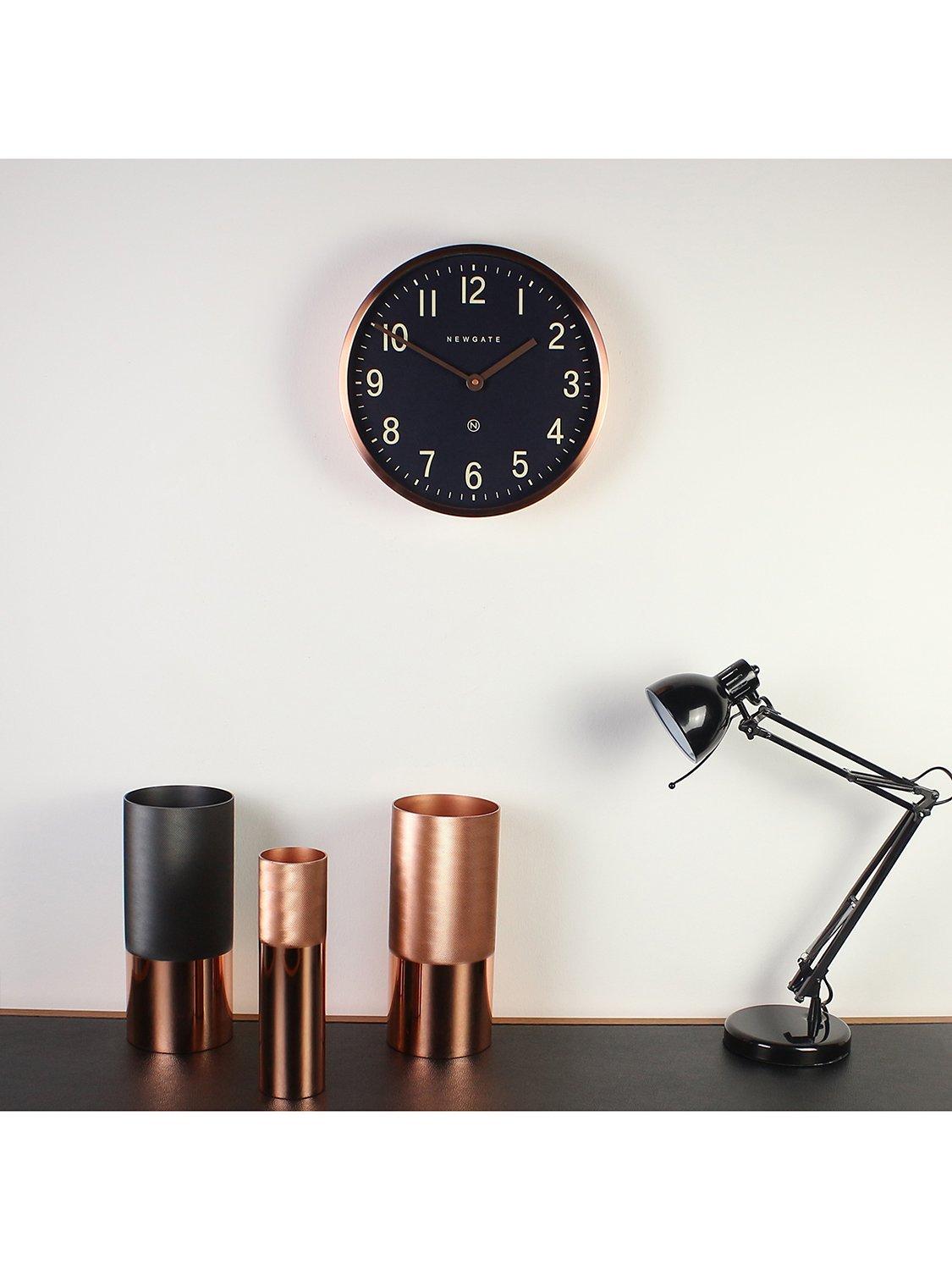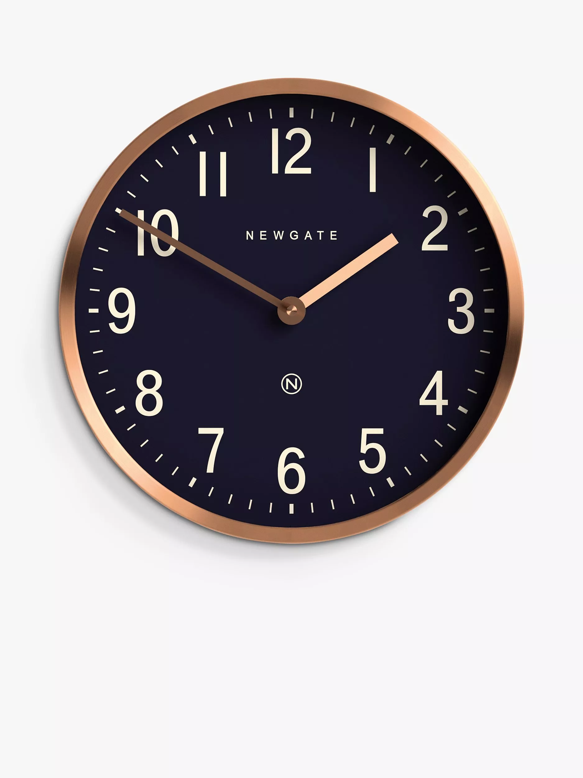 The Master Edwards wall clock from Newgate Clocks is inspired by mid-century minimalism with a solid circular metal case, straight cut for a clean and graphic line and modernist finish. The dial has Arabic numeral hour markers in a modern font, protected by a flat glass lens.
