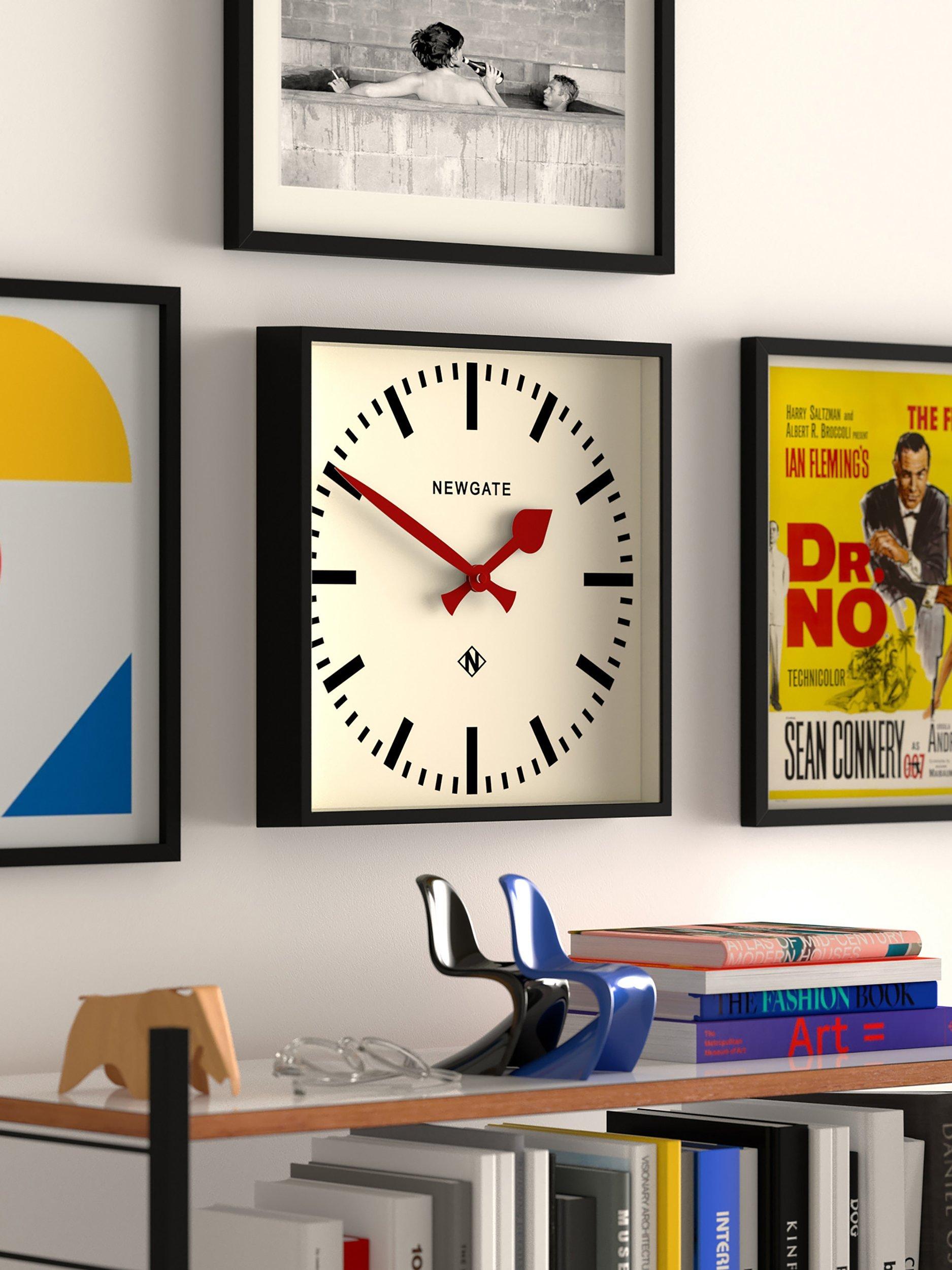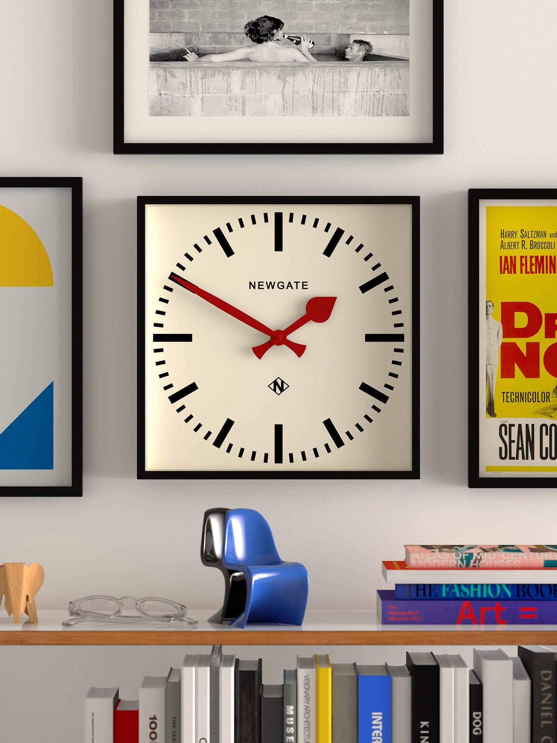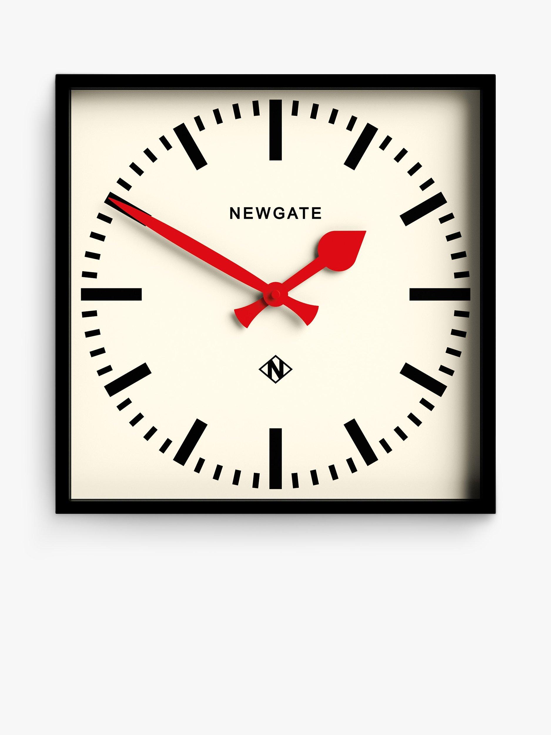 A square station wall clock from Newgate Clocks with an acrylic case and bold marker dial. The clock features contrasting red metal hands behind a glass lens. The clock has quartz movement for energy-efficient precision time-keeping. A faint tick can be heard in a totally silent environment such as a bedroom.