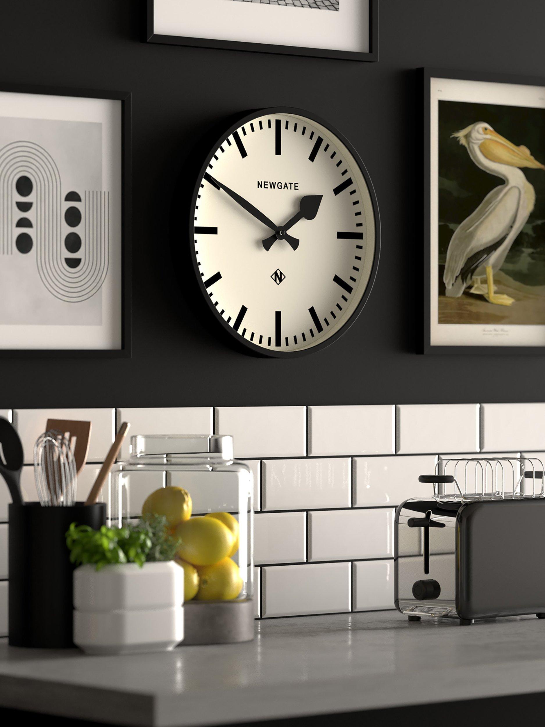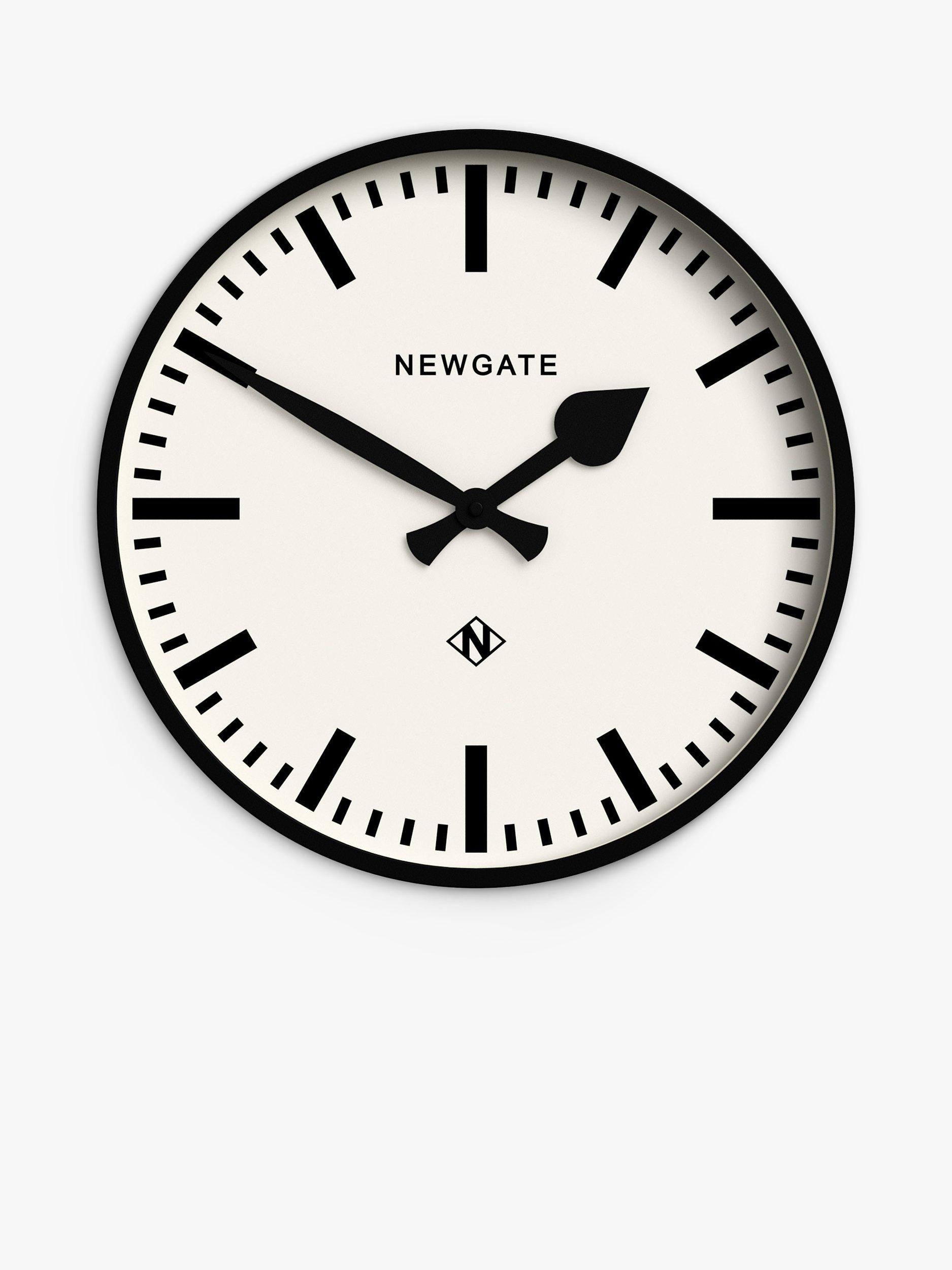 A round station wall clock from Newgate Clocks with a minimalist straight-cut acrylic case and bold marker dial. The clock features black spade and baton hands behind a glass lens. The clock has quartz movement for energy-efficient precision time-keeping. A faint tick can be heard in a totally silent environment such as a bedroom.
