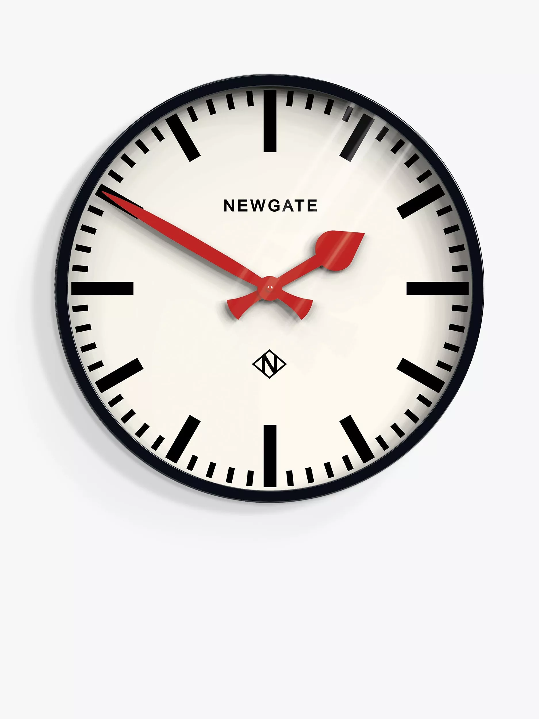 The iconic Putney Clock from Newgate is based on the instantly recognisable railway station clocks of the 1950s and 1960s. Its distinctive bold marker dial now makes a contemporary statement set into a remarkably deep metal drum case. A high gloss black finish contrasts perfectly with the clean off-white dial and statement red metal hands covered by a glass lens. A large-scale clock designed to make an impact.