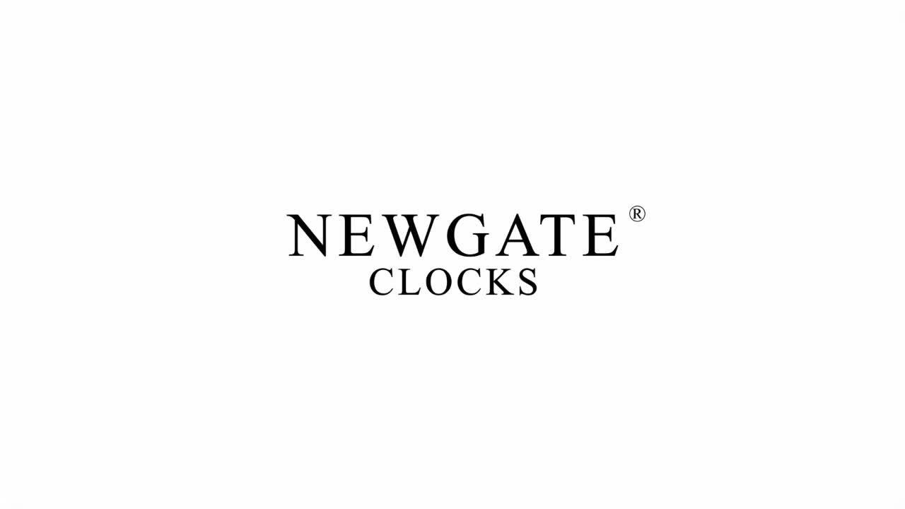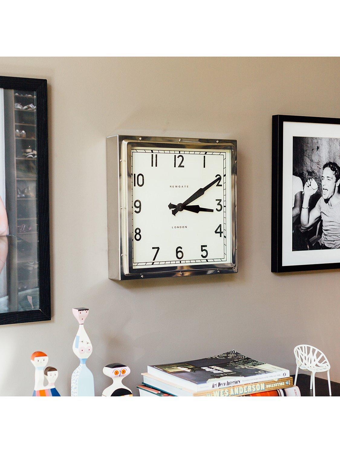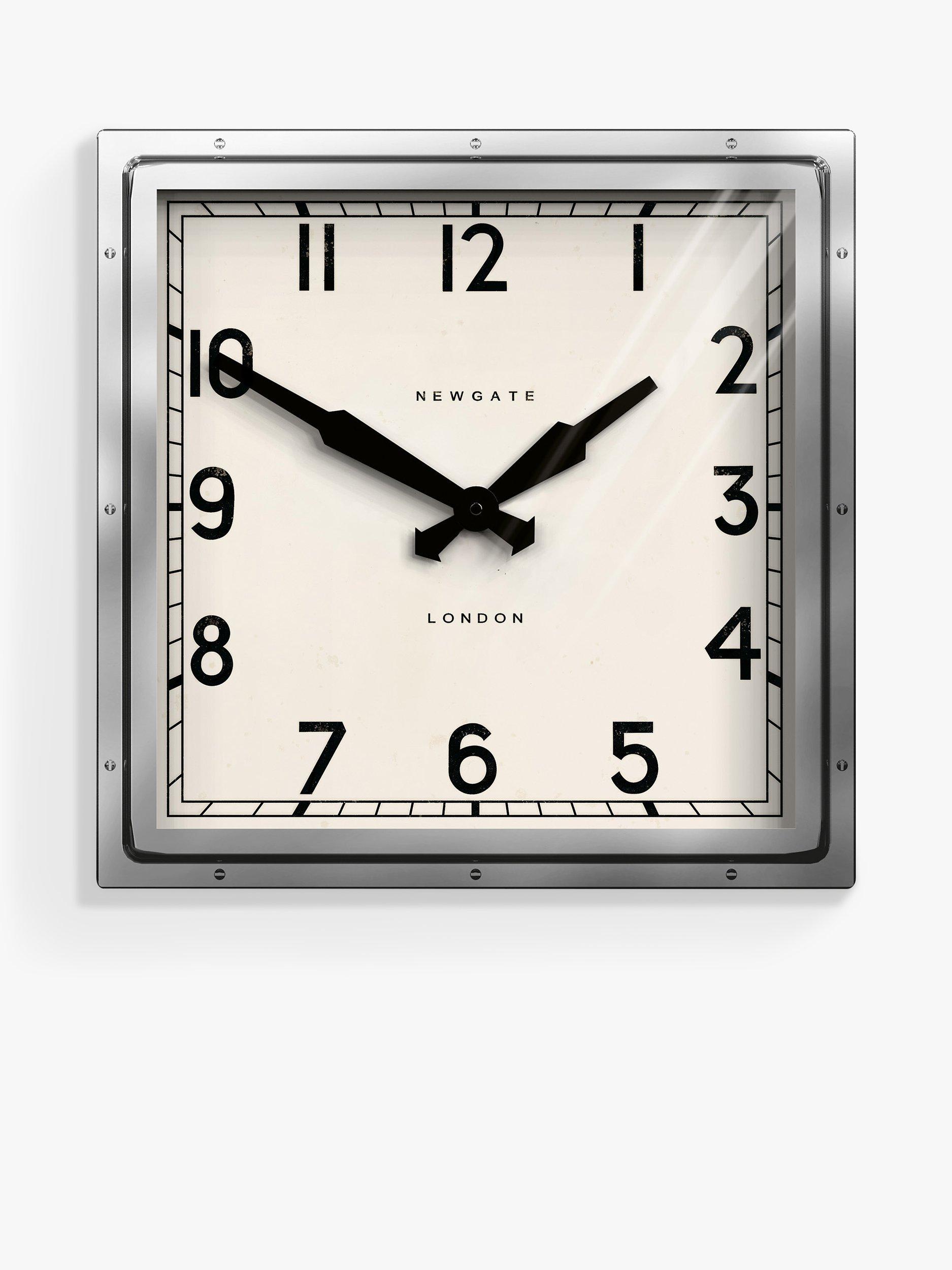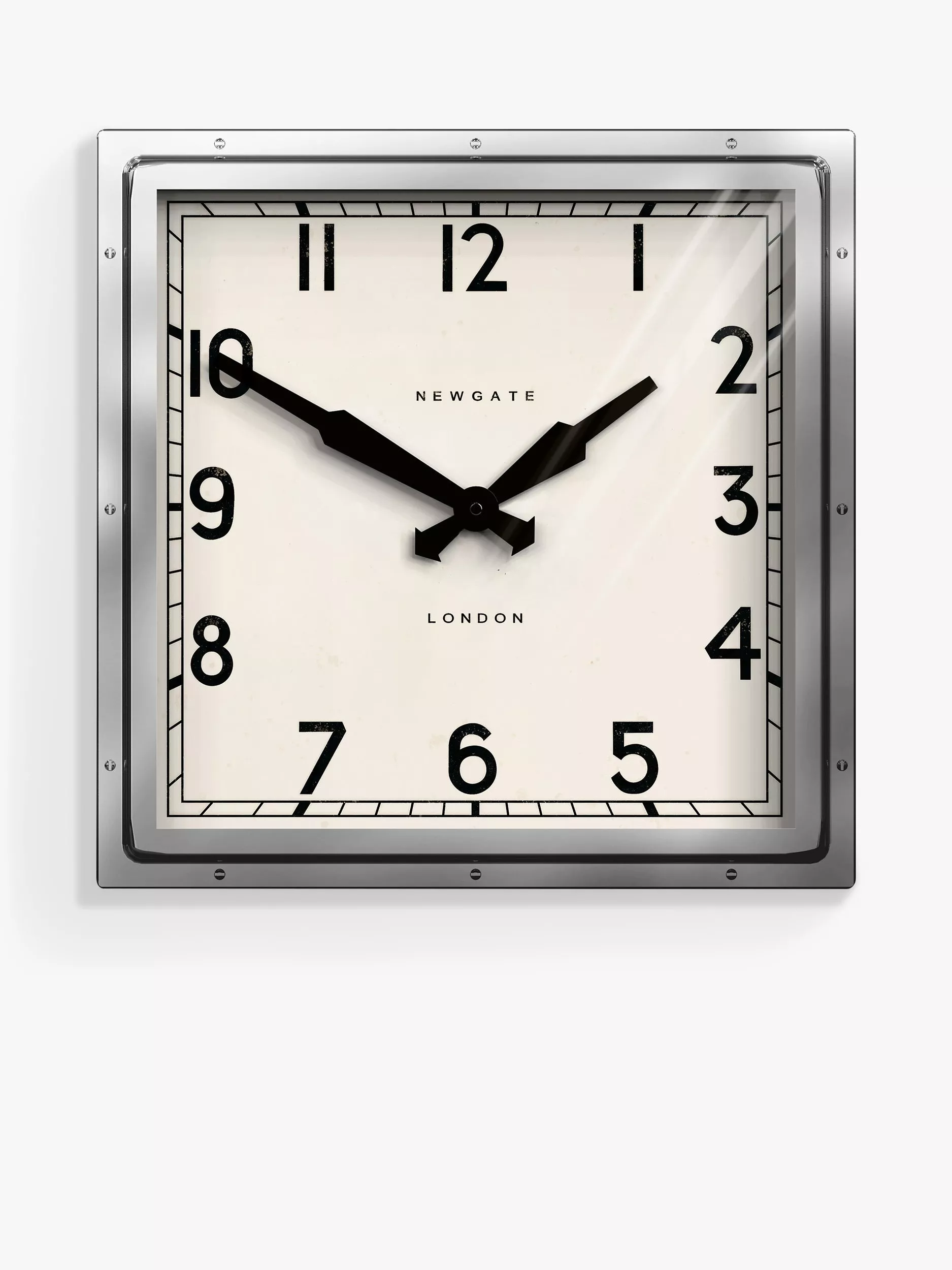 A truly iconic Newgate clock. The deep-pressed metal case with exposed rivets secures a sturdy glass lens. Its handsome square case surrounds a vintage dial with clear numbers measured by metal clock hands.