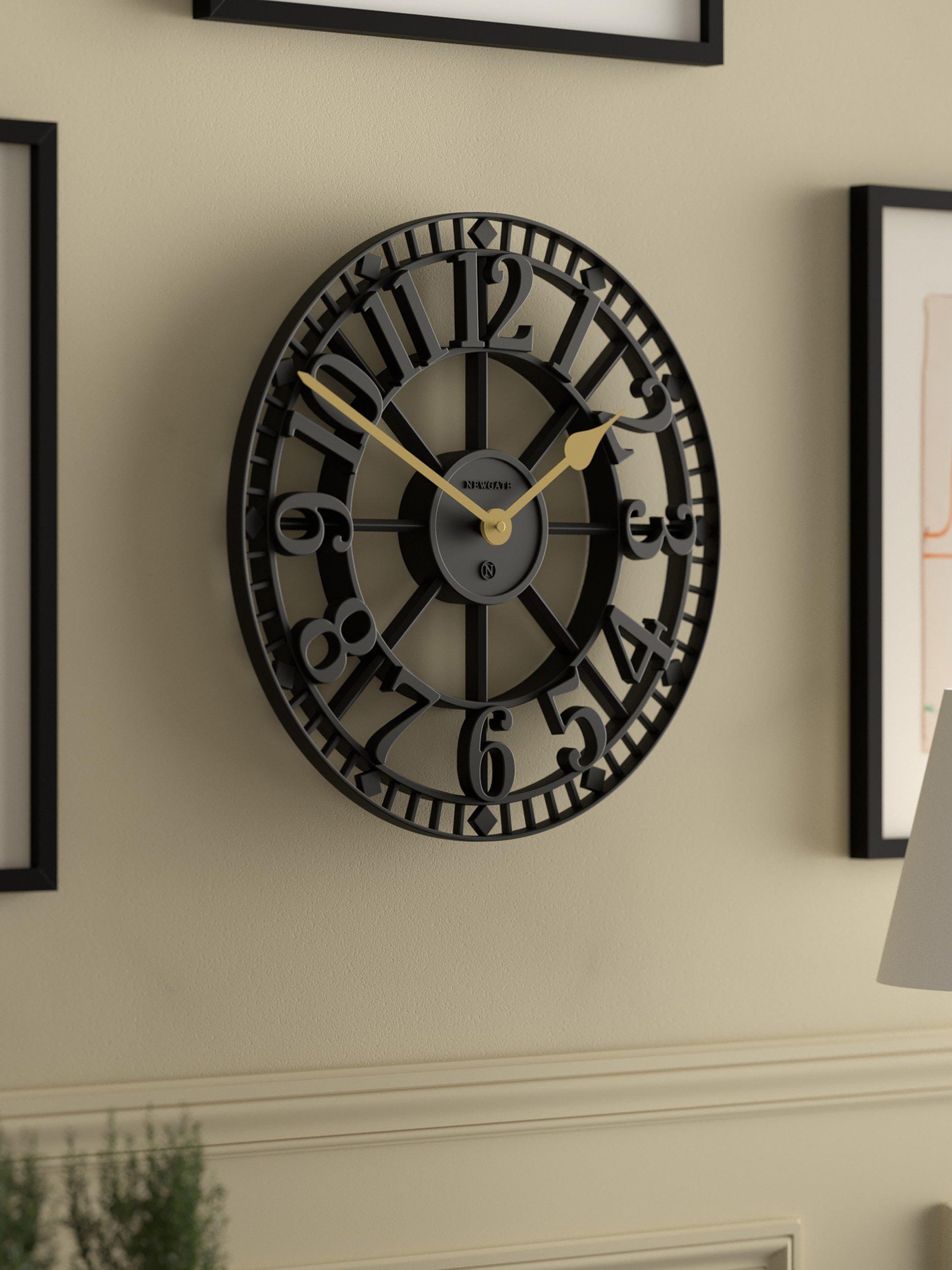 Transform your wall with the industrial elegance of the Warehouse clock. This eye-catching timepiece features an open-frame design, showcasing classic Arabic numerals and stylish gold-toned hands. Combining vintage warehouse aesthetics with modern sophistication, the skeleton design seamlessly allows your wall decor to show behind the frame.