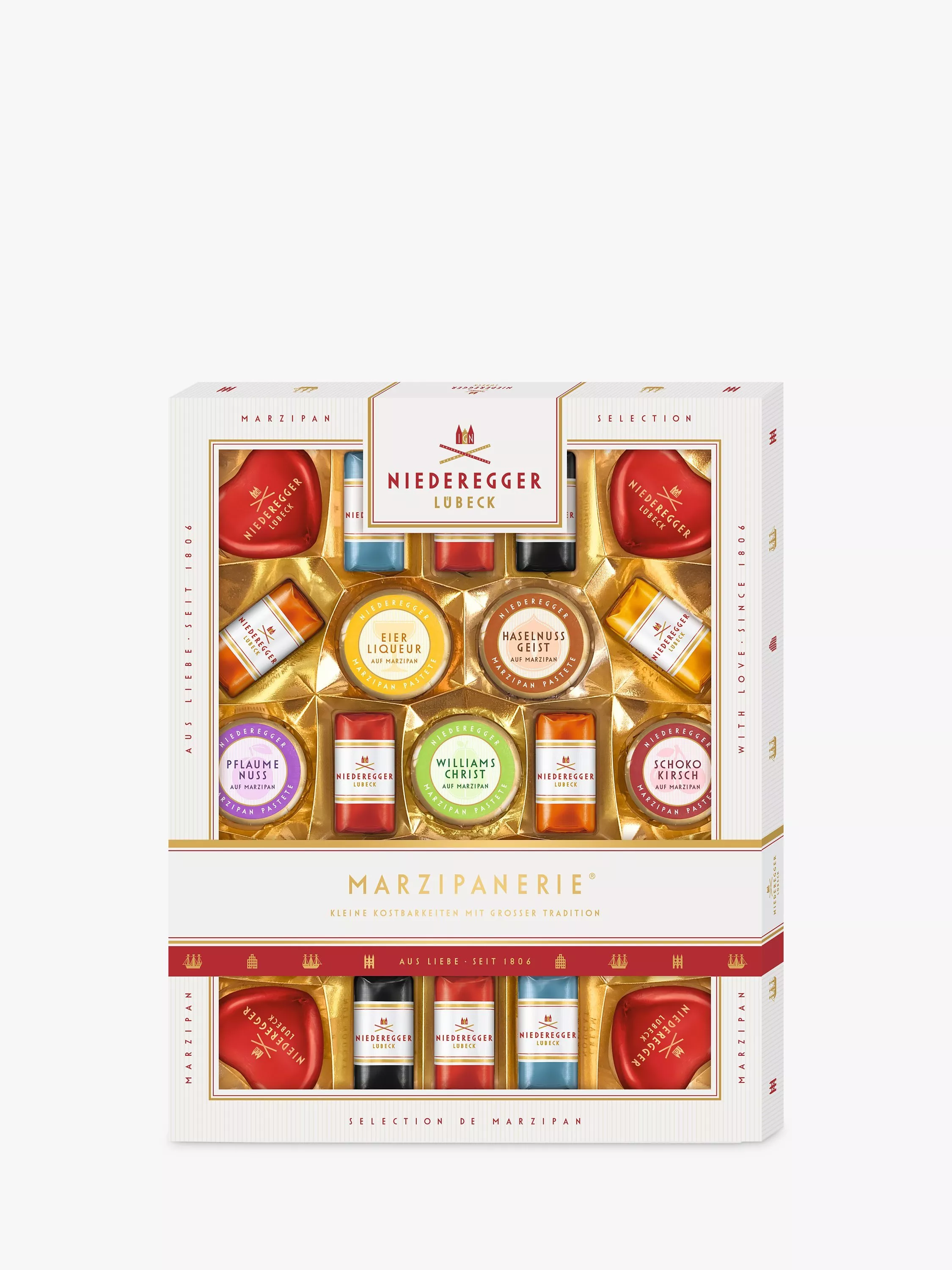 Niederegger marzipan packed in a gift box, classic and flavoured mini loaves, dark chocolate enrobed hearts and delicious fruit filled mini marzipan cakes. Makes an ideal gift or treat for yourself.