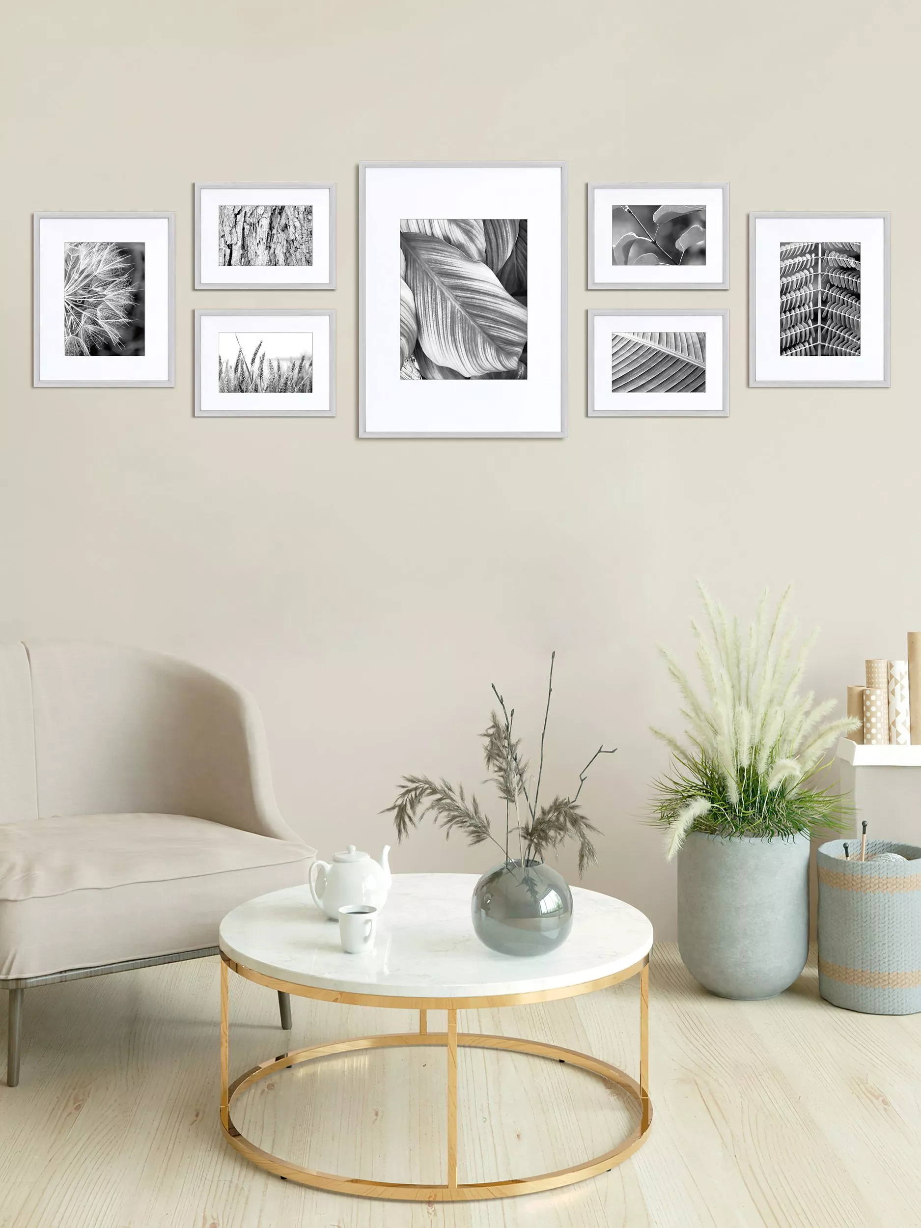 Create a gallery wall of photos with this set of seven photo frames, all with matching aluminium frames in a slim and contemporary profile. Ideal for displaying similarly themed images together, they come with window mounts. Each frame is easy to wall mount, horizontally or vertically.