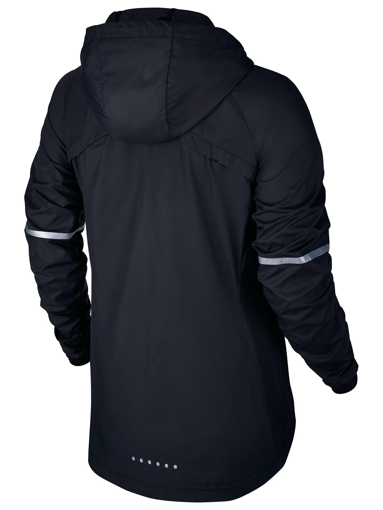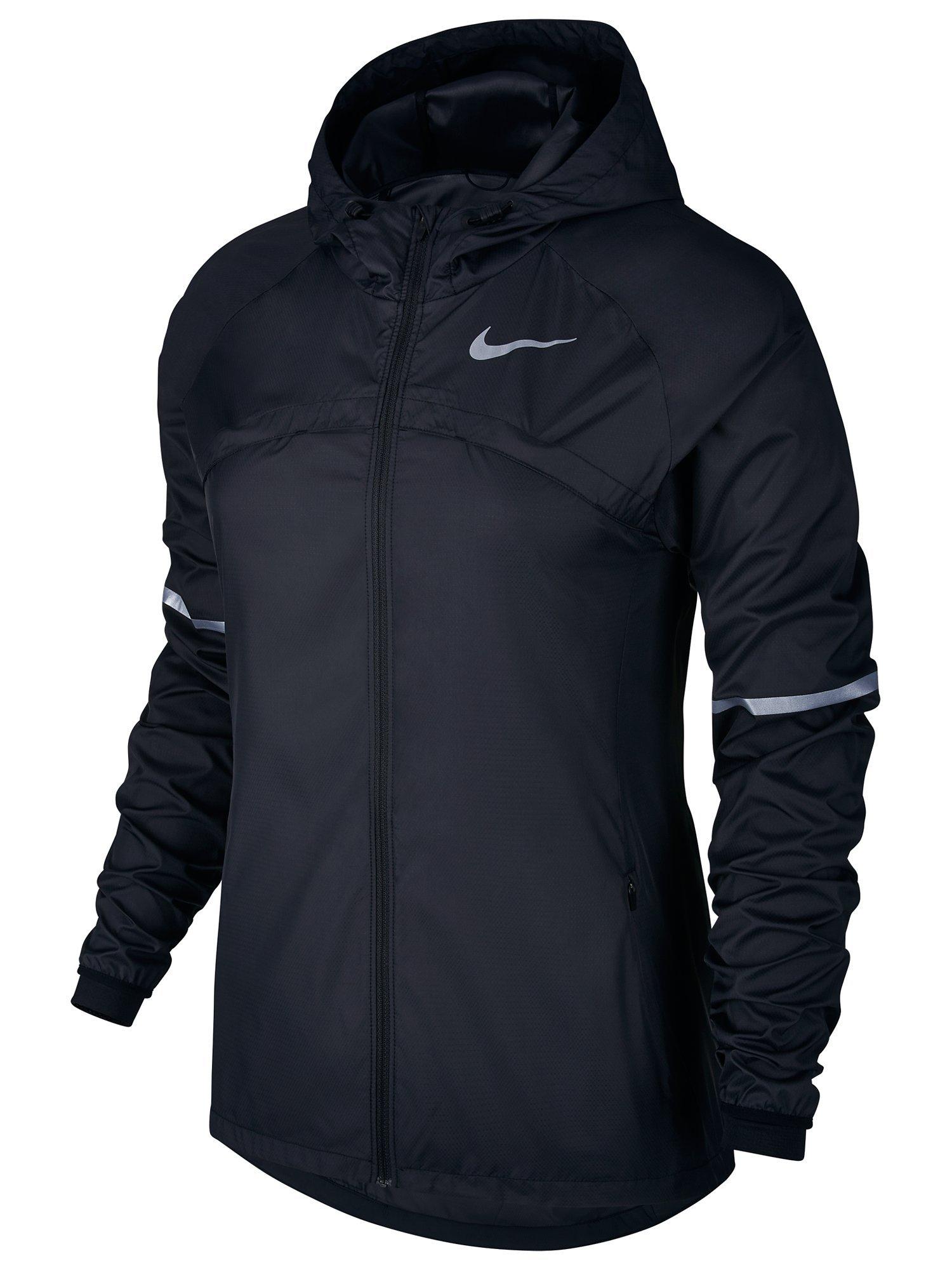 Head out in the wind-and water-resistant coverage of Women's Nike Shield Hooded Running Jacket. Its runner-specific design features a media pocket, breathable vents and a fitted hood that stays in place while allowing for visibility as you speed along your route.