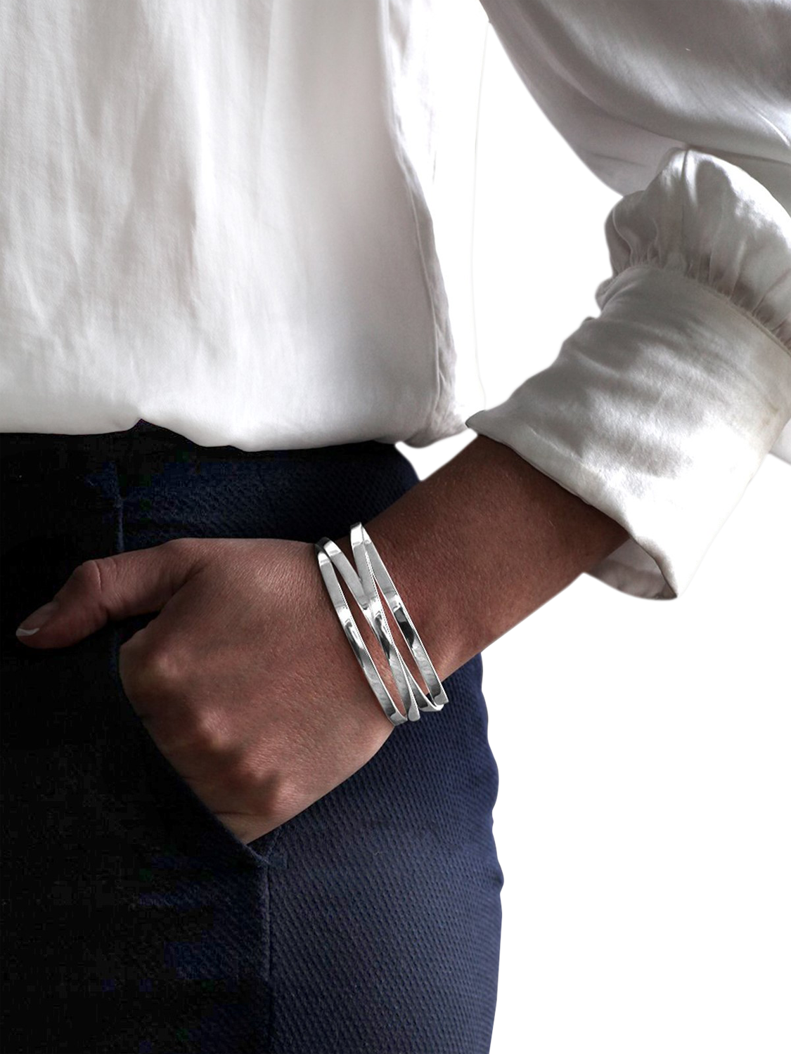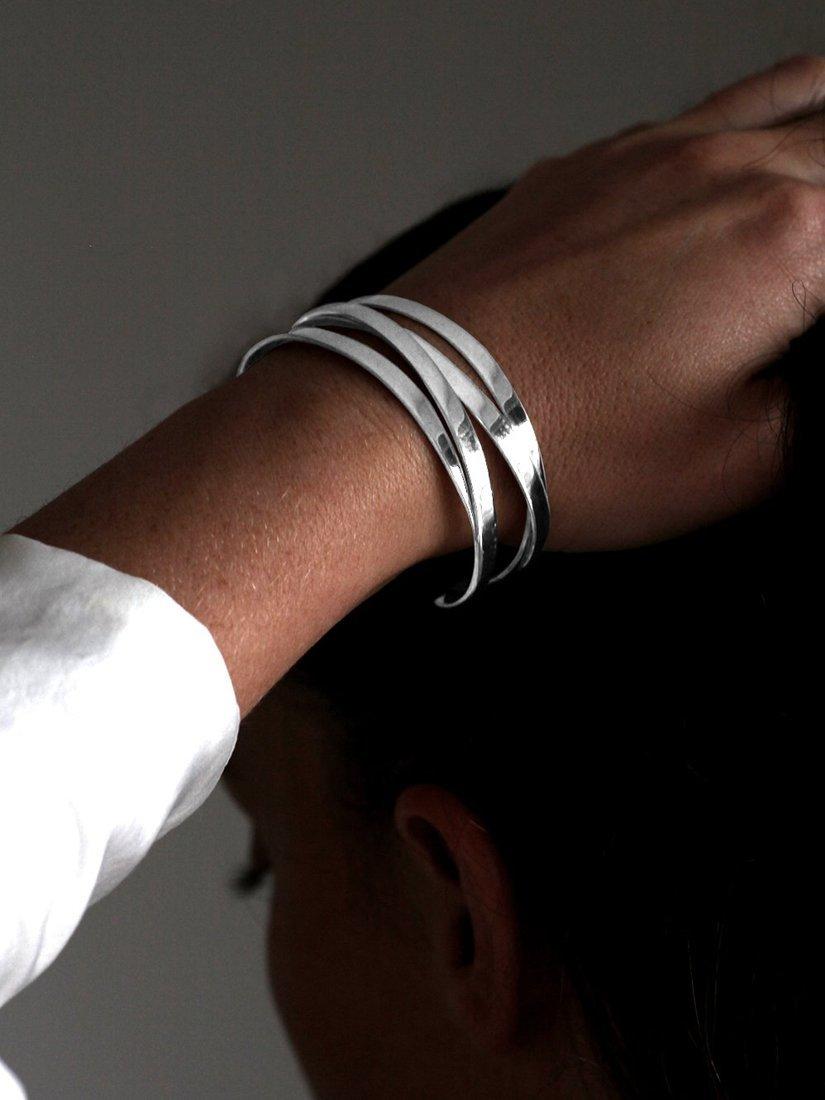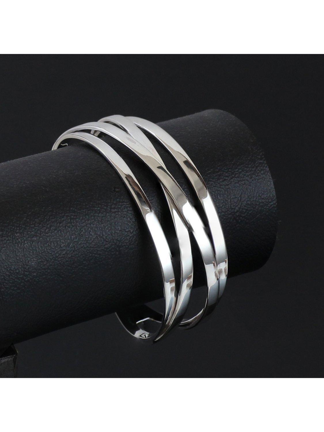 Made from sterling silver, the flat interlinked strands give an architectural look, while the open end styling will offer you comfortable and hassle-free wear.