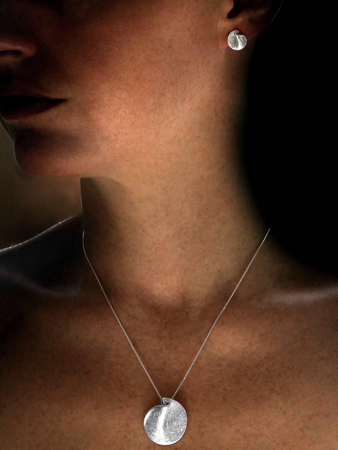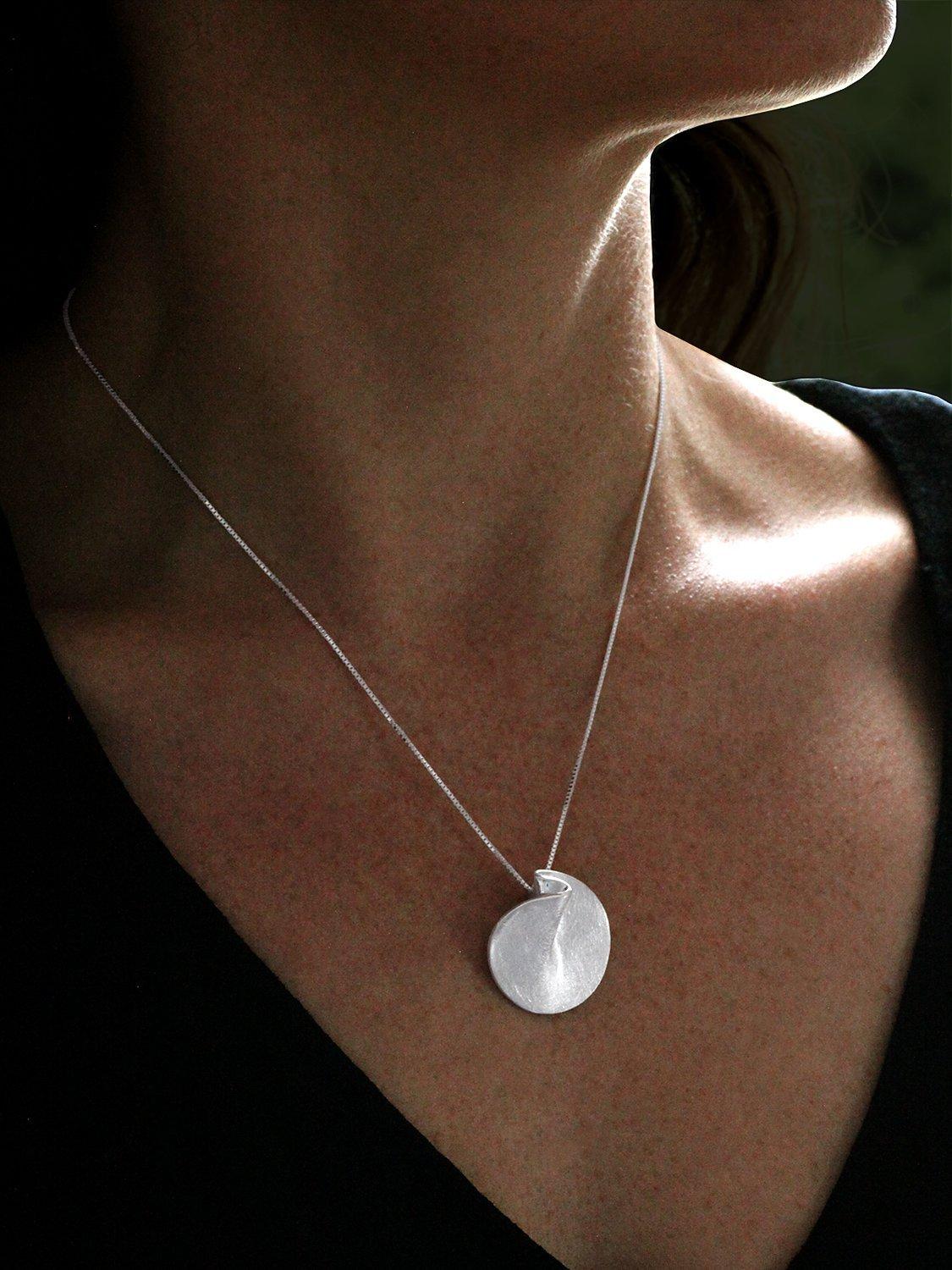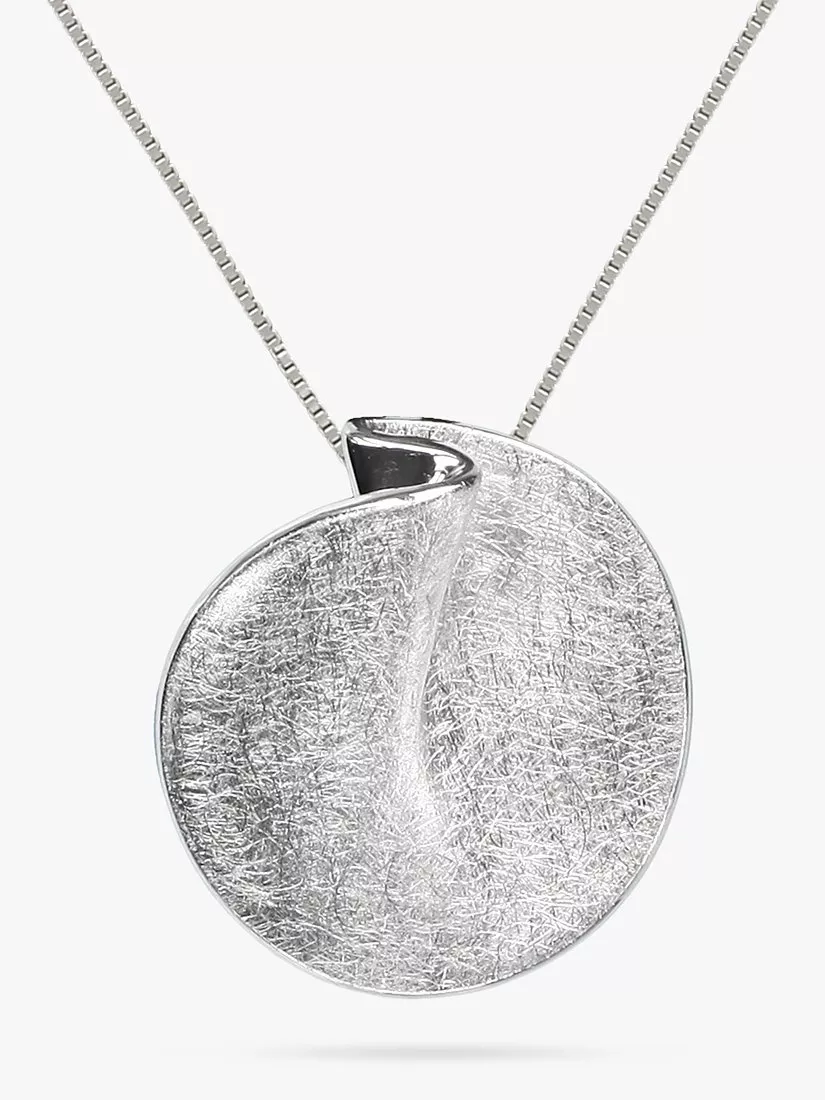 The timeless box chain contrast beautifully with the brushed round pendant. The pendant features a folded element that lends an intricate texture to the look and is finished with a brushed styling. It fastens with a classic clasp.