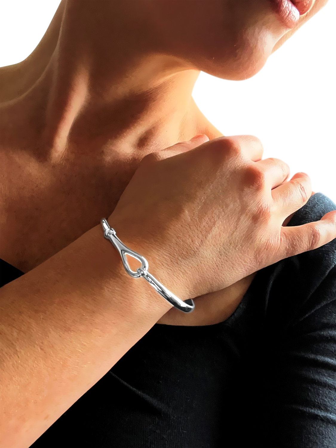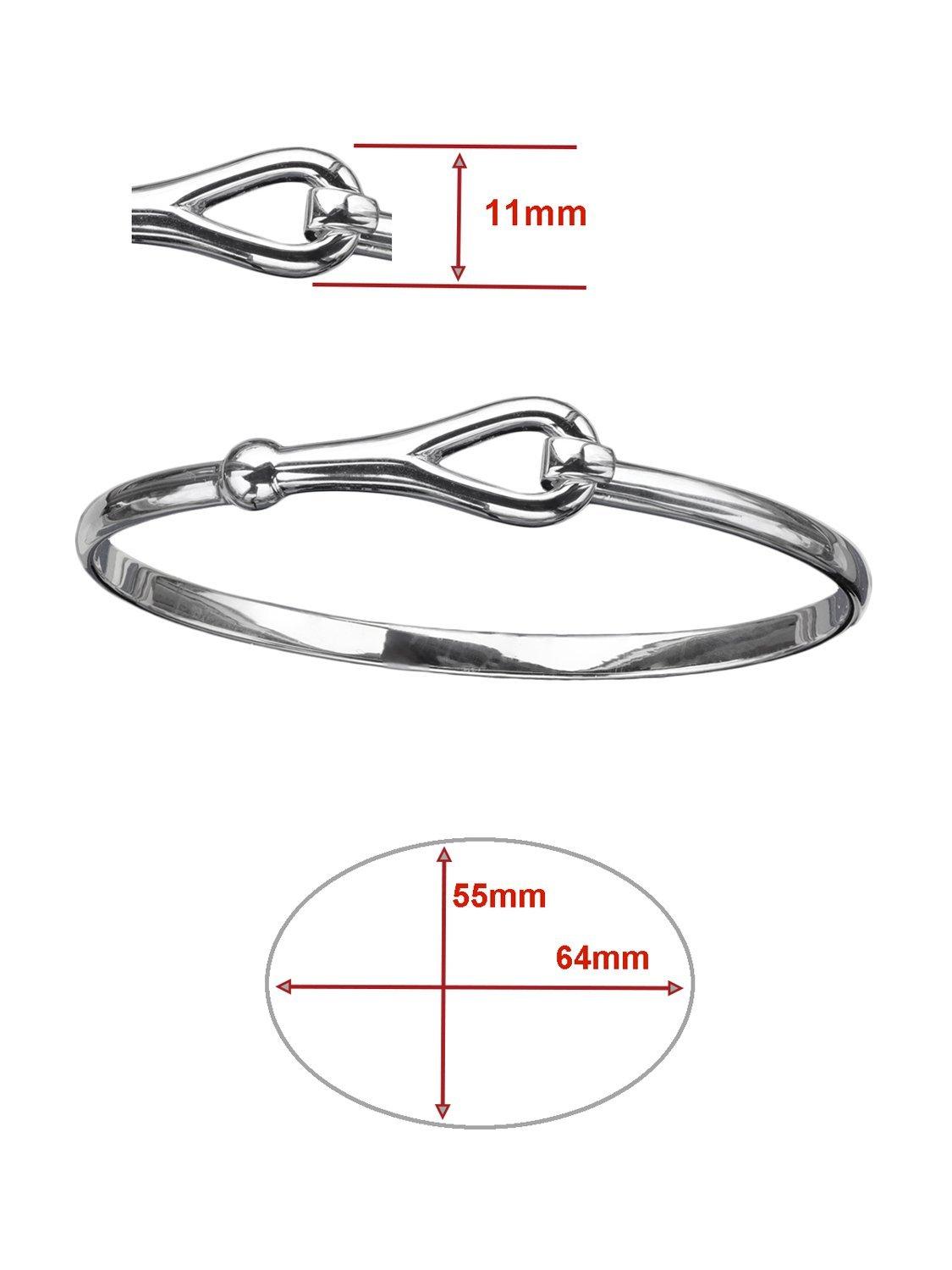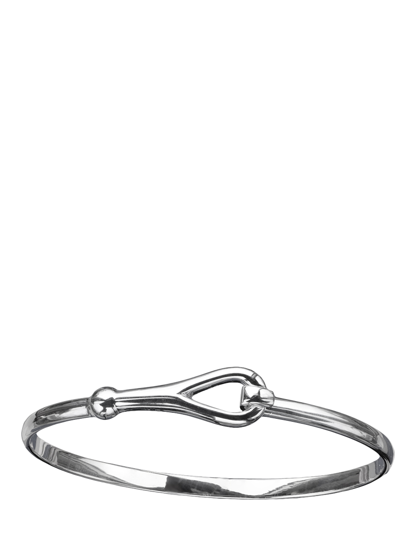 This simple tension hook bangle is made from solid sterling silver and reaches around the wrist to clasp its own loop.