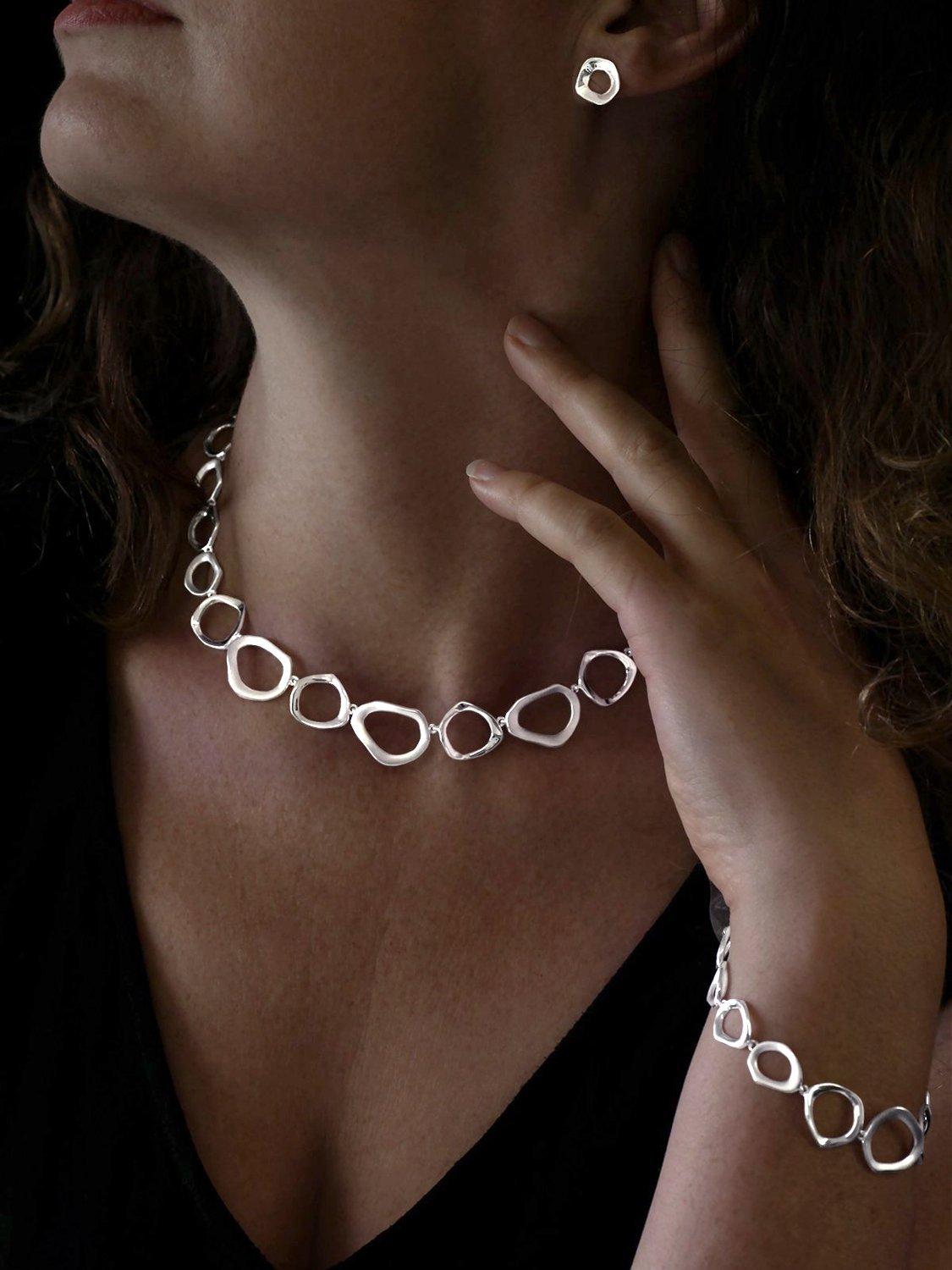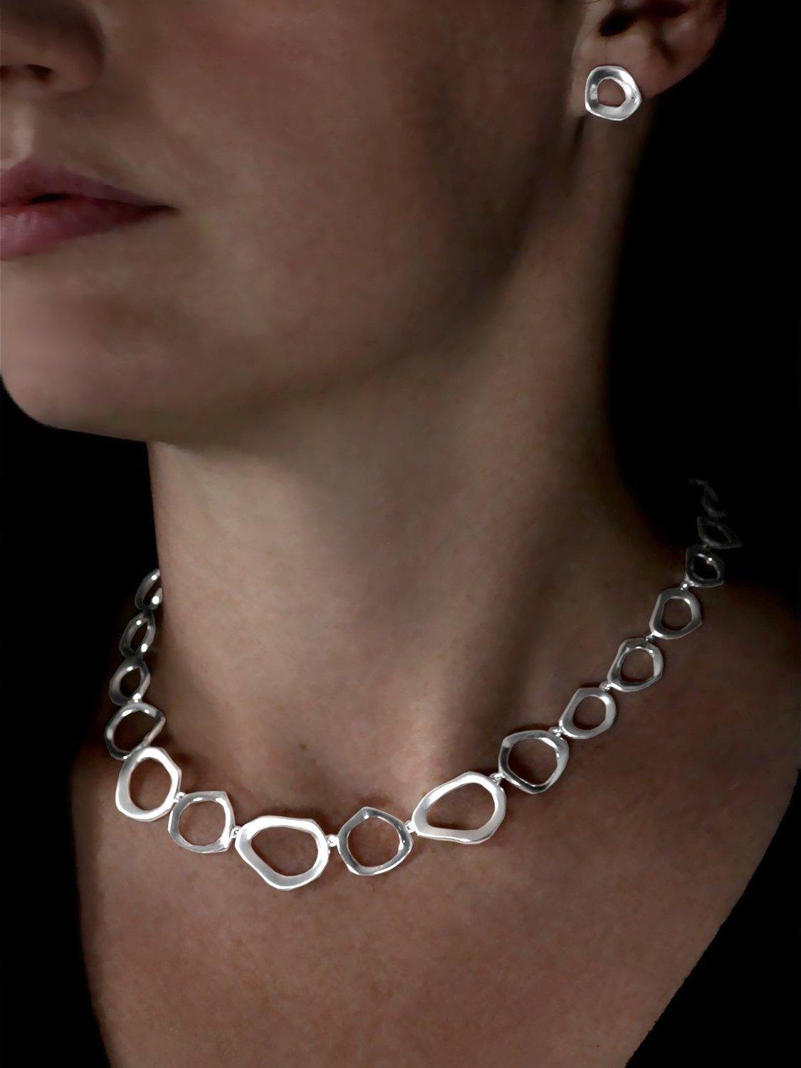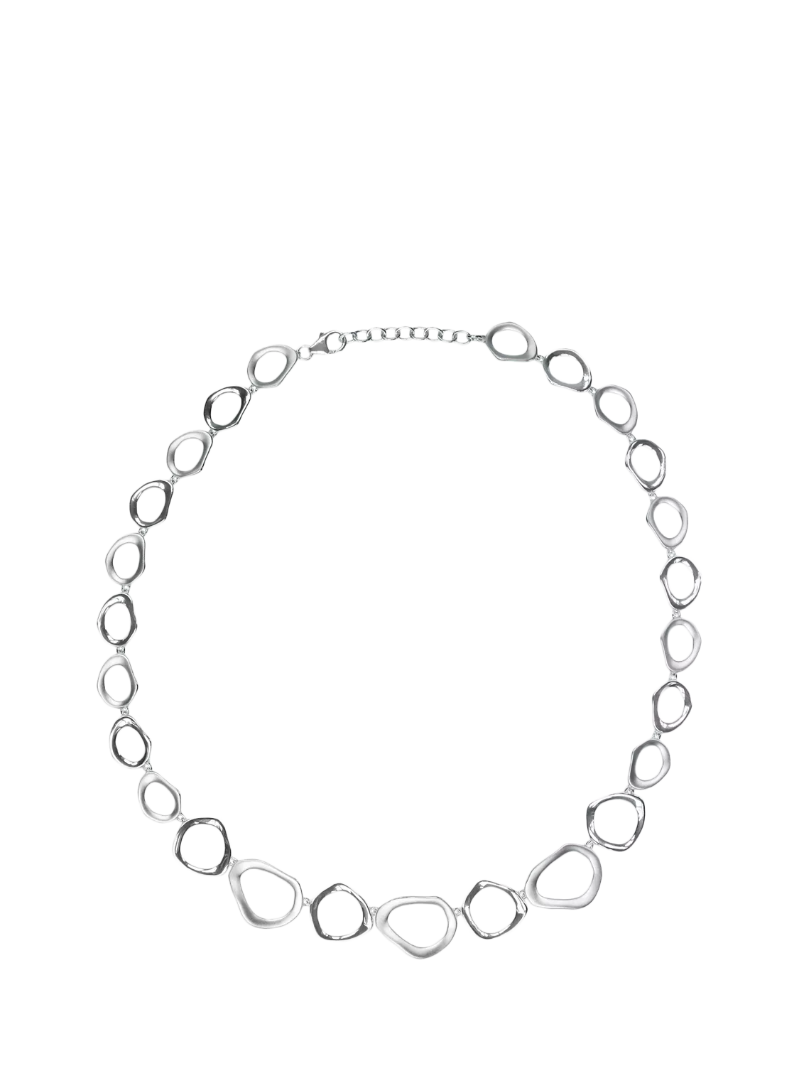 In solid sterling silver, the necklace offers different lengths thanks to its adjustable chain. The open links have a subtle irregular shape that creates a very natural feel.