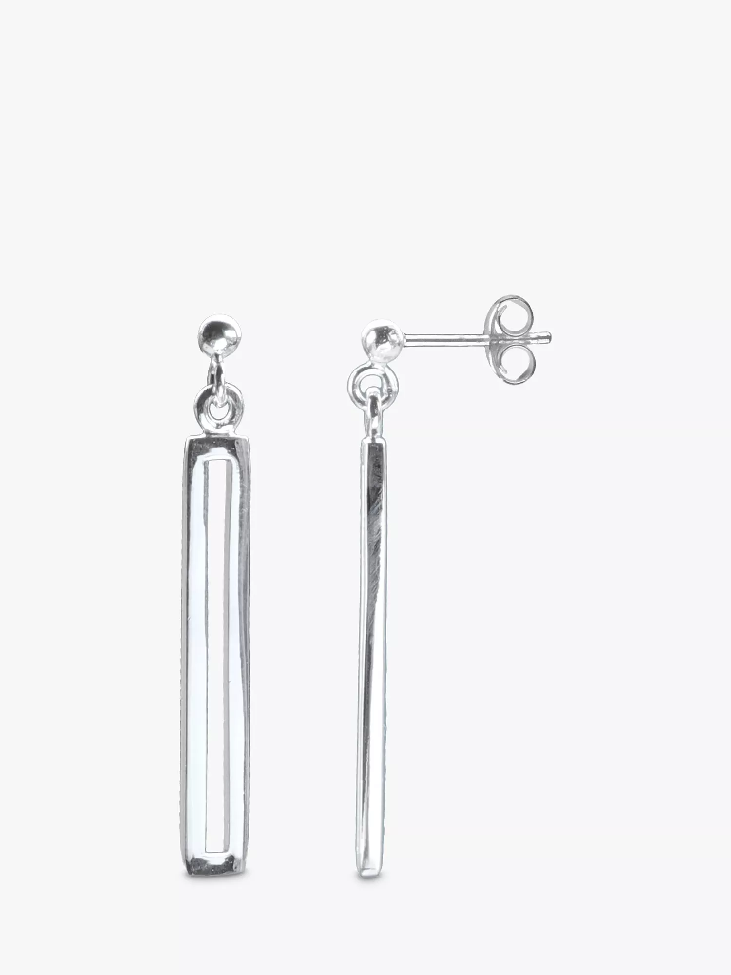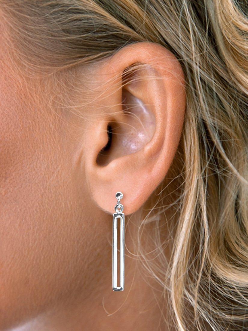 These Nina B drop earrings are made from silver into a slim rectangular shape with a cutout centre. The earrings have conventional posts that are suitable for pierced ears only.