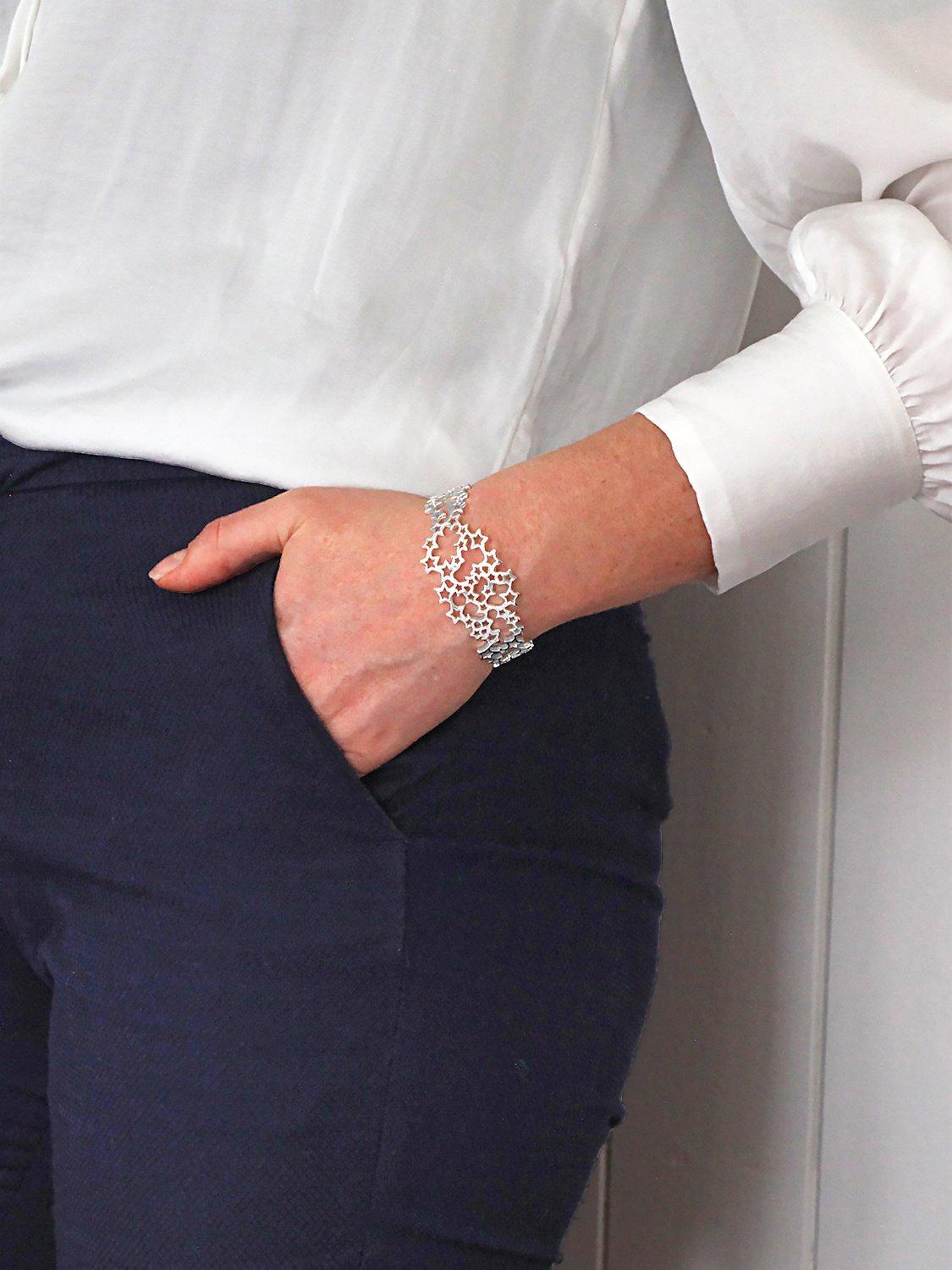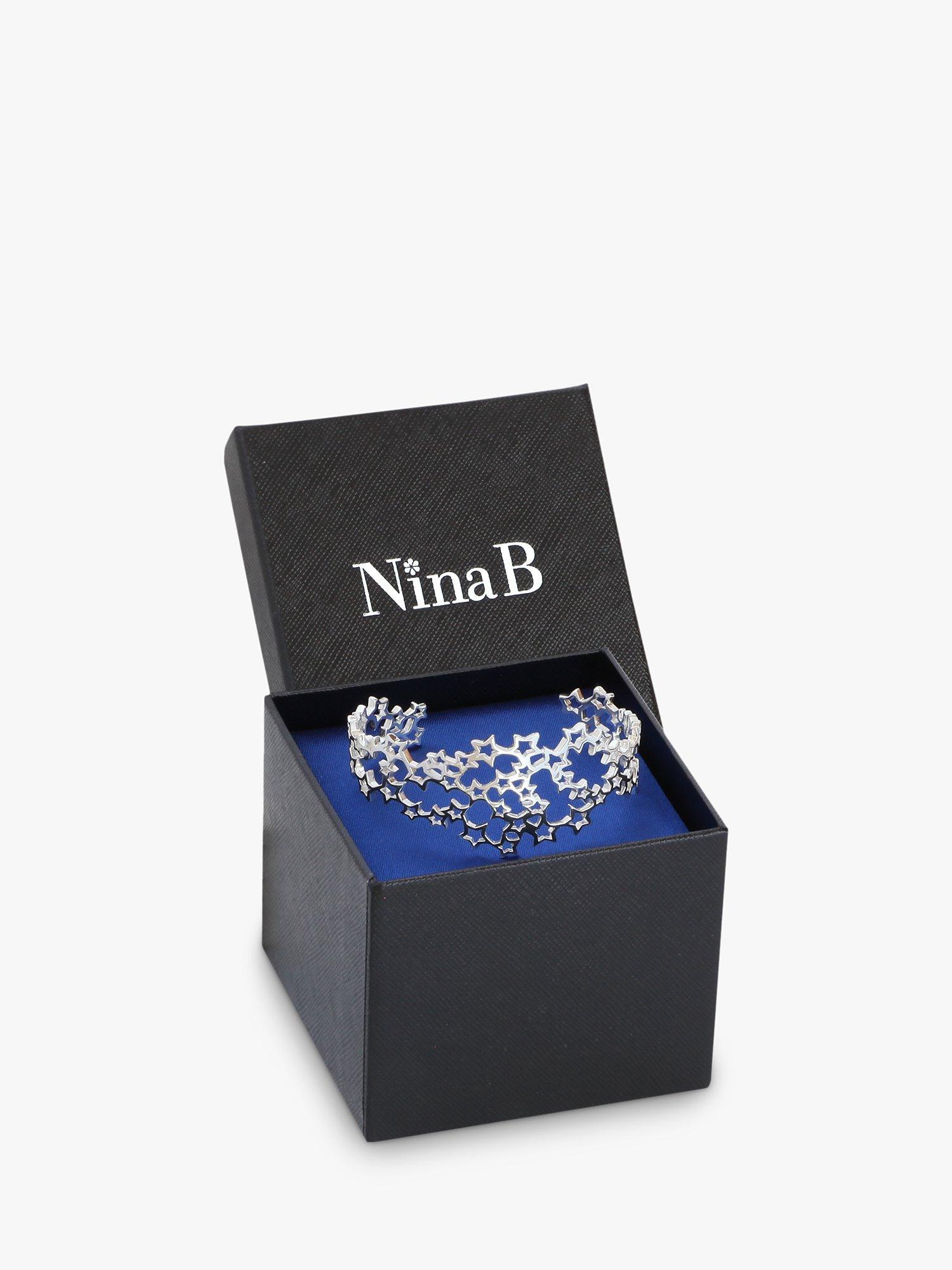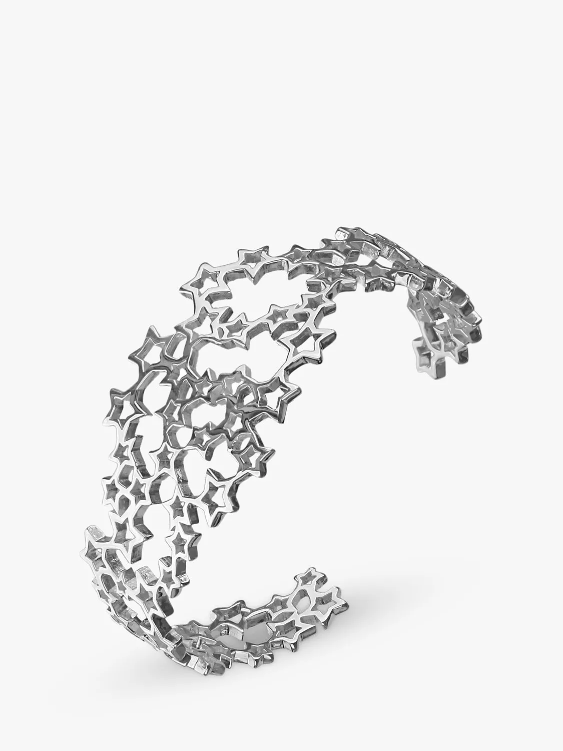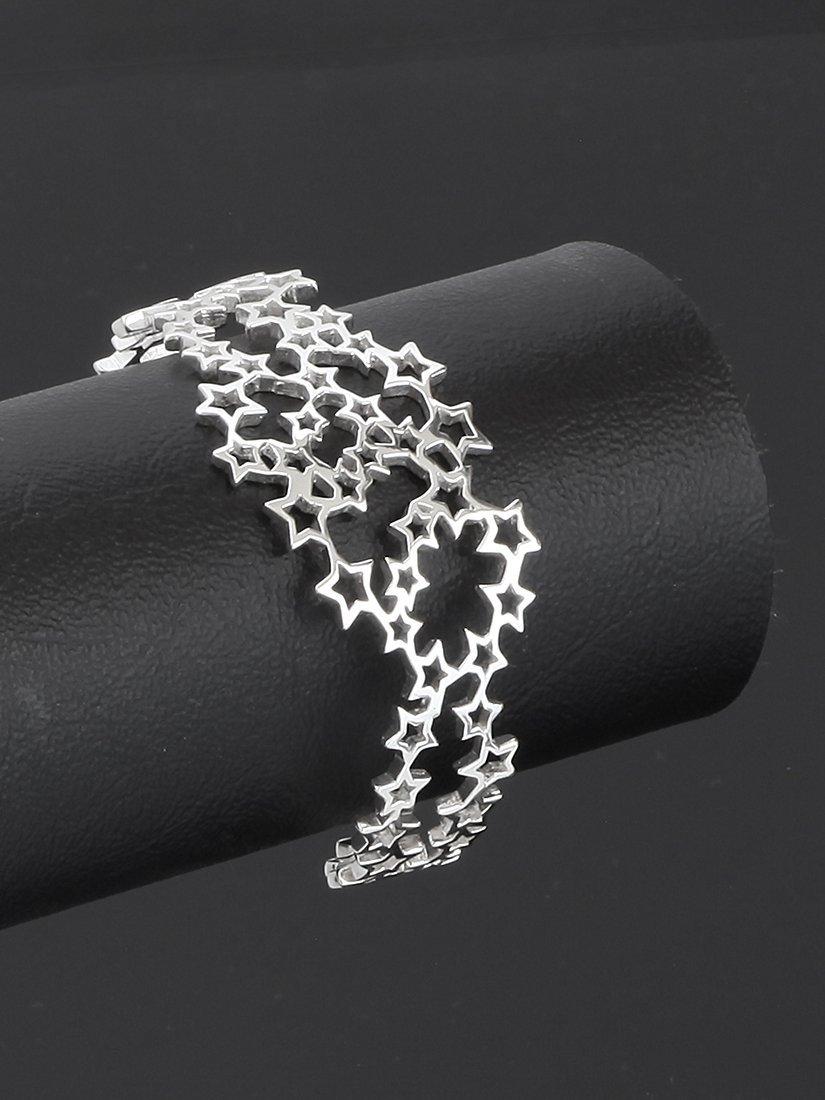 Striking and a great piece to have on your wrist when going out, this Nina B cuff is made from multiple cut-out stars that create an intriguing and bold look. The open-end design will fit around most wrists.