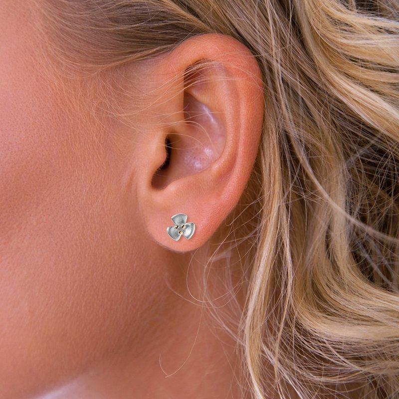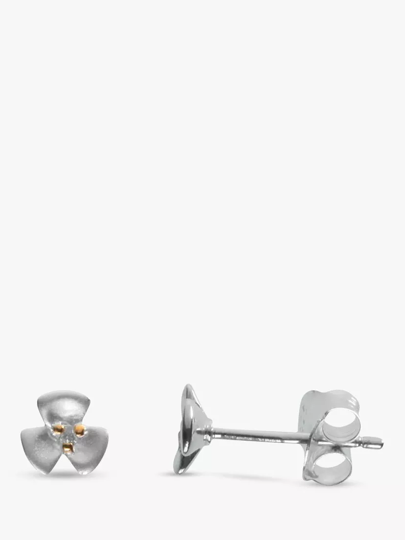 Made from sterling silver, the pair displays a tiny three-petal flower shape with small gold-plated accents. The earrings come with conventional post fittings that are for pierced ears only.