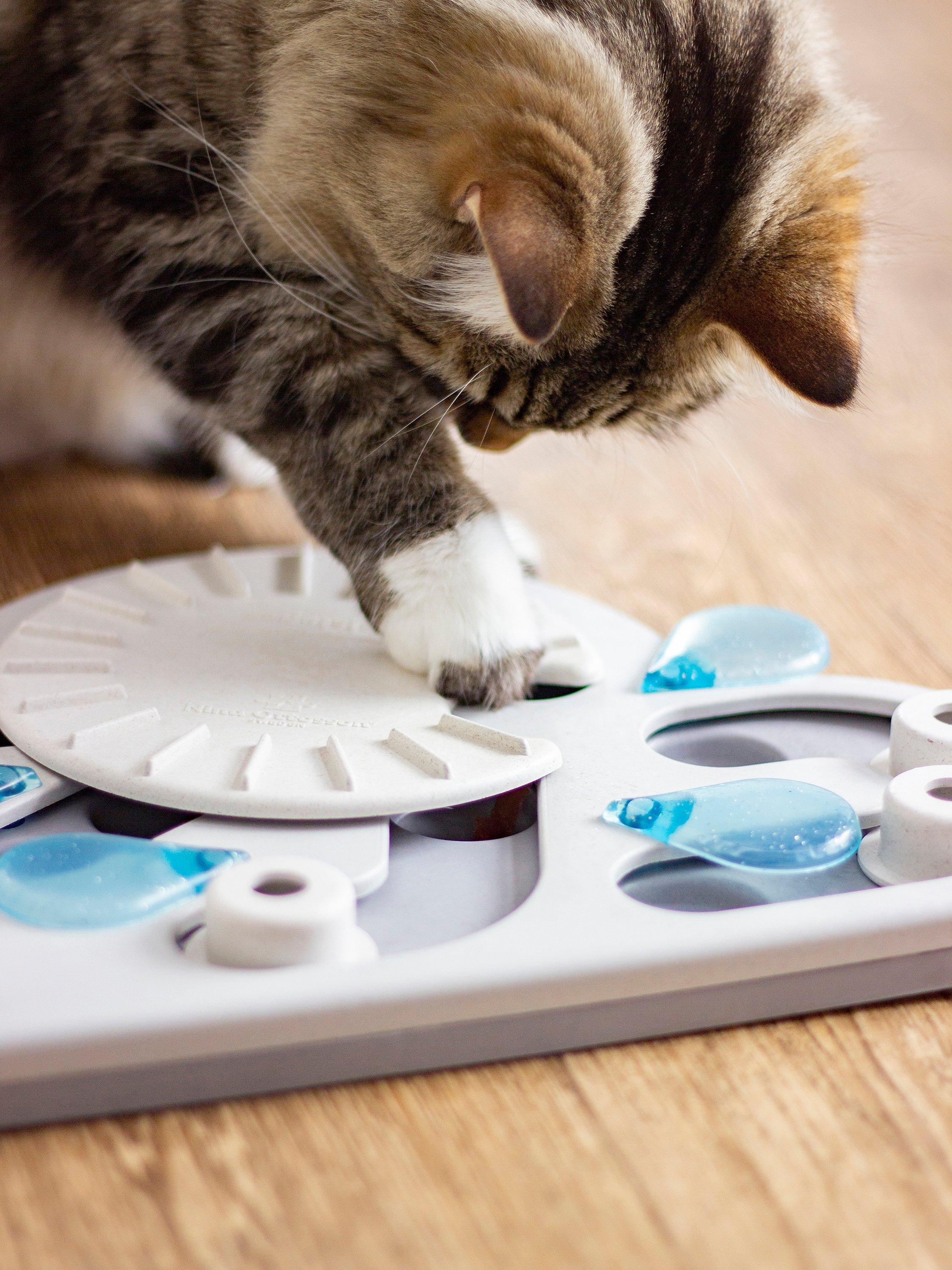 Rainy day puzzle & play cat toy. Great for curious cats, it stimulates natural foraging instincts. Use for daily feeding to encourage a healthy eating pace. 14 hidden shallow treat cups designed with cats in mind. Holds up to 1/4 cup of food. Made with food safe materials - BPA, PVC & phtalate free. Easy to clean. No removable parts for safer play.