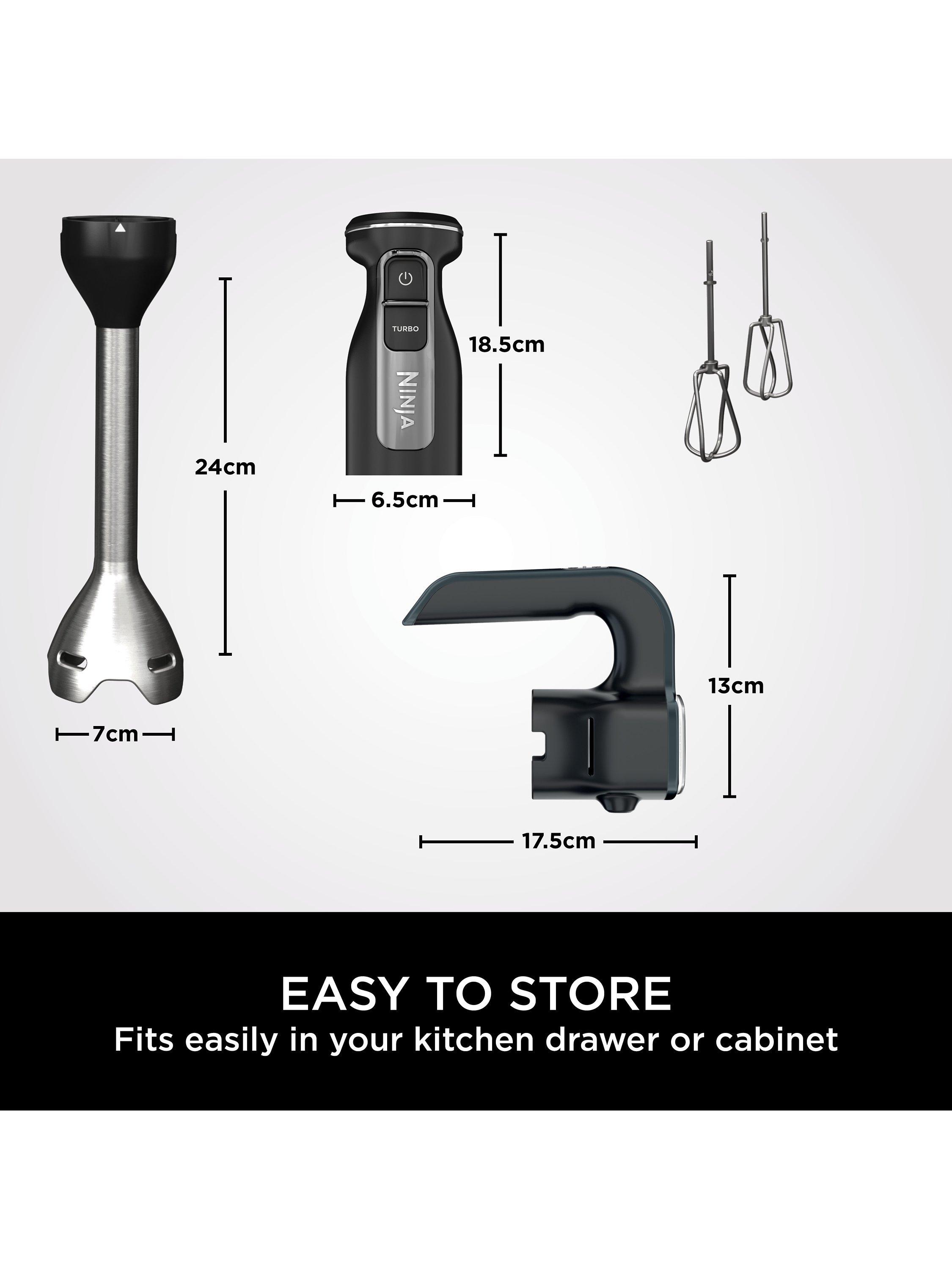 - With hand blender: H40.4 x W7.6 x D6.9 cm, with hand mixer: H24.3 x W8 x D12.5 cm