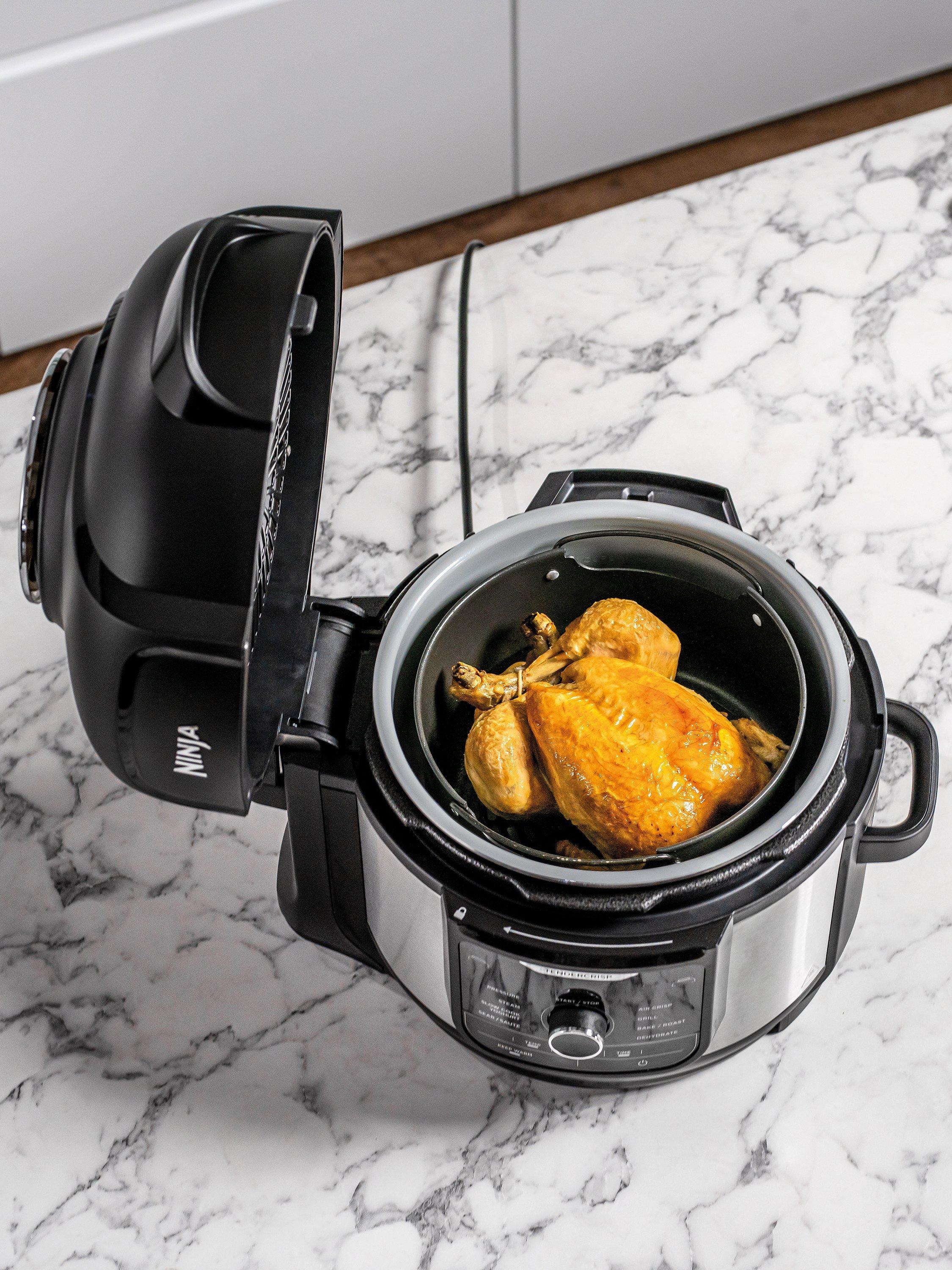 Easily switch between Pressure Cook, Air Crisp, Slow Cook, Steam, Bake/Roast, Sear/Sauté, Grill, Yoghurt and Dehydrate functions. Perfectly sized for up to 4 people, you can cook and crisp a whole 2kg chicken.
