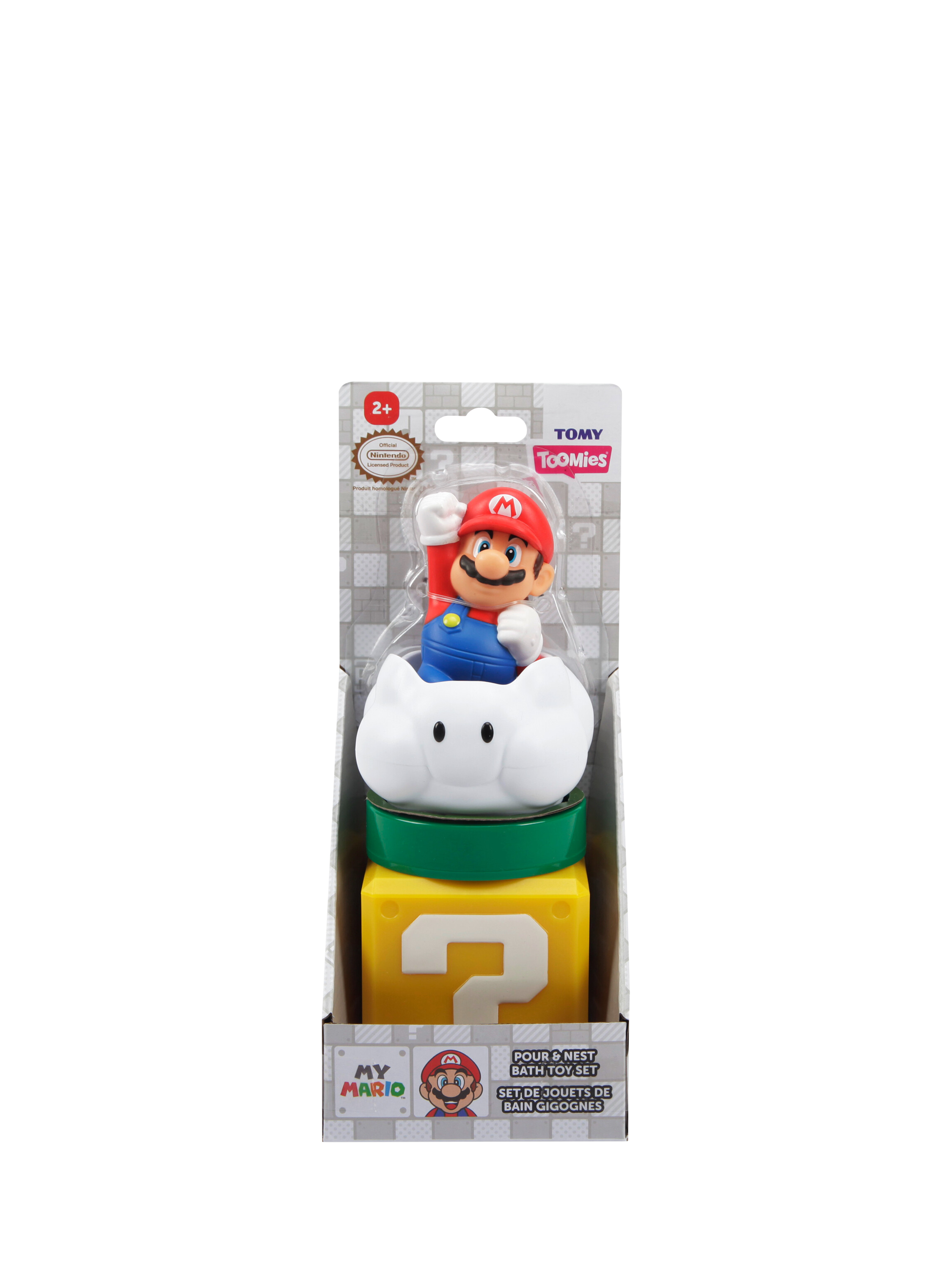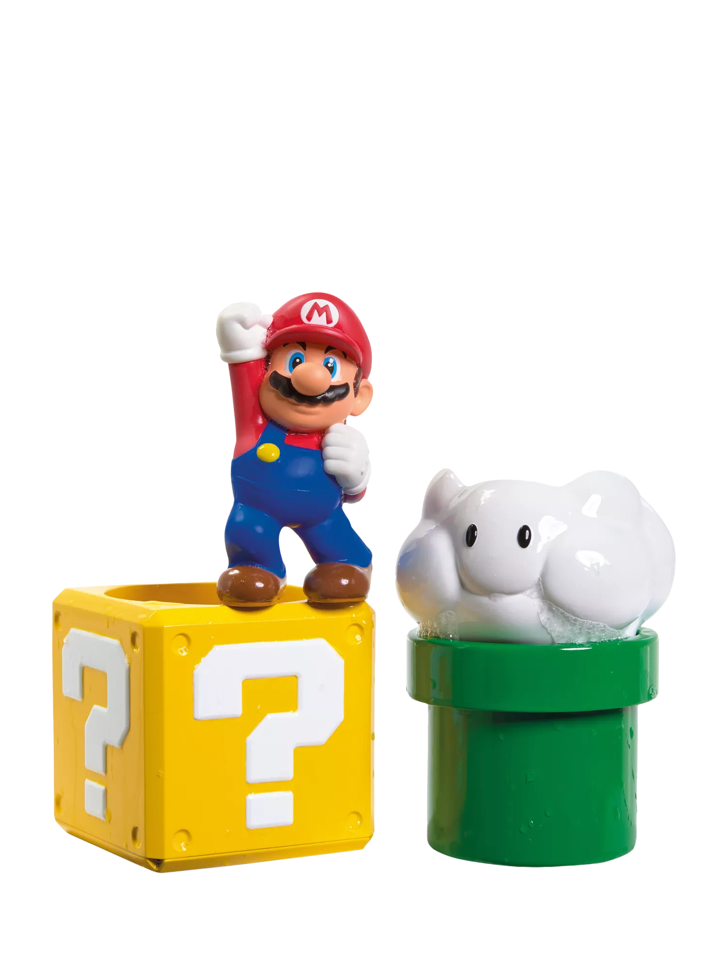 Nest, pour and squirt water with the Lakitu Cloud, Pipe, Question Block and our hero, the Mario Squirter! Watch water shower from the Lakitu Cloud, pour from the Pipe, fill and flow through the Question Block and give a cheeky squeeze with the Mario Squirter. Each piece is perfectly sized for little hands, making stacking, nesting and pouring easy and fun.