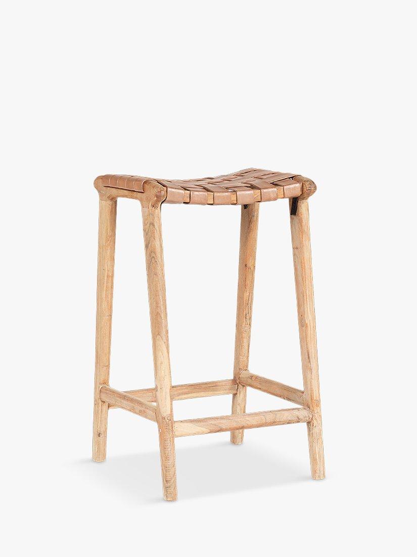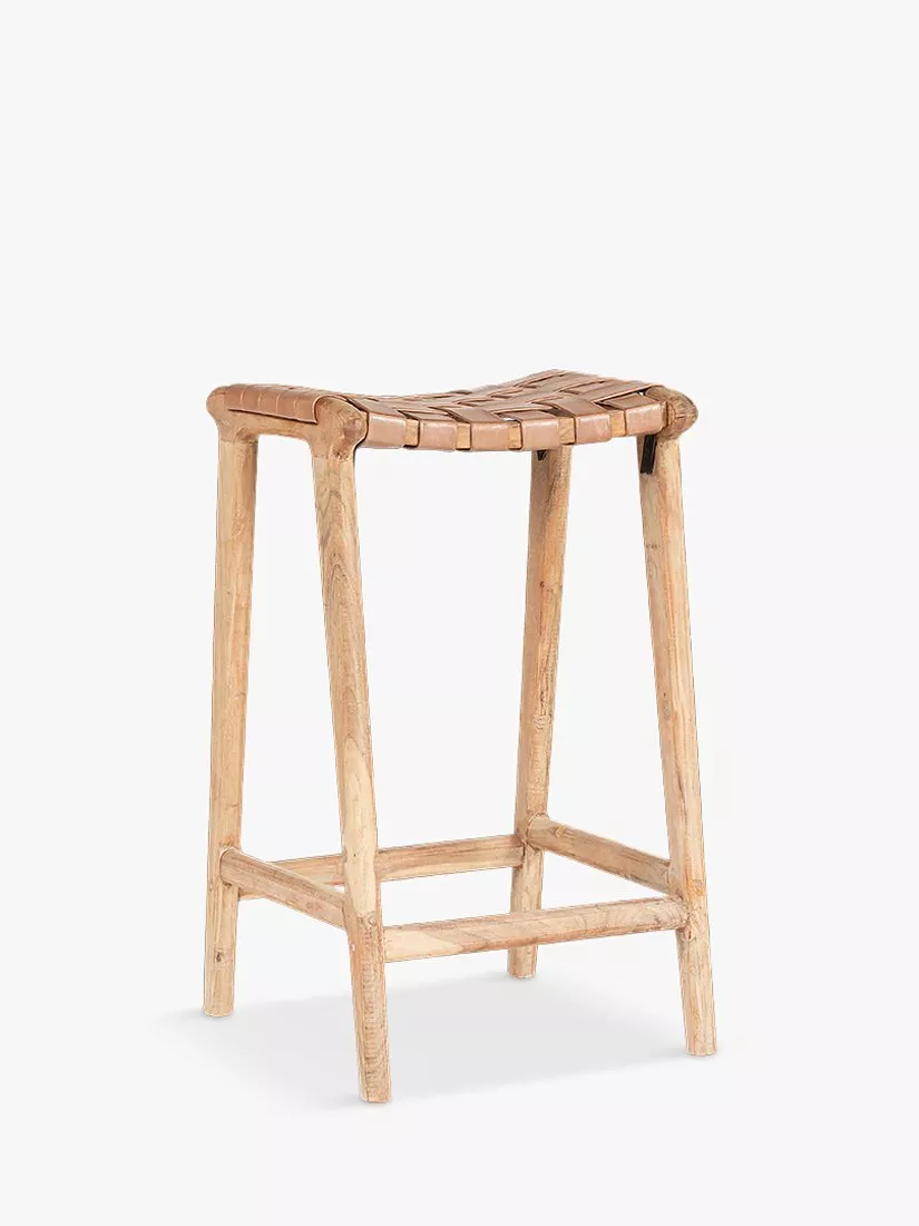 The Adembi woven leather counter-height stool is rich with character, from the weathered tone of the leather to the tactile woven pattern of its seat. The counter stool frame is crafted from acacia wood and finished with a textured sandblasted finish.
