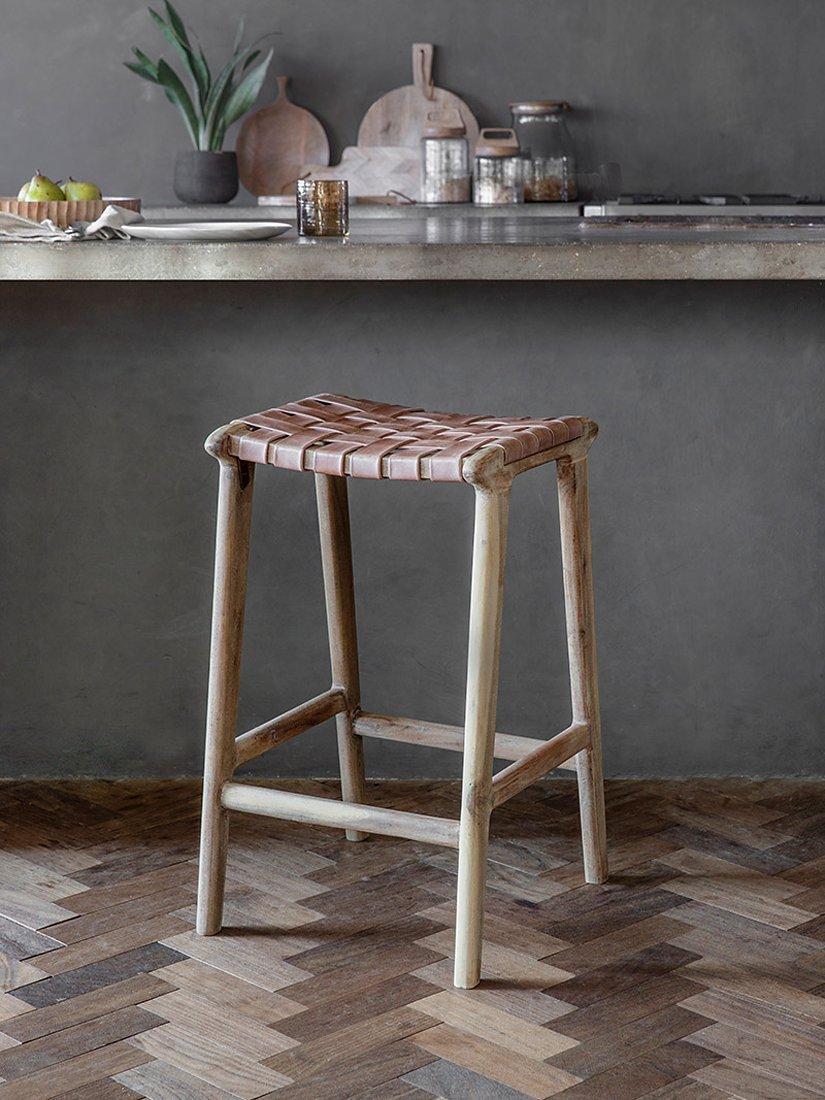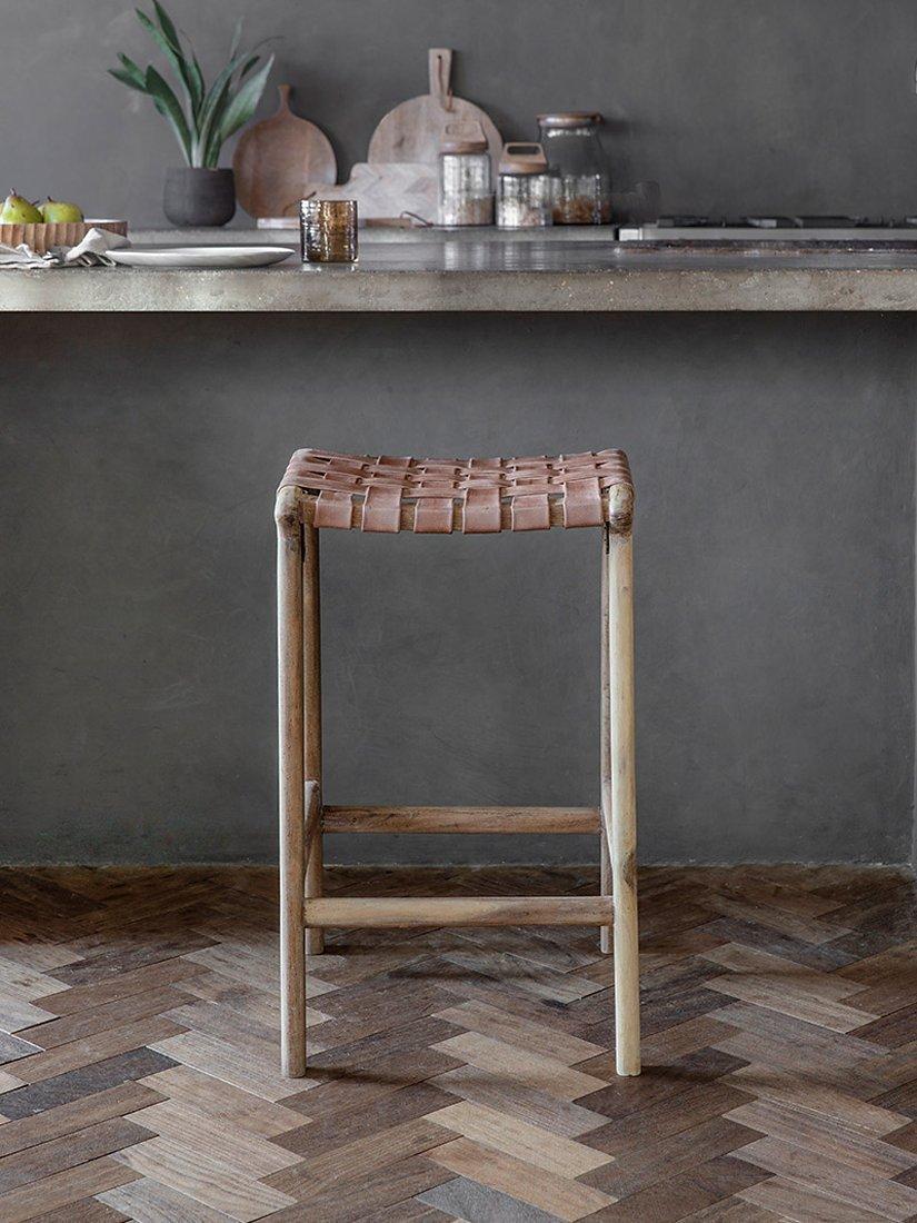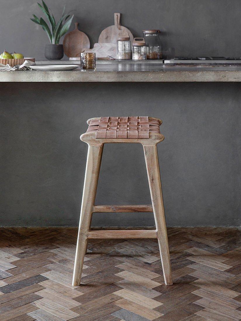 Goat leather is an enduring material that enhances with use over time and its durability makes it ideal for everyday use, while the tangible qualities make it comfortable and supportive. The woven pattern will add character to any kitchen or home bar space.