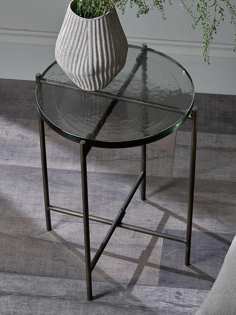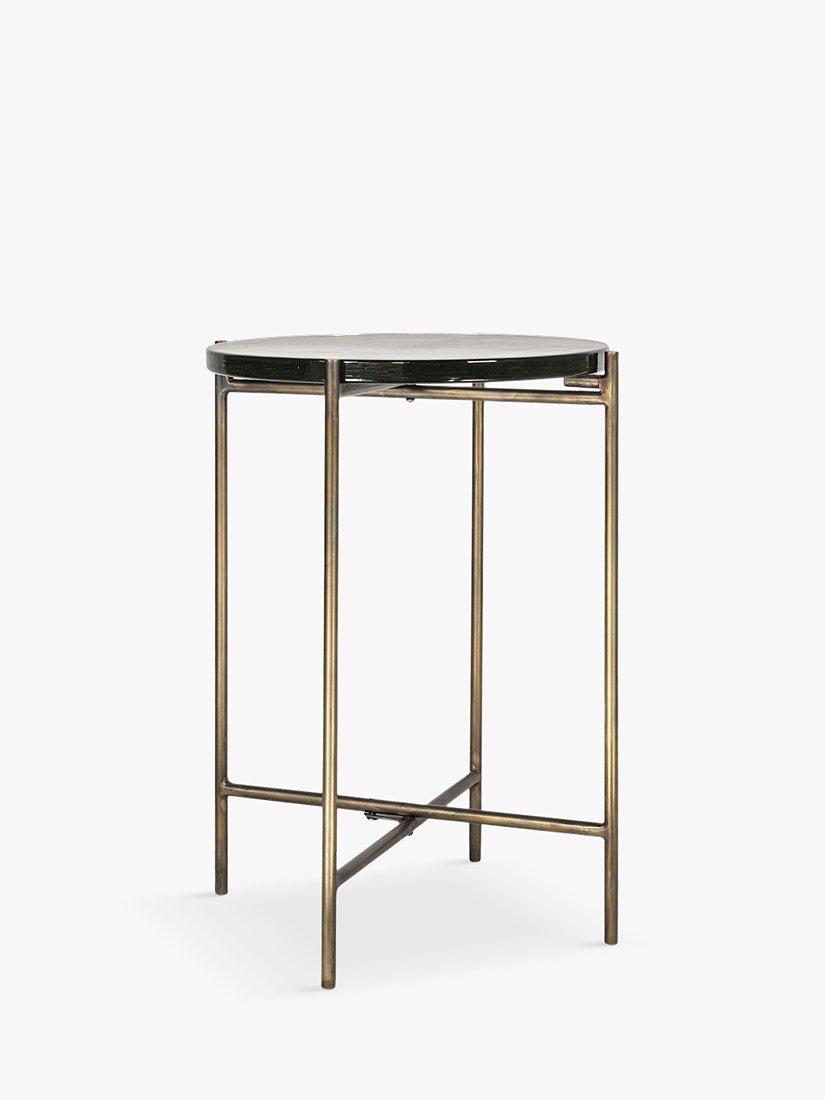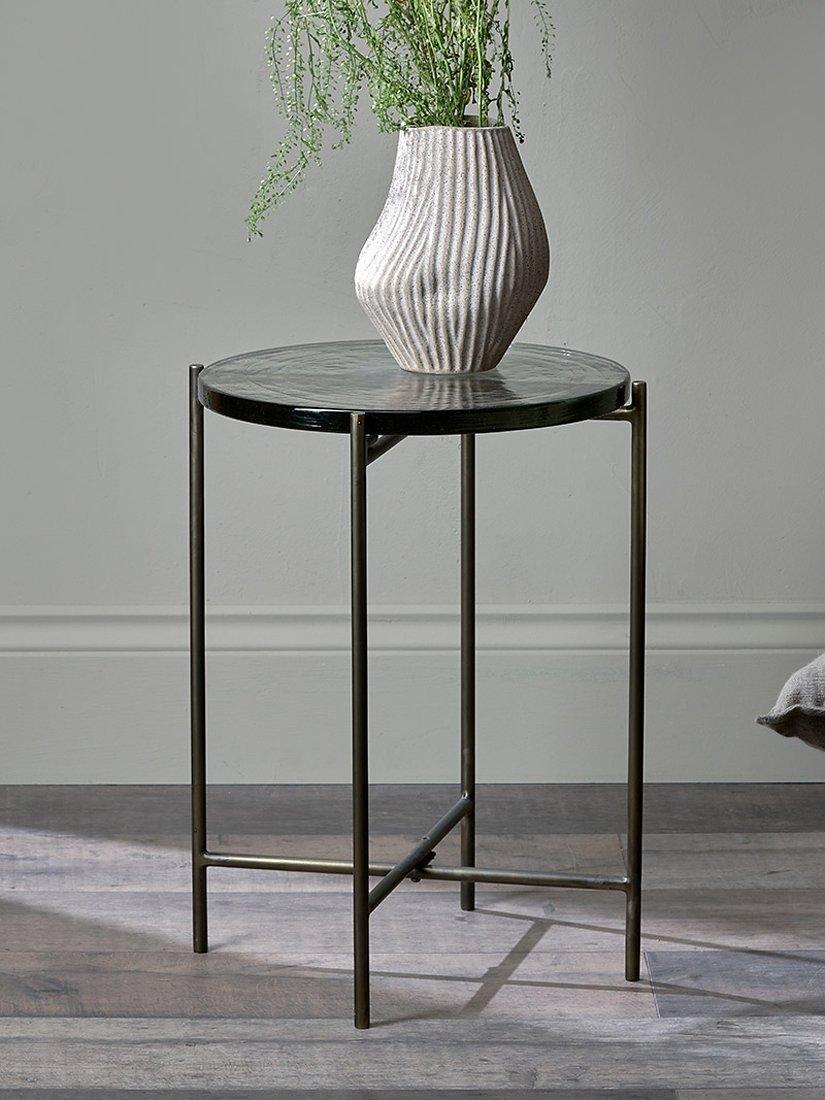 nkuku's sophisticated Aluva glass side table has a geometric, timeless design with a base forged from solid iron that has an antique brass finish. Perfect in any living space, place it next to a reading chair with a table lamp, or use it as an occasional table.