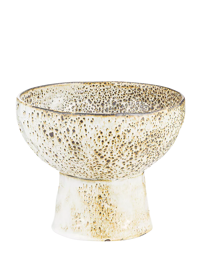The appealing organic shape marries perfectly with the irregular and varied finish of the reactive glaze. The soft, speckled brown undertones subtly blend with the appealing off-white glaze to stunning effect and the raised stand elevates the bowl to a showpiece, be it as a standalone decorative bowl or for more practical use.