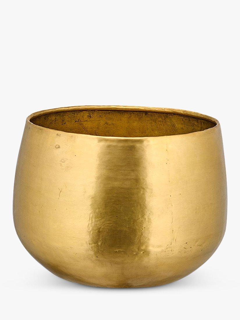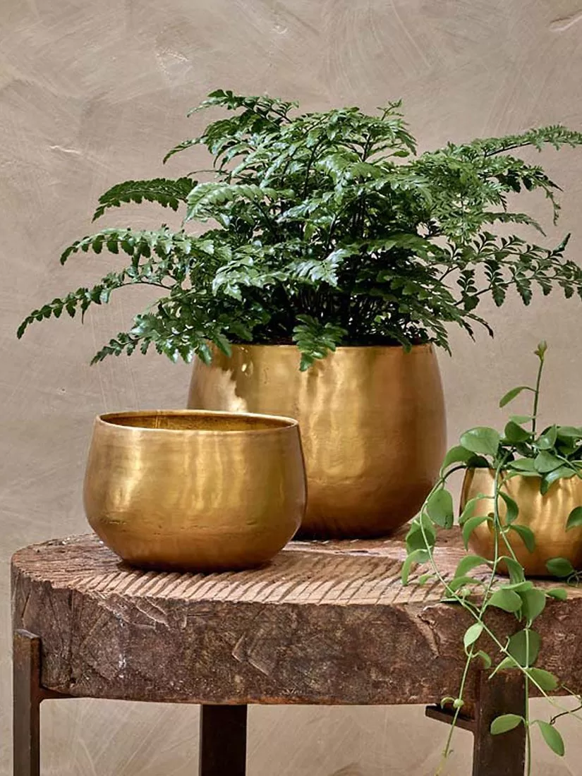 The Nkuku Atsu planter in antique brass adds a pop of colour and warmth to your home interior with its golden hues. These planters look great on their own, or together with a mix of sizes, plants and foliage. They're handmade by skilled artisans in India using age-old methods and traditional tools.