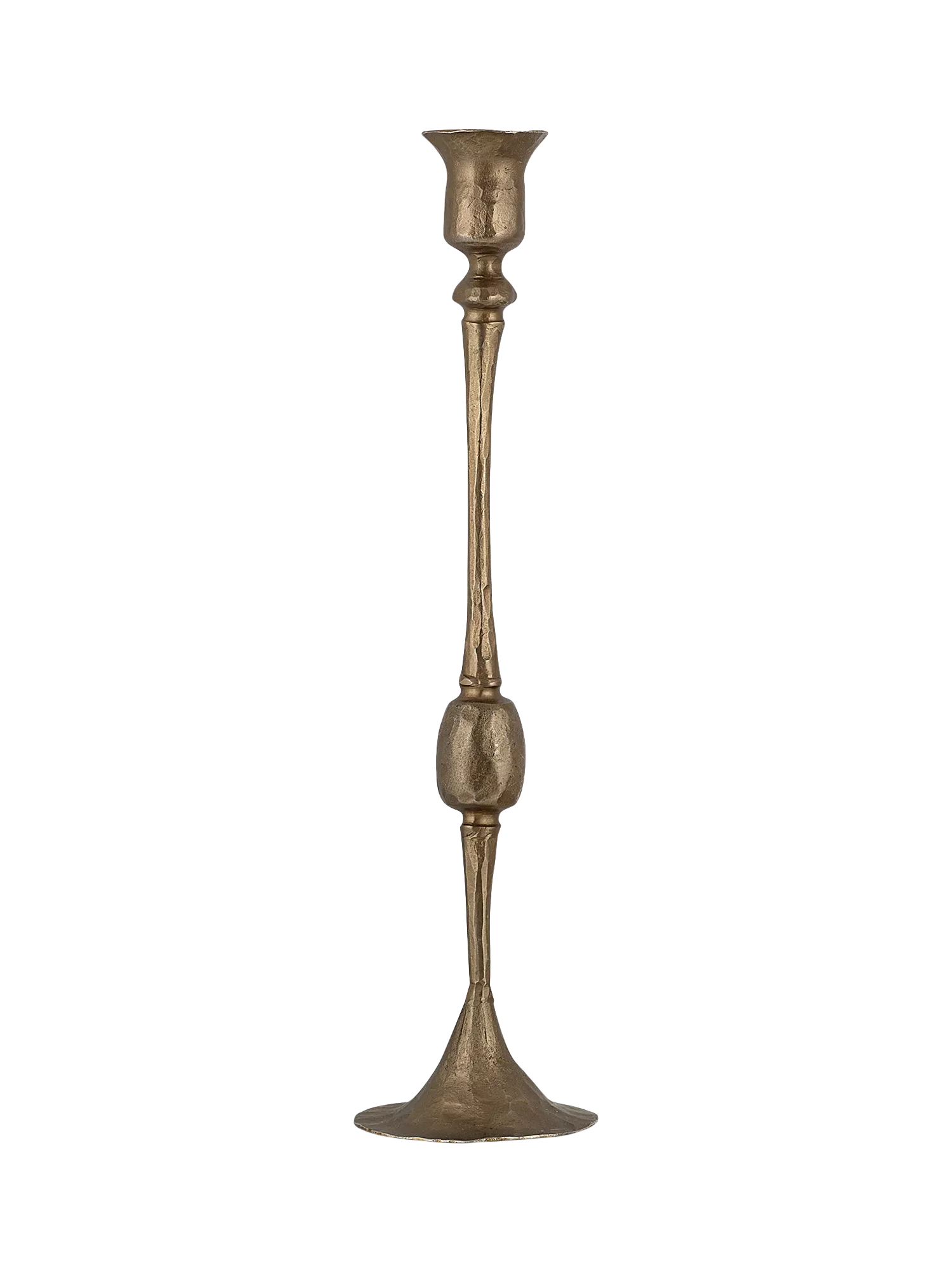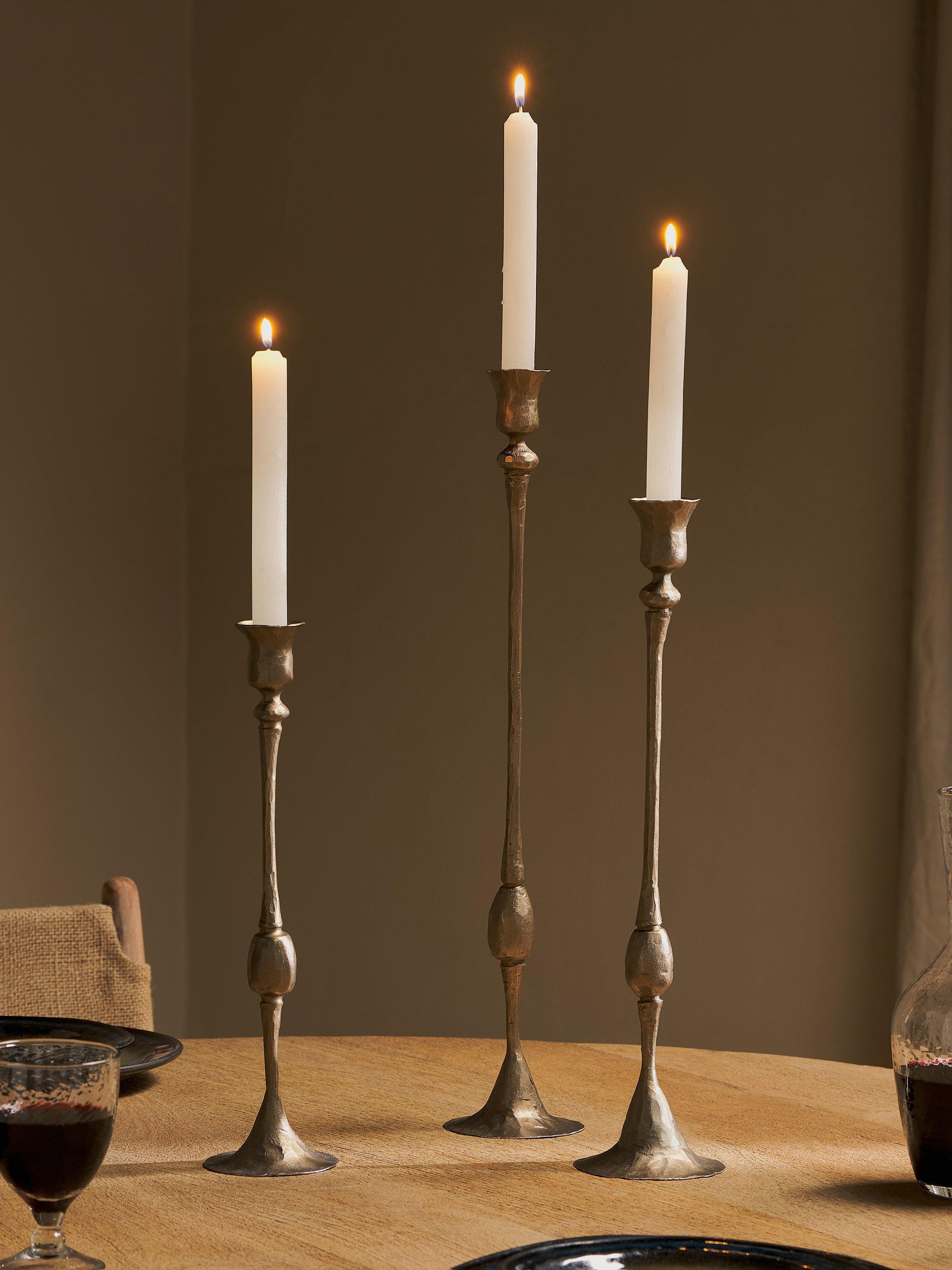The Chaipat Candlestick adds elegance to a table setting with its slender proportions, considered design features and classic style. Made in cast aluminium with an antique brass finish, it is hammered by hand to create a rustic, relaxed effect. The design adds height to a dining table and creates an eye-catching tabletop display.