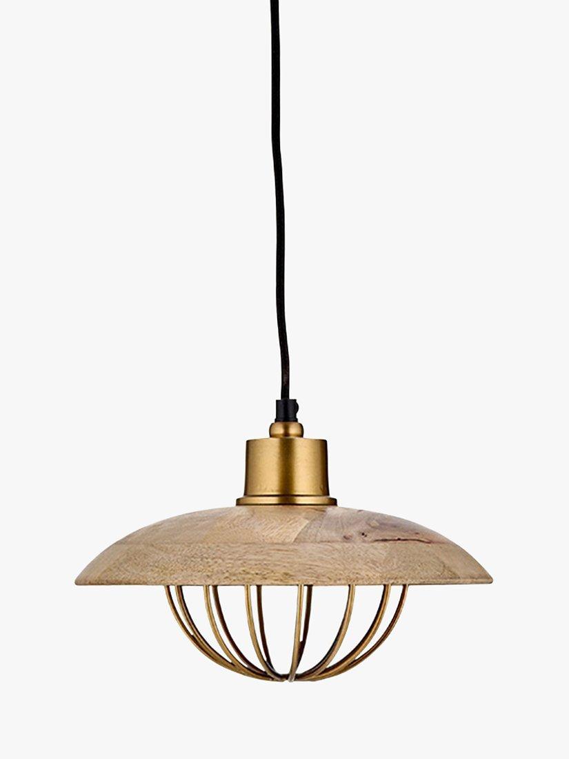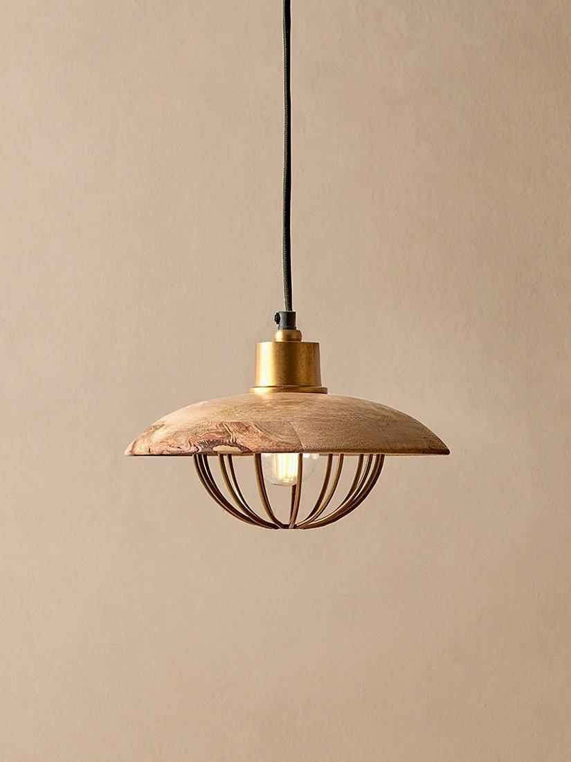 The Chakai pendant light showcases brass and wood, the warm tones of the brass pair beautifully with the natural grain of the mango wood shade. Ideal positioned over a dining table or kitchen island and an elegant statement in a living room.