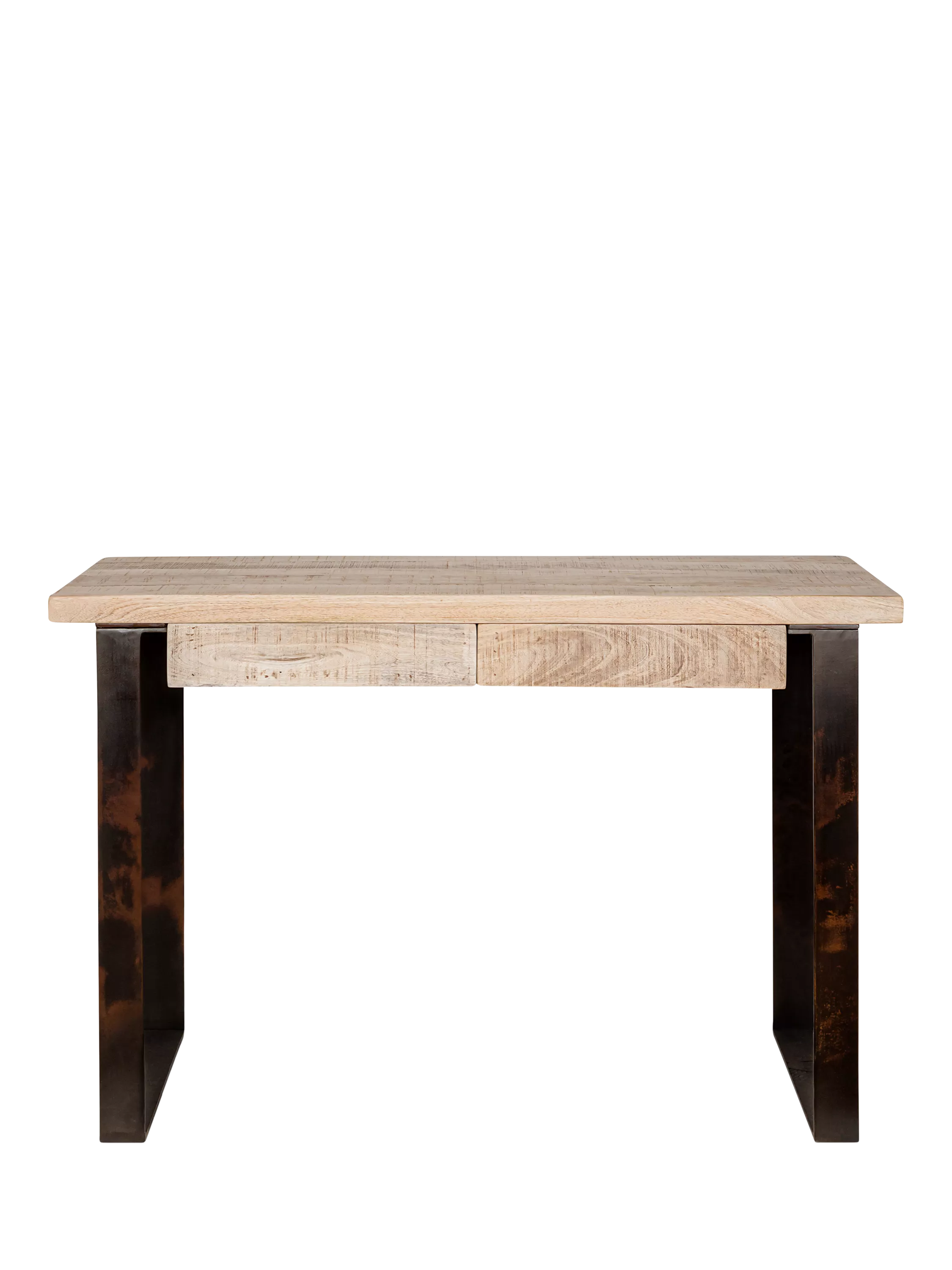 Crafted from mango wood, the natural characteristics of the grain shine through, and the patina of the iron has subtle colour variations that contrast and complement one another. The slimline dimensions make this the perfect desk for a living room or where space is at a premium and the two drawers open from below, keeping the smooth silhouette intact.