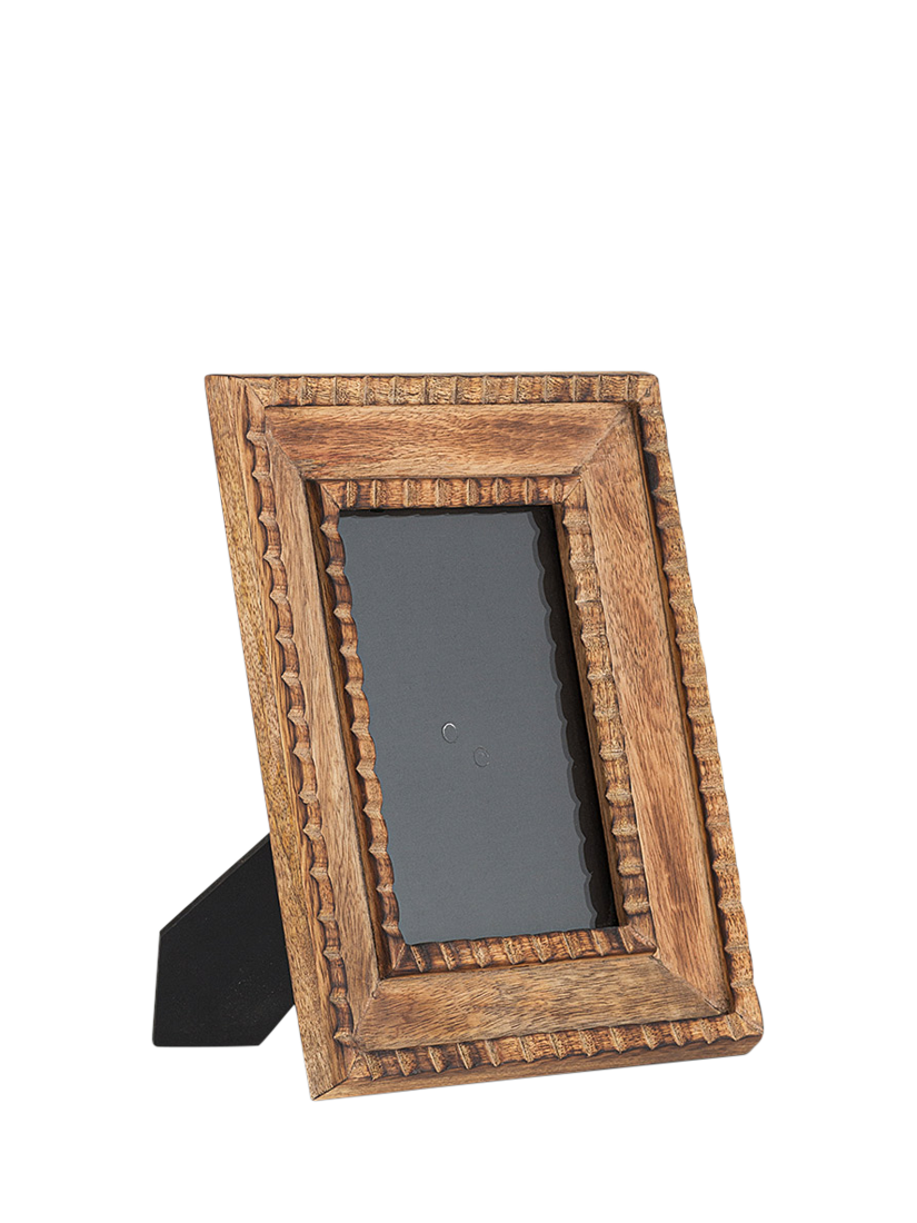 This functional and stylish frame is crafted from mango wood that is finished with a warm, dark stain to highlight its natural beauty. Hand-carved design details make each frame unique.