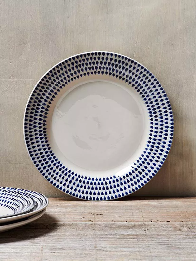 The nkuku popular Indigo Drop ceramic collection of tableware and serveware is made by skilled artisans in Vietnam. Every stage of the production process is done by hand using traditional tools and techniques, from shaping the white clay on a traditional potter's wheel to painting each individual drop around the rim freehand.
