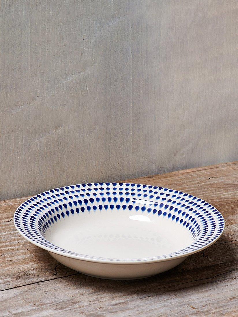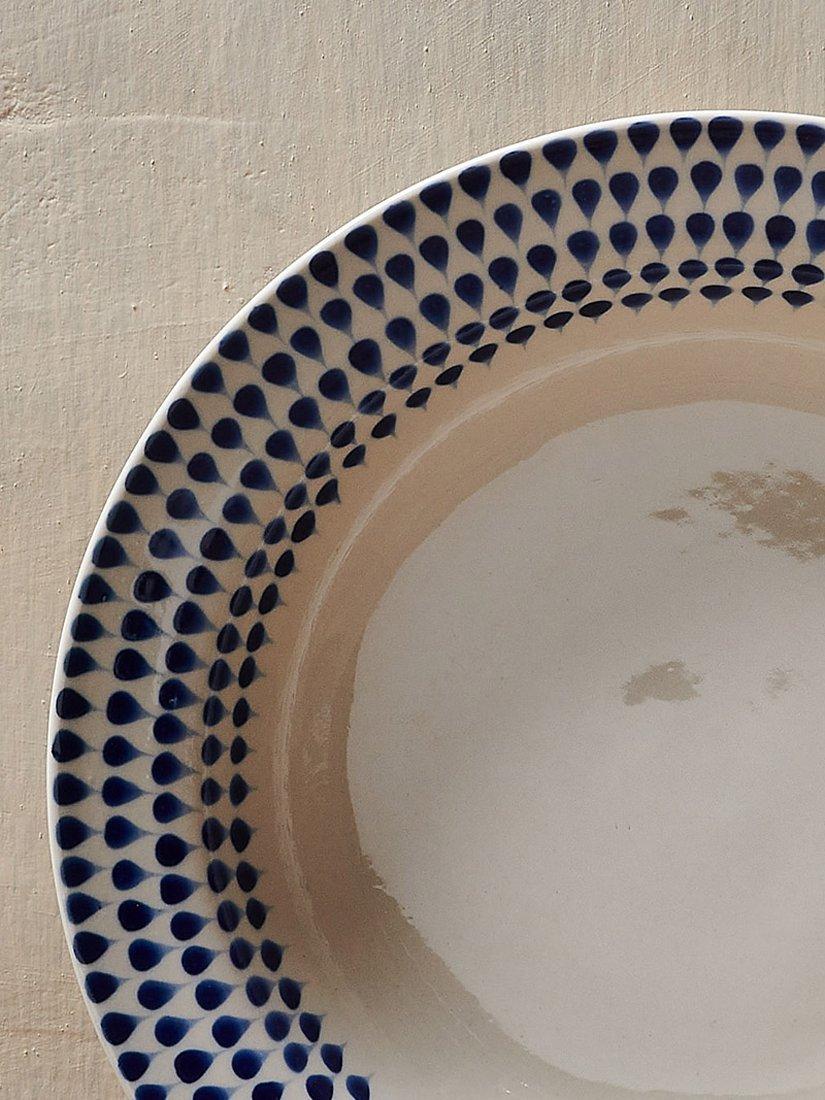 The nkuku popular Indigo Drop ceramic collection of tableware and serveware is made by skilled artisans in Vietnam. Every stage of the production process is done by hand using traditional tools and techniques, from shaping the white clay on a traditional potter's wheel to painting each individual drop around the rim freehand.