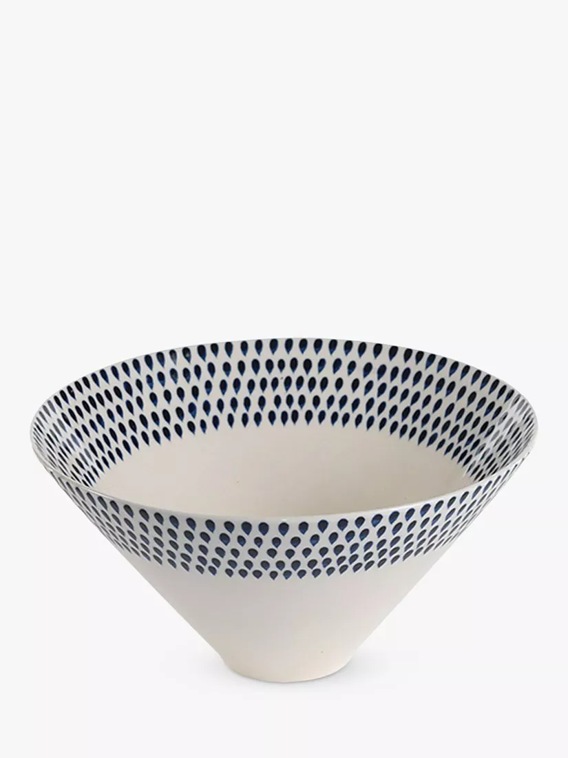 The nkuku popular Indigo Drop ceramic collection of tableware and serveware is made by skilled artisans in Vietnam. Every stage of the production process is done by hand using traditional tools and techniques, from shaping the white clay on a traditional potter's wheel to painting each individual drop around the rim freehand.