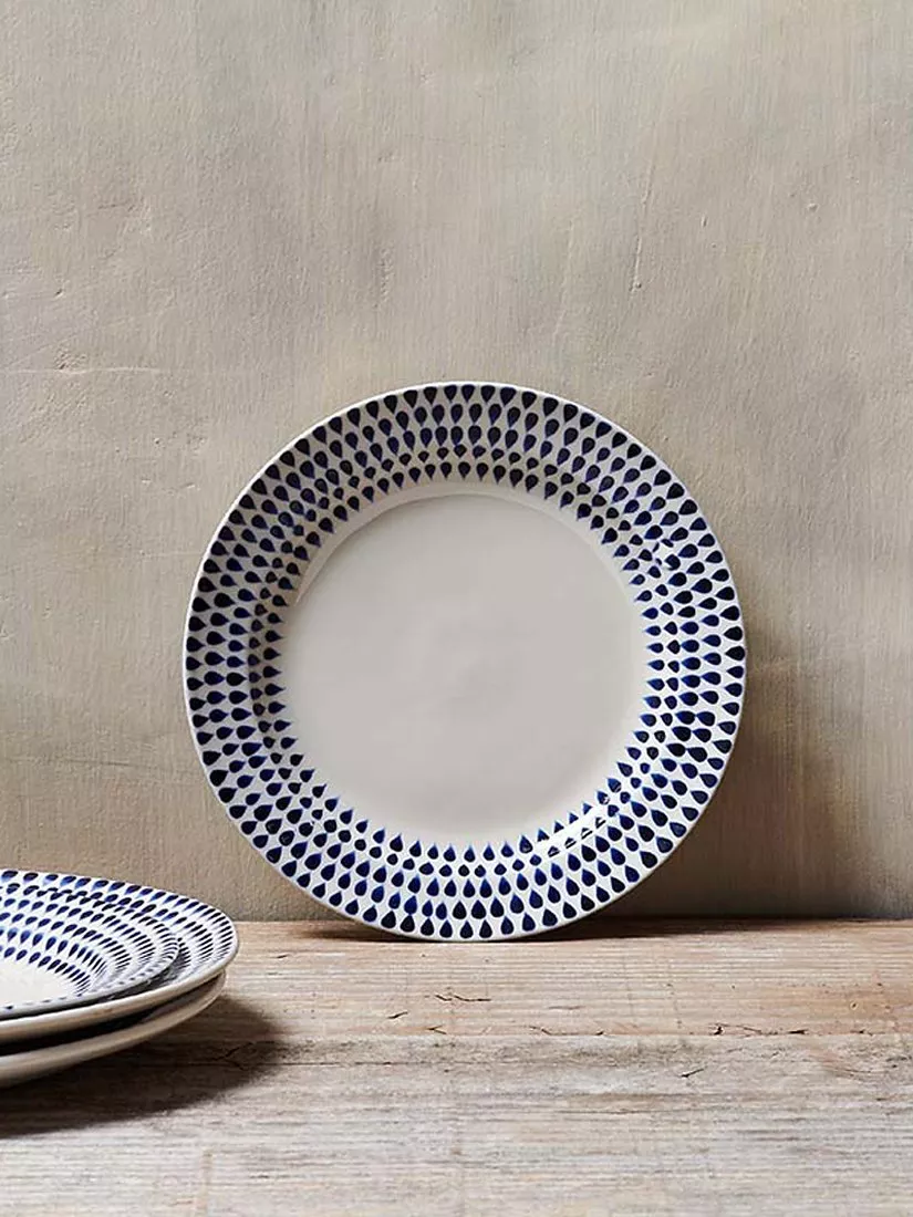 The nkuku popular Indigo Drop ceramic collection of tableware and serveware is made by skilled artisans in Vietnam. Every stage of the production process is done by hand using traditional tools and techniques, from shaping the white clay on a traditional potter's wheel to painting each individual drop around the rim freehand.