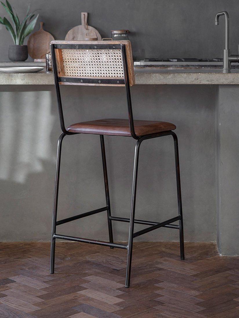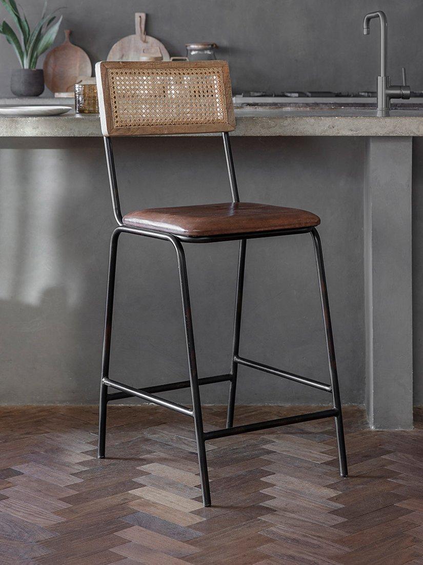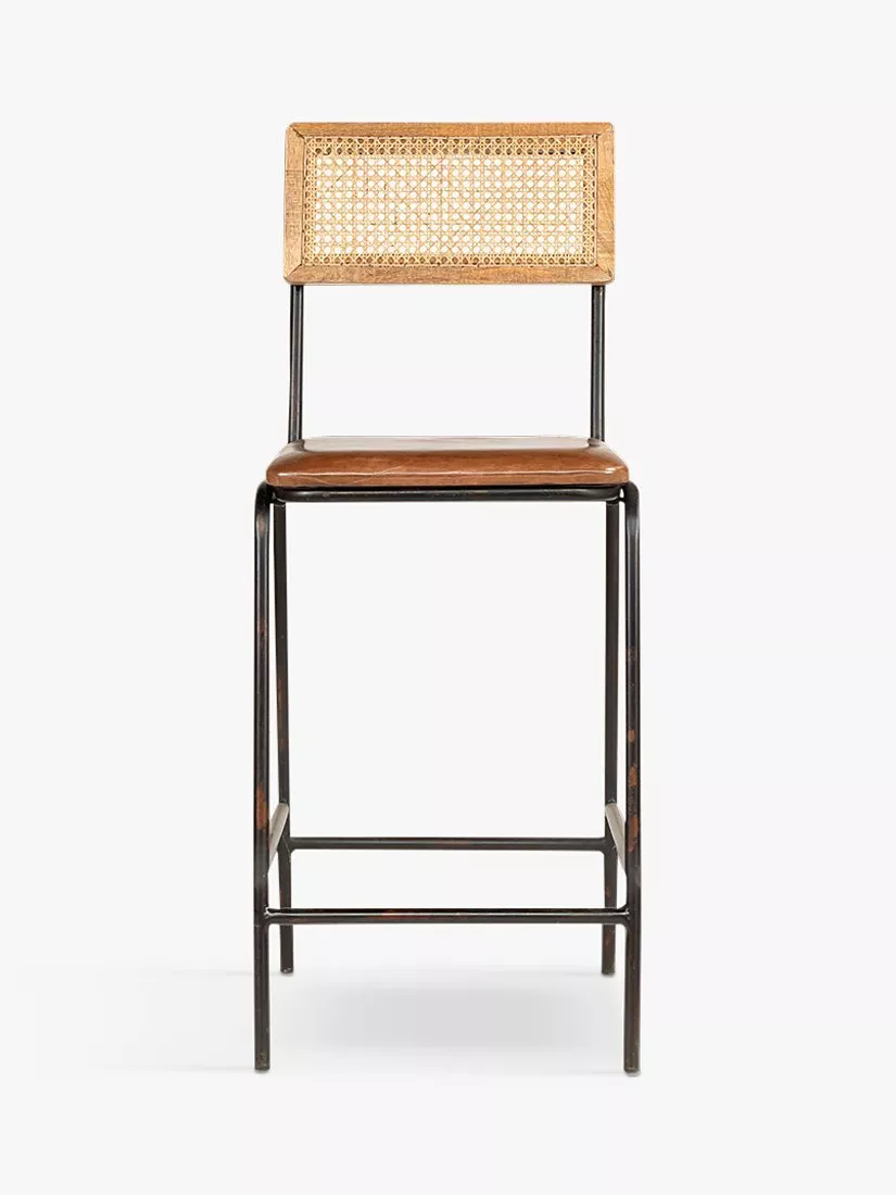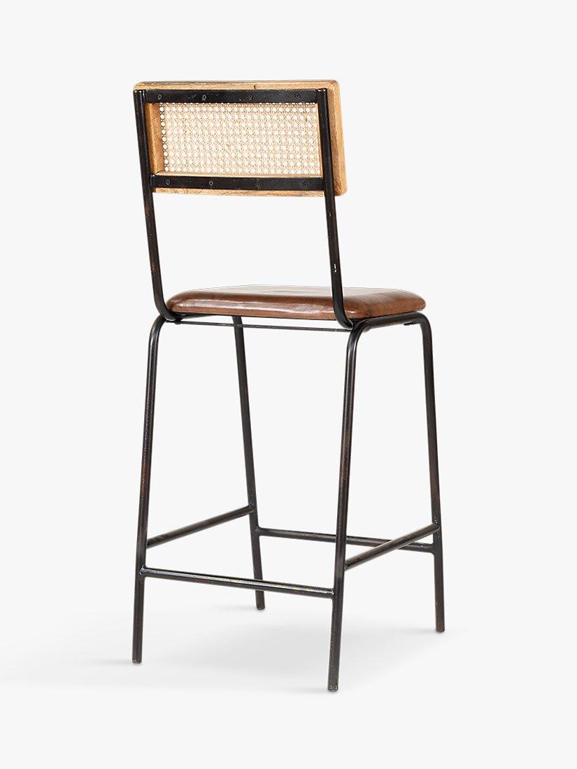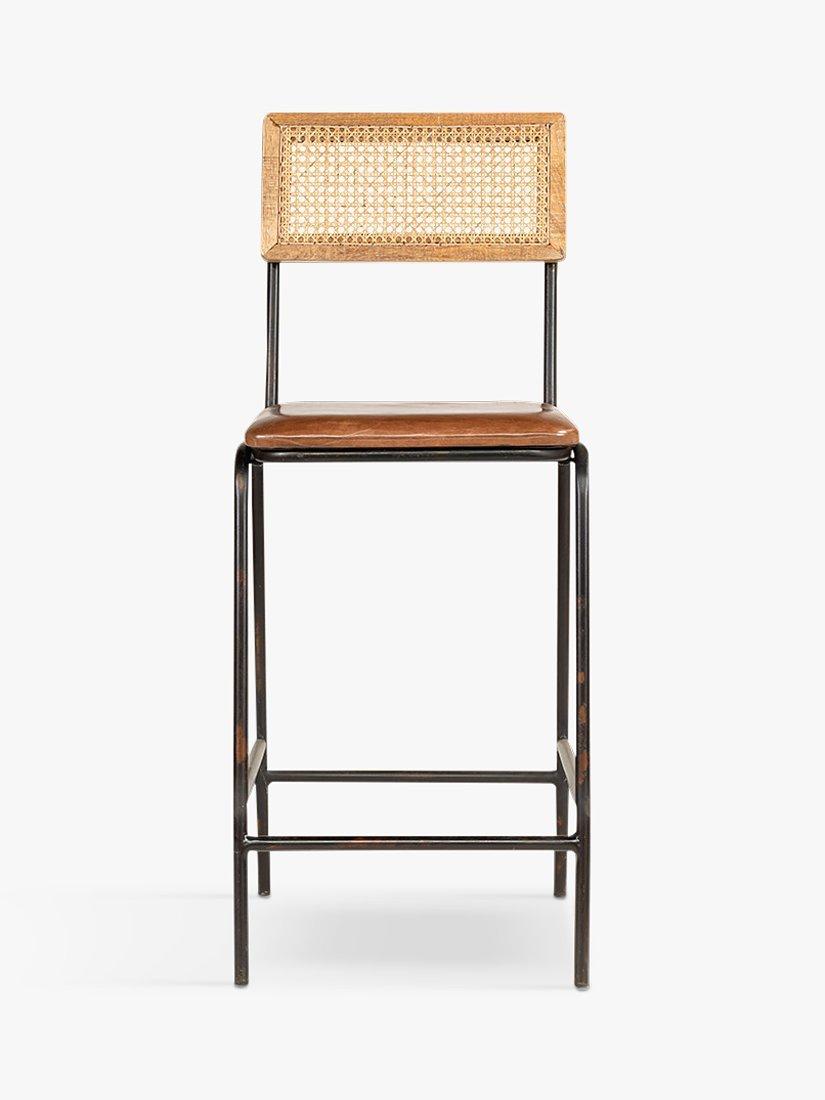 The Iswa counter chair combines a natural woven cane back with tactile tanned goat leather. This comfortable counter-height stool benefits from a soft padded seat complemented by the delicate detailing of the cane back, framed in the warm natural tones of mango wood.