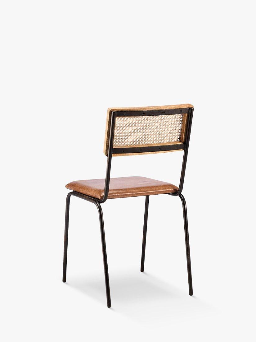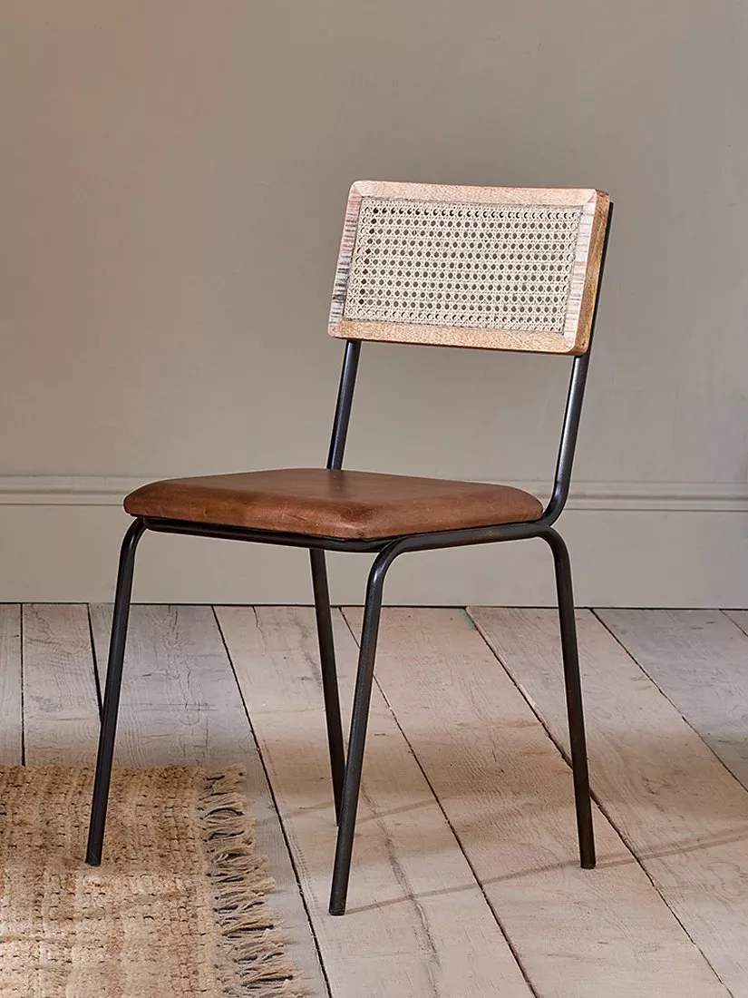 Designed with a sturdy iron welded frame and an aged leather padded seat, it's both comfortable and stylish. The back features woven rattan, framed with a natural mango wood surround.