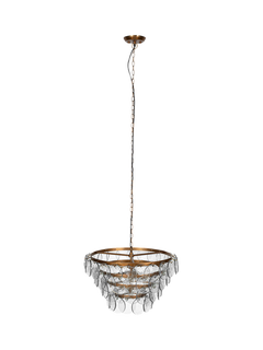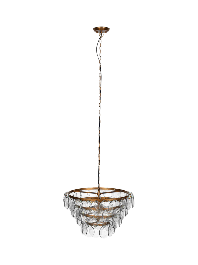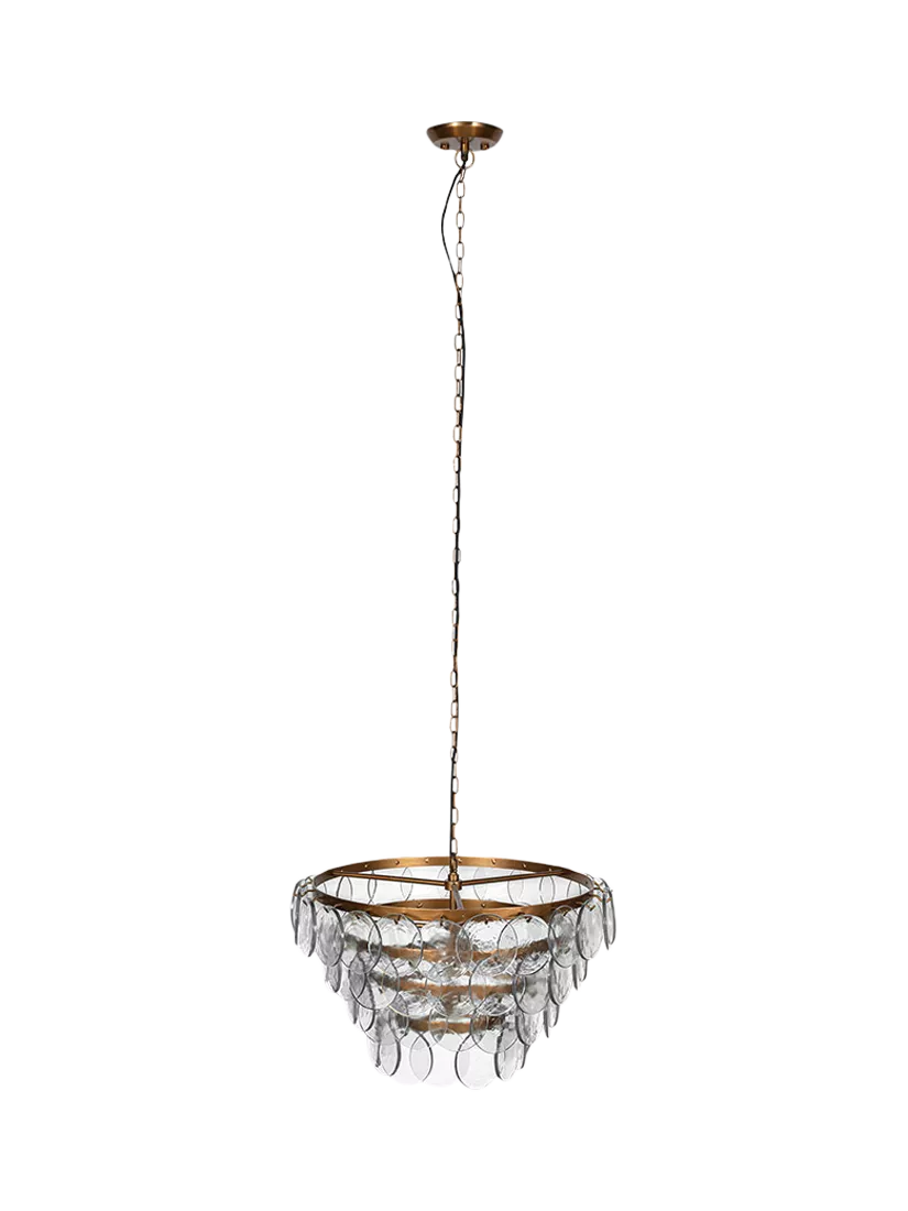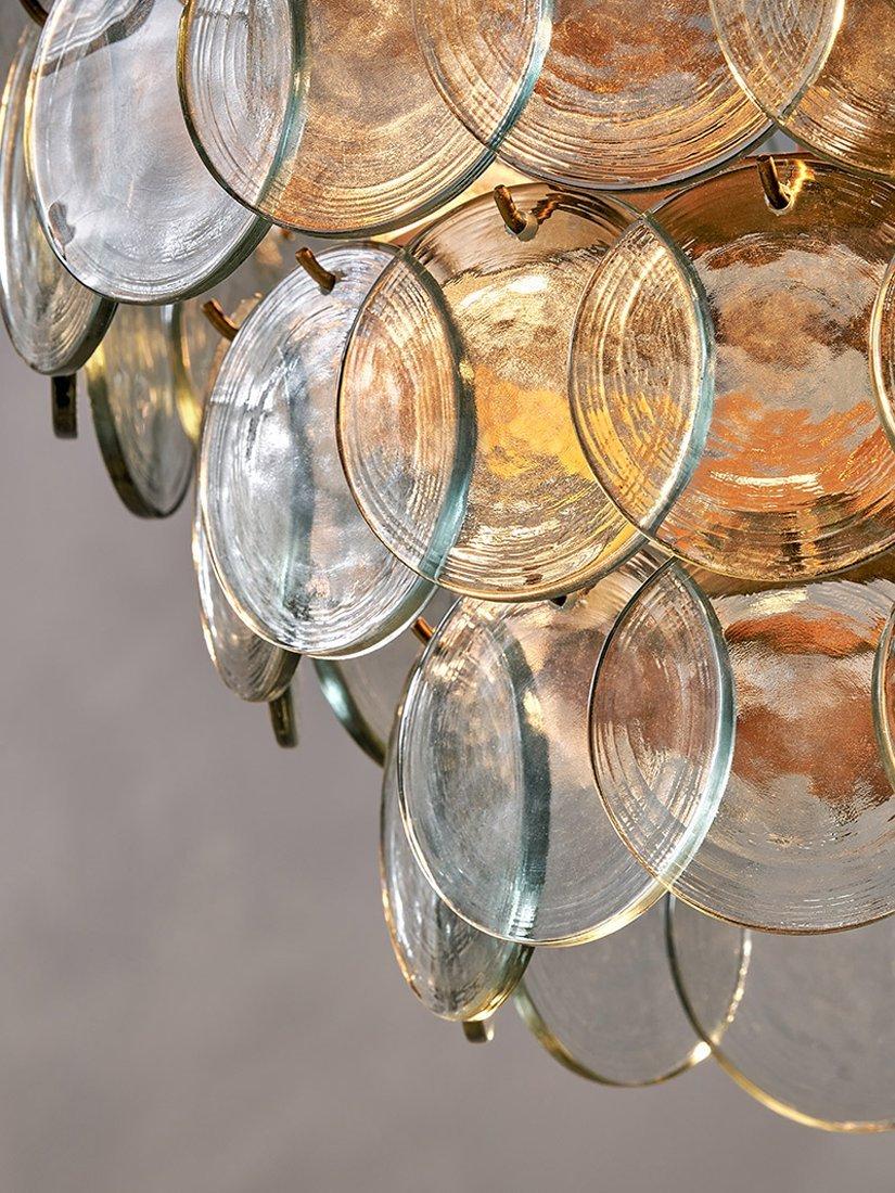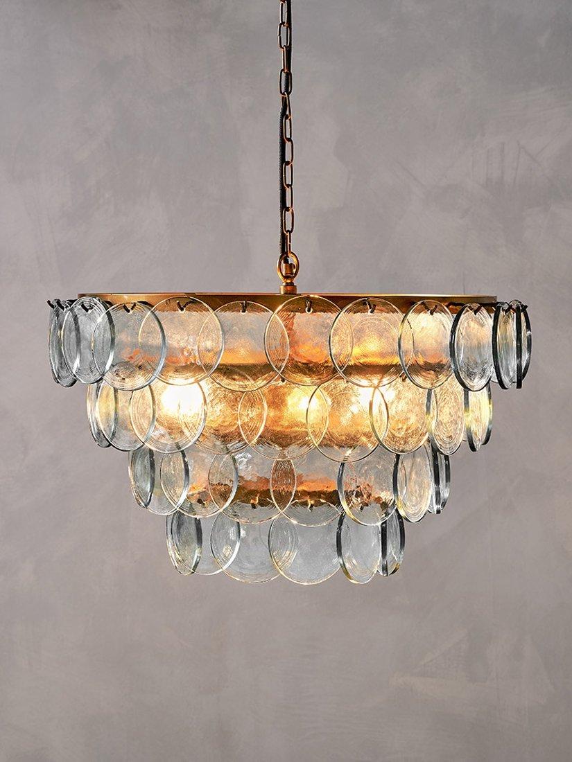 The Kagitha chandelier is an elegant and striking statement piece. Crafted with care, each glass disc is individually pressed, making each piece entirely unique. The layers of glass delicately diffuse light, adding a soft textured ambiance to any room.