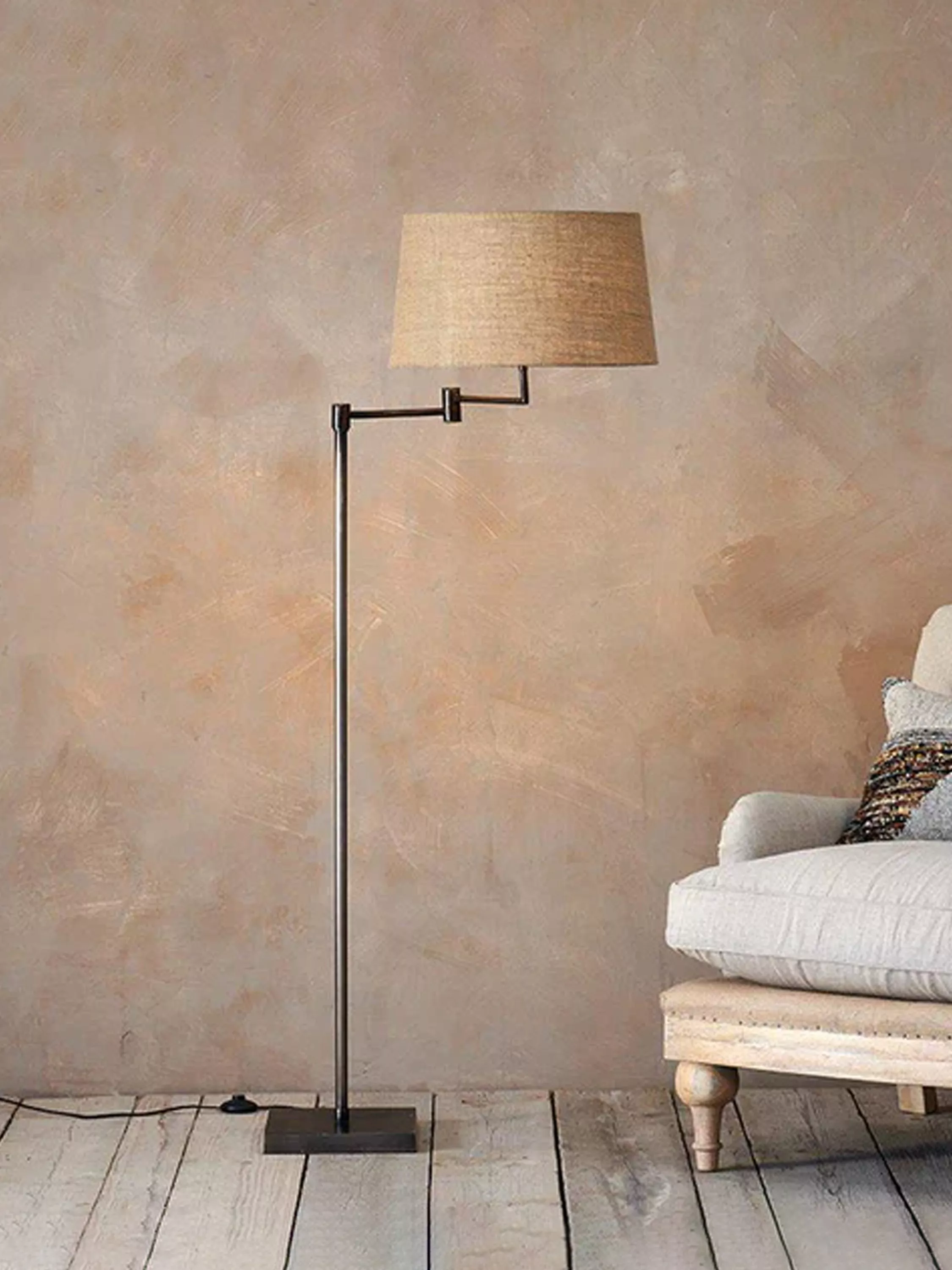 The stand is handmade from metal and has a smooth finish, offering a timeless design. It features a black coloured cord with a floor light switch. Once on, the lamp creates a beautiful, ambient lighting effect.