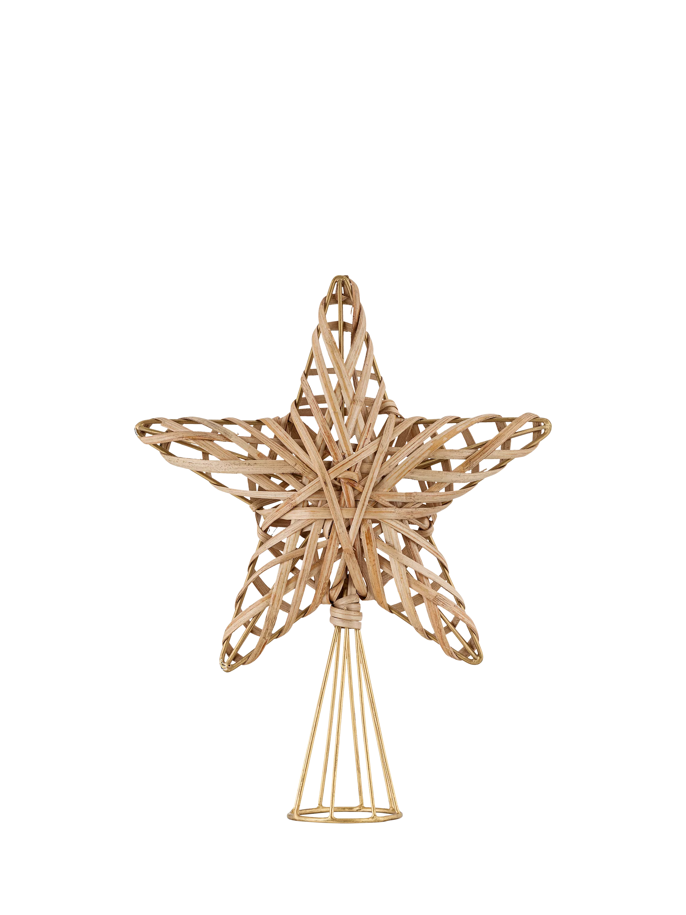 The Katuna topper is made from woven cane wrapped around a gold wire base. A naturally pale material, the cane weaves beautifully to create a sturdy and striking finish for a pared-back festive piece that stands out against dark green foliage.