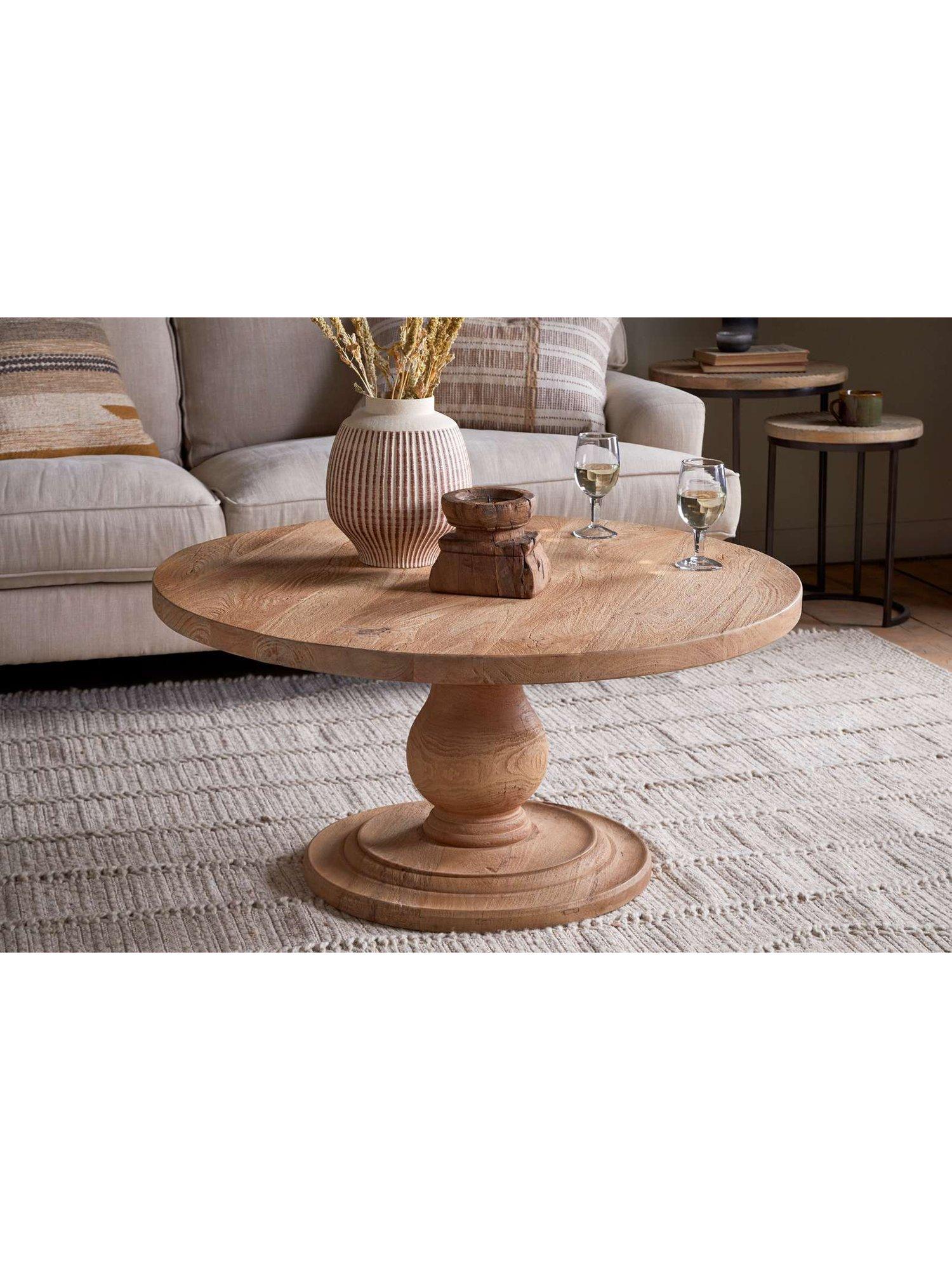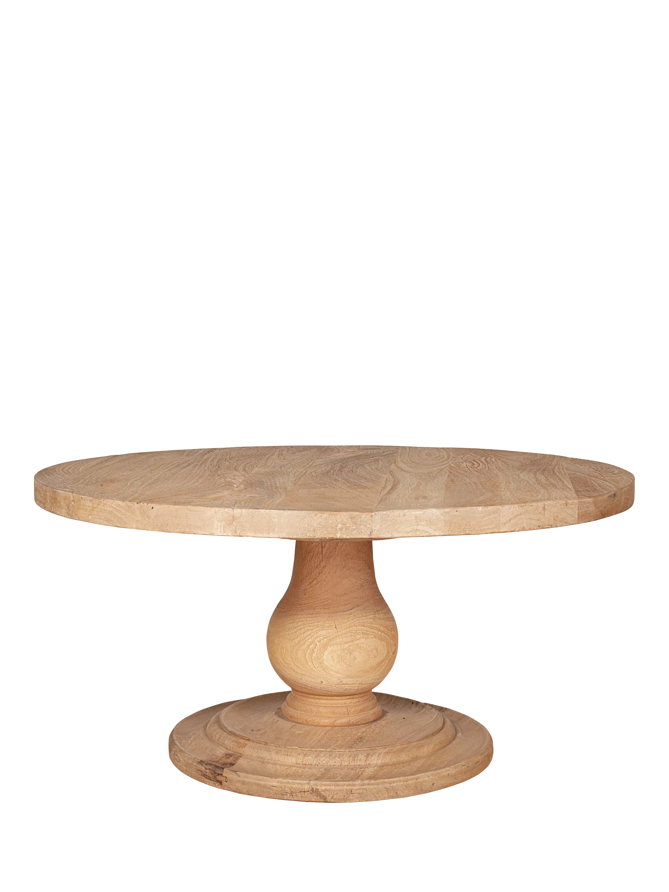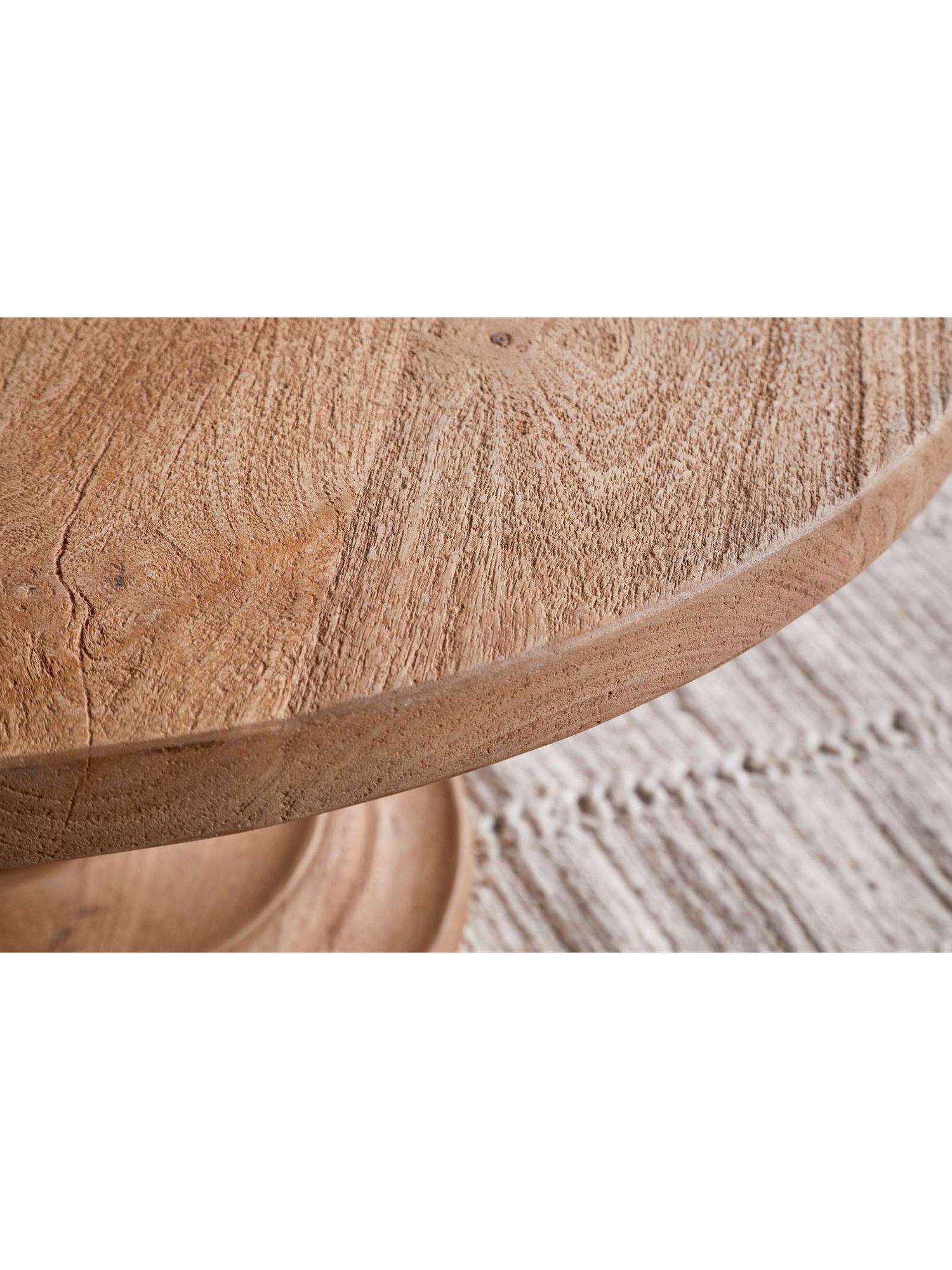 With its distinctive silhouette and generous proportions, the Laya coffee table makes a striking centrepiece. The circular tabletop rests on an elegantly shaped base, creating a balanced and sculptural form. A raw wood finish enhances the natural grain and knots, bringing warmth and texture to your space.