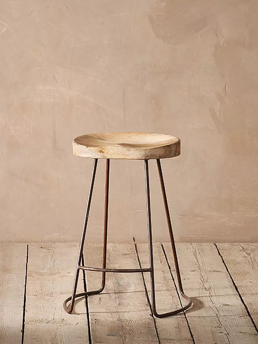 The Nkuku Loko stool combines a beautifully crafted mango wood seat with a sturdy, round iron frame to create a comfortable and stylish stool.