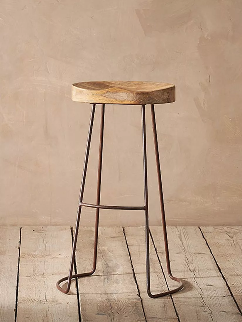 The Nkuku Loko stool combines a beautifully crafted mango wood seat with a sturdy, round iron frame to create a comfortable and stylish stool.