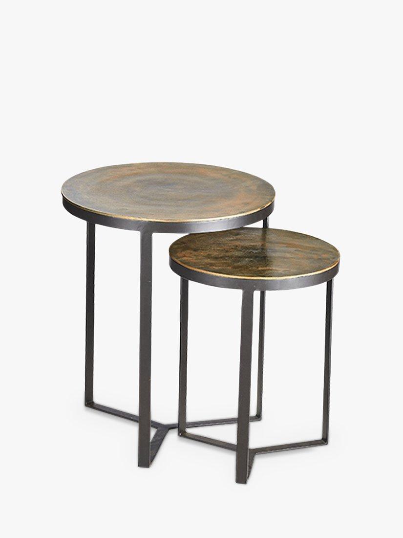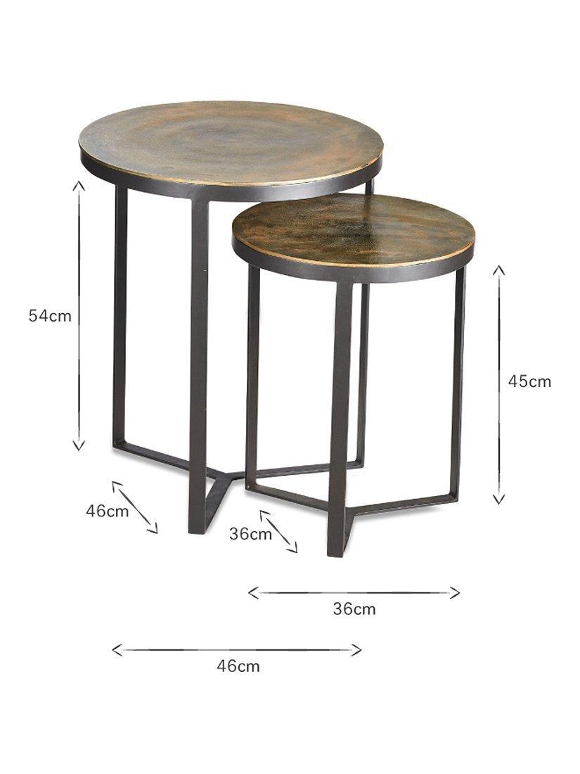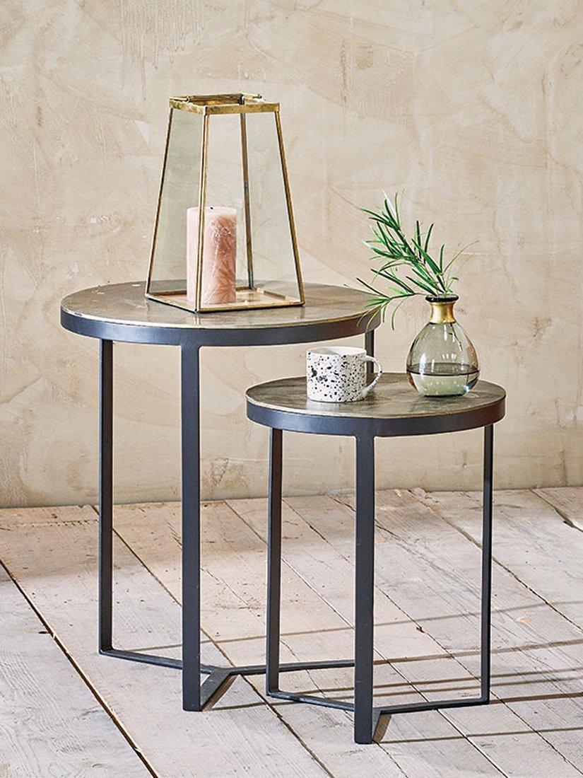 The nkuku Maba nesting side tables are full of character. The antique brass tops paired with the angular iron frames create a timeless piece of furniture that will blend in beautifully with your living room. The smaller table nests neatly under the larger one, offering two different heights and providing flexibility.