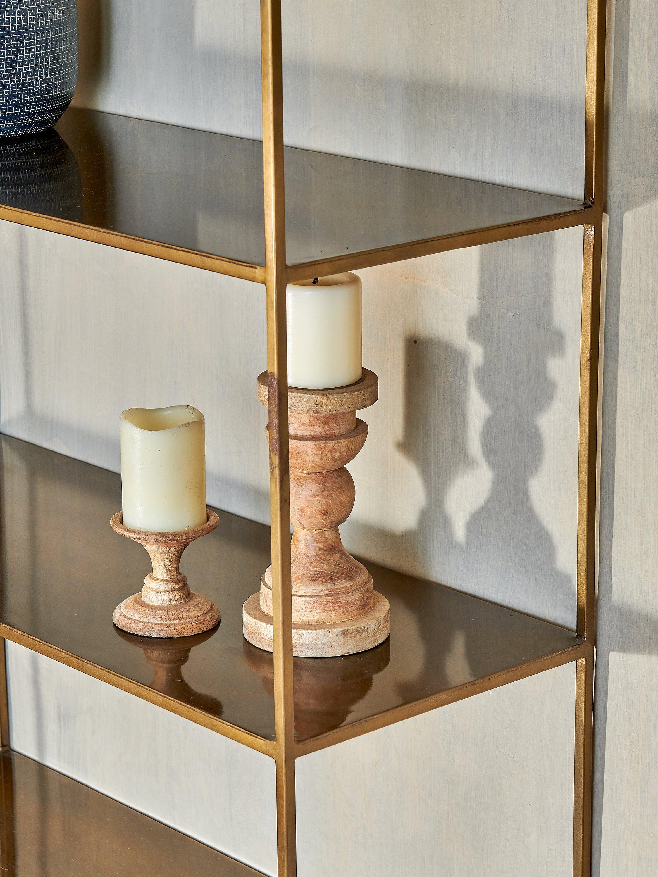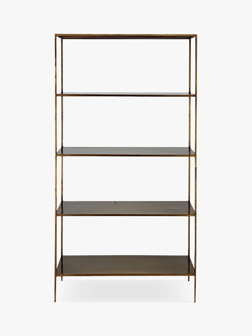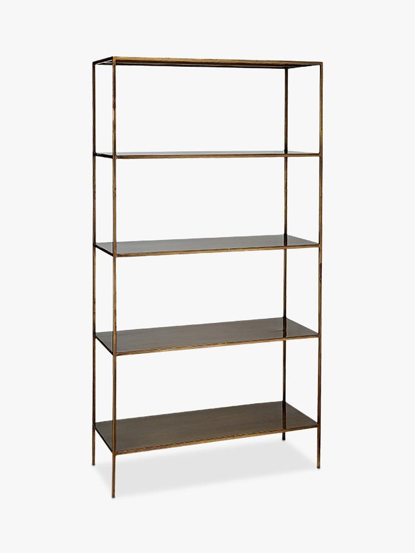 The nkuku Mahi shelving unit is made from high-quality iron in a brass finish and offers four handy shelves, creating a sturdy solution for both display and storage. nkuku works with artisans throughout the world, combining timeless design with traditional skills and natural materials.