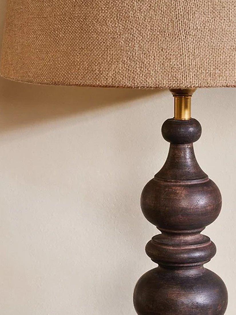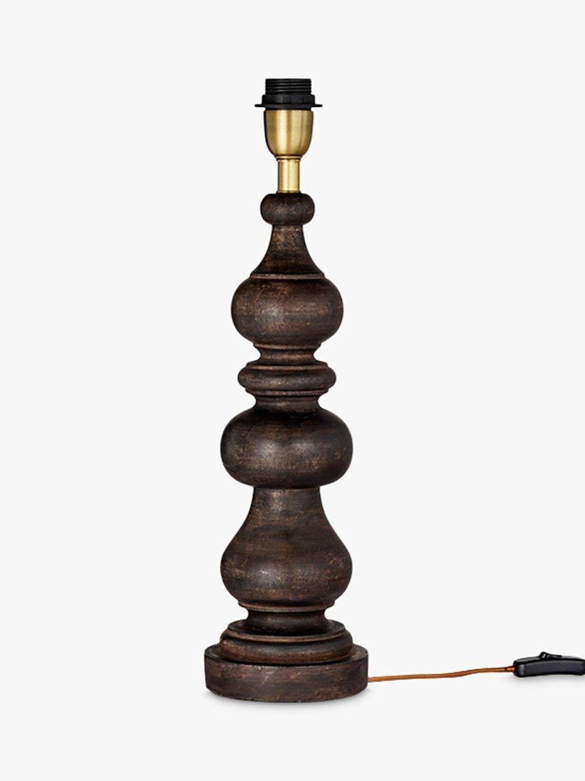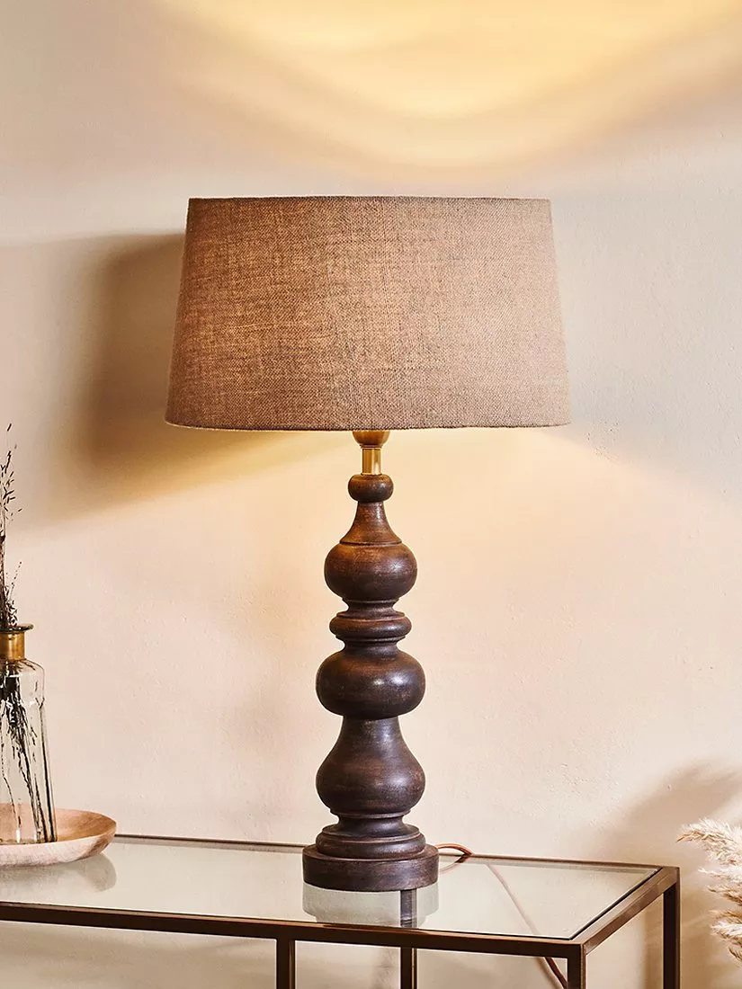 Manua is a classic and sophisticated table lamp base, handcrafted in India from mango wood using traditional wood turning methods. Its elegant curves and warm, dark palette give it a timeless quality which looks particularly stylish placed on a sideboard or console table. The lamp is finished with metal fittings in rich shades of antique brass, completing the luxurious look and feel. Style with a nkuku medium lampshade.