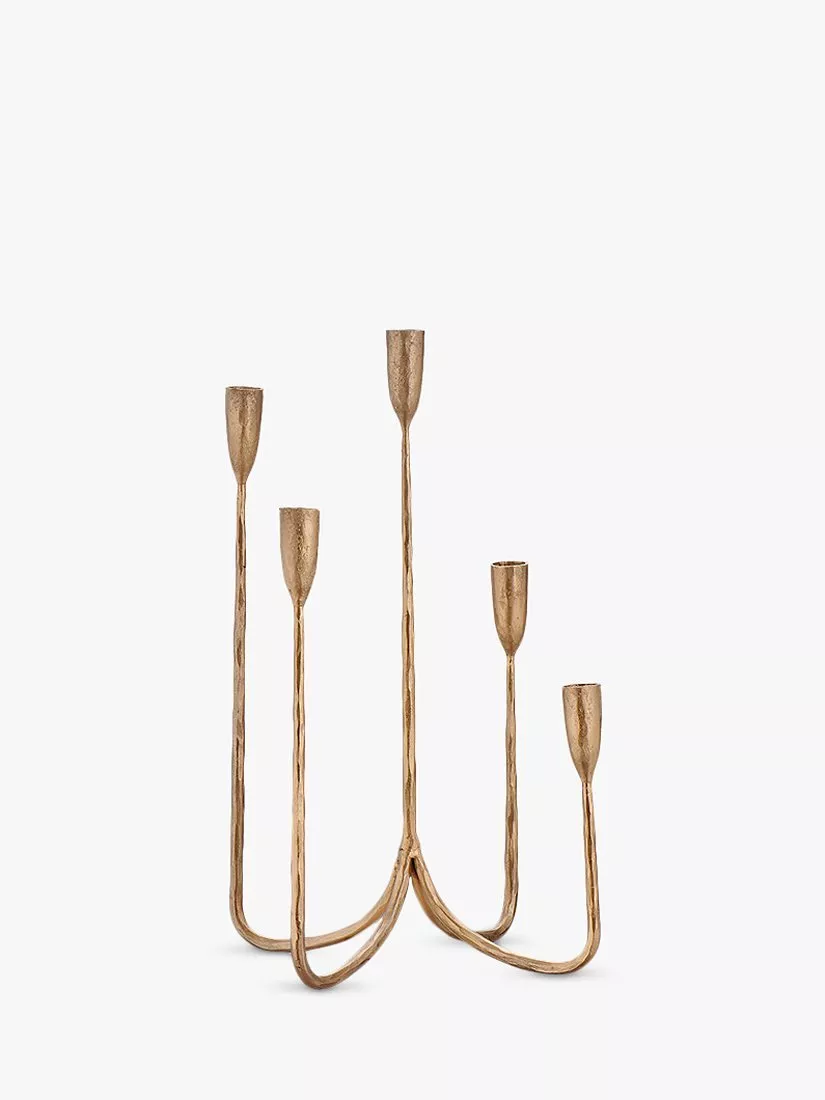 The Mbata cluster candelabra has a discerning design that is ideal as table centre piece or sideboard feature. Hand forged from iron and finished in an elegant aged brass tone; the five candles holders are positioned at varying heights.